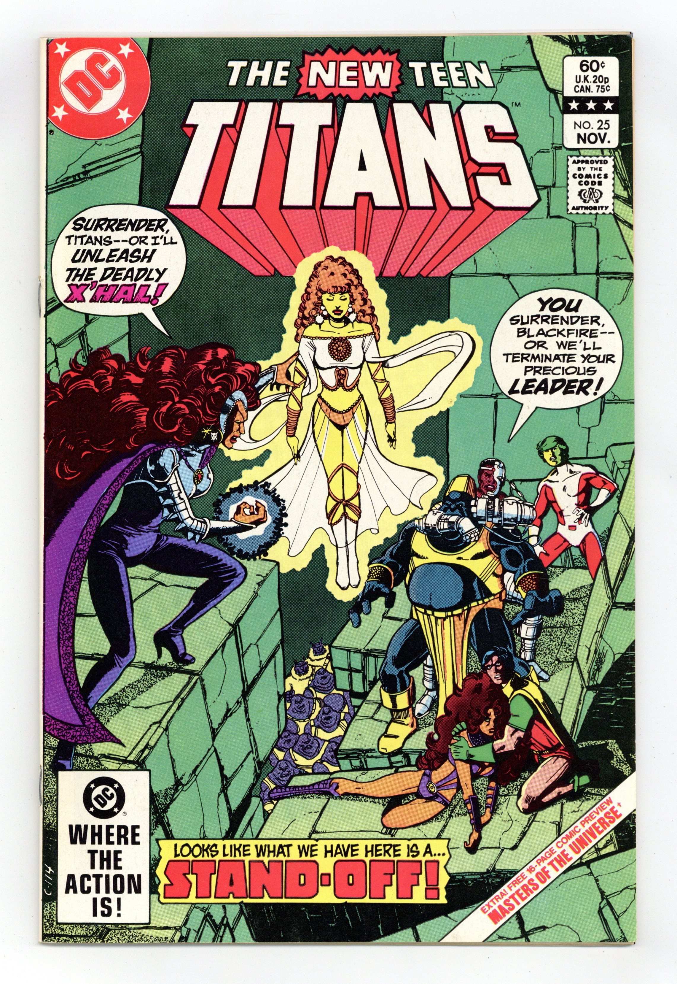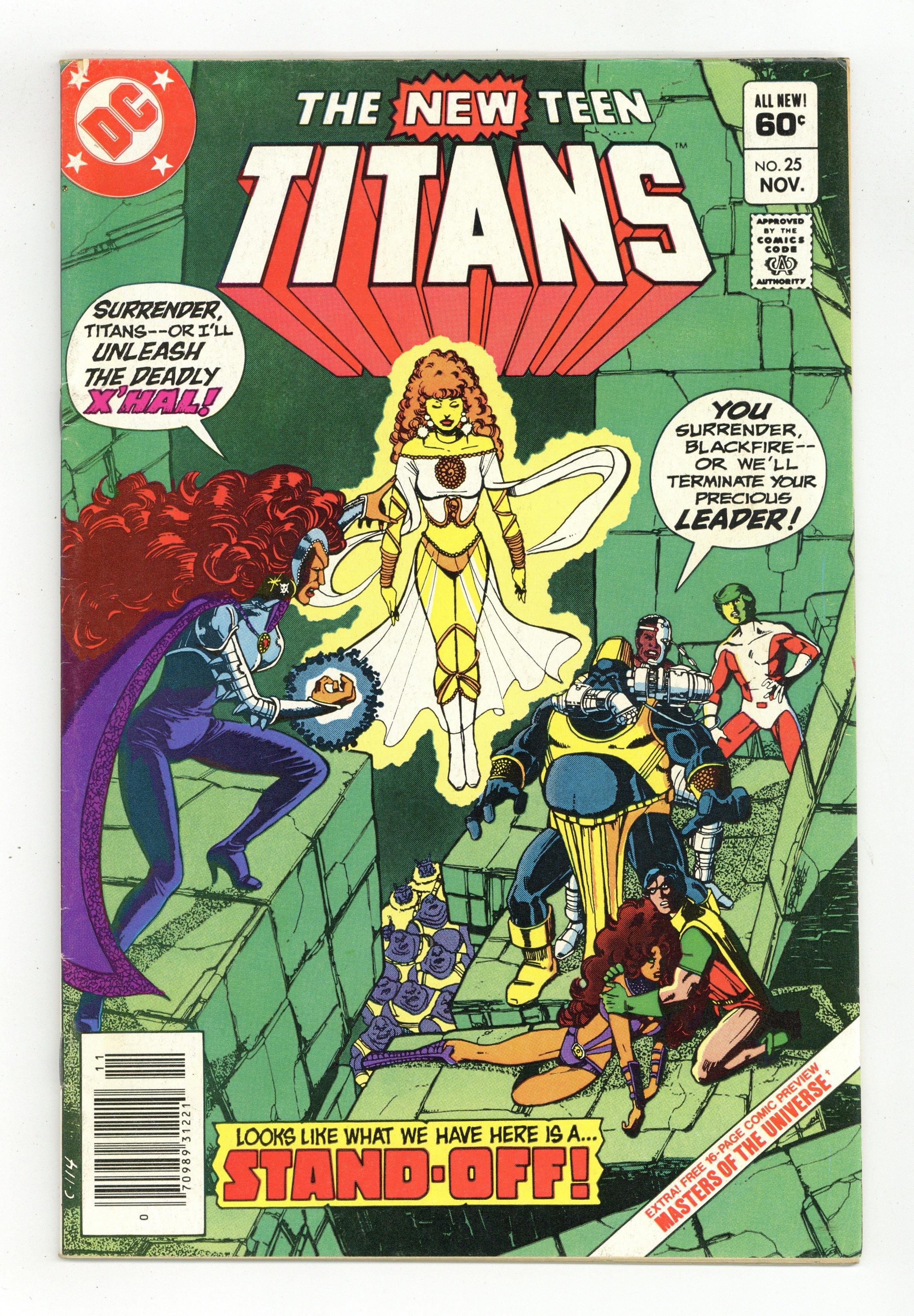 Direct Edition. As war rages on Okaara, Robin, Cyborg and Changeling mount a rescue mission on the Citadel homeworld in "War!" Part 3 of 4, continued from the previous issue. Story continues in New Teen Titans (1980-1988) Annual #1. Script by Marv Wolfman, pencils by George Perez, inks by Romeo Tanghal. Bonus 15-page insert: Masters Of The Universe (guest-starring Superman) in "Fate is the Killer" by Paul Kupperberg, Curt Swan and Dave Hunt. Perez cover. Cover price $0.60.