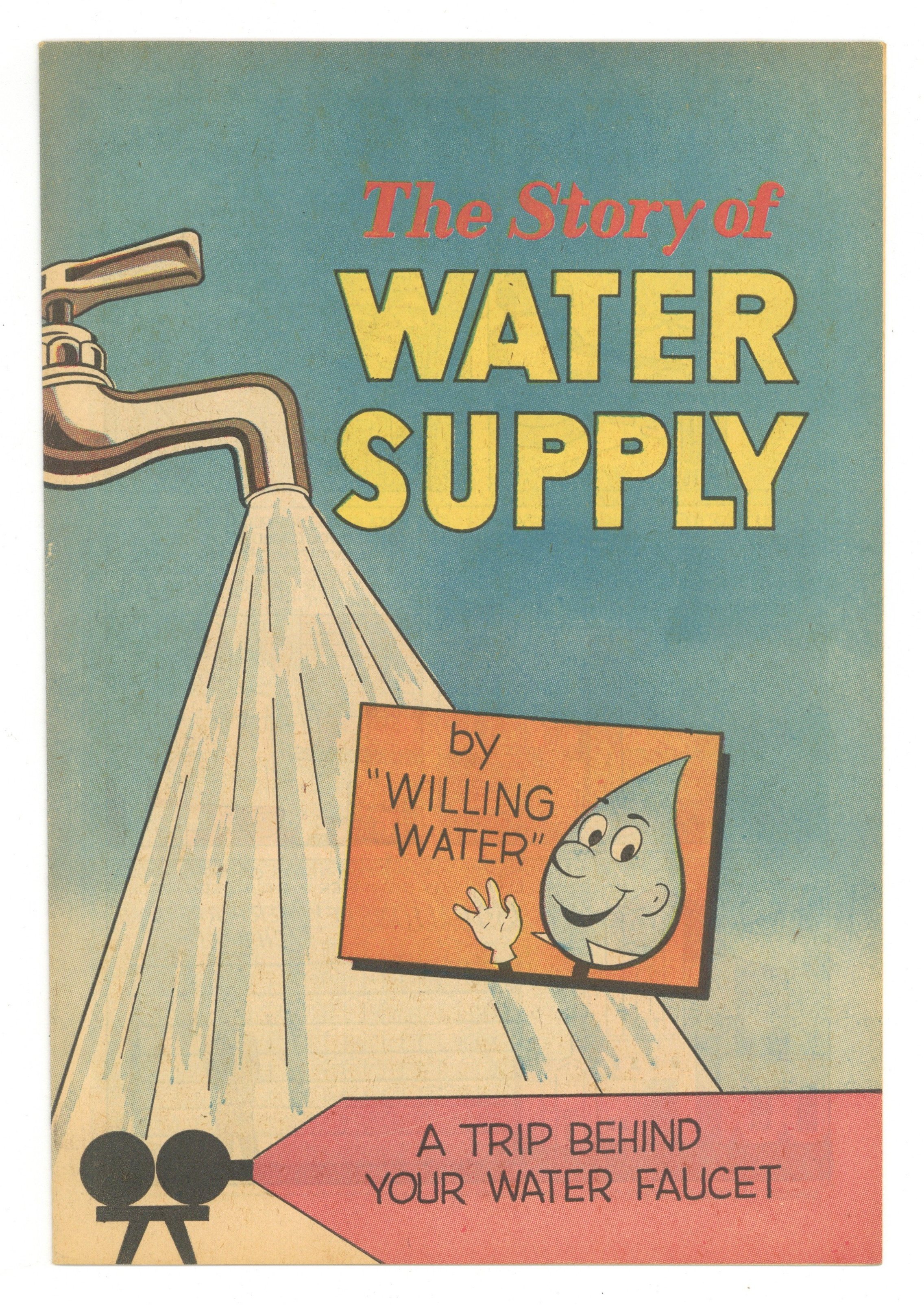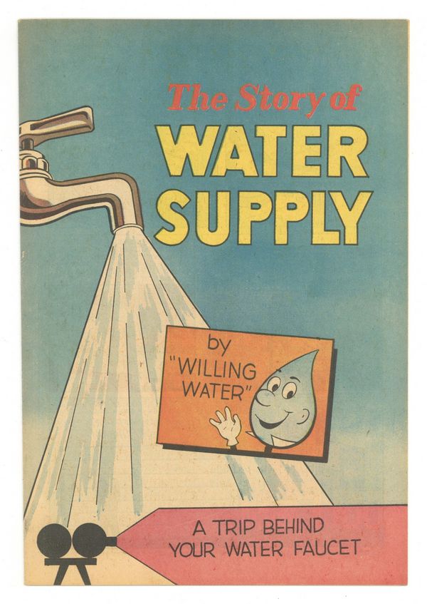 Published 1966 by American Water Works Assn.$15.00The Story of Water Supply, a Trip behind Your Water Faucet (1966) is a promotional comic distributed by the American Water Works Association, Inc. Story narrated by Willing Water. This cheery little drop of water shows us the history of storing water and why we do it. 16 pages, full color, all newsprint, no cover price, 7-in. x 10-in.