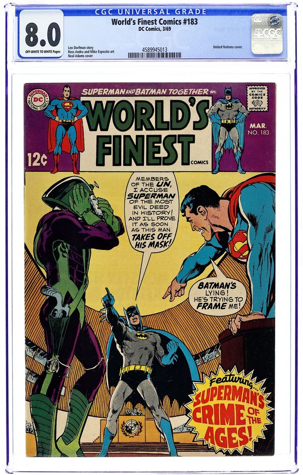 Tags: Print Run Statistics$6.70Cover art by Neal Adams. Superman's Crime of the Ages! starring Superman, Batman, Lex Luthor, and Brainiac, script by Leo Dorfman, pencils by Ross Andru, inks by Mike Esposito. The Ghost Planet--Editors' Round Table, art by Sheldon Moldoff; Two scientists return from an underground expedition to discover that everyone on Earth has become invisible. Statement of ownership--average print run 772,000; average paid circulation 480,115. 36 Pages, Full Color. Cover price $0.12.