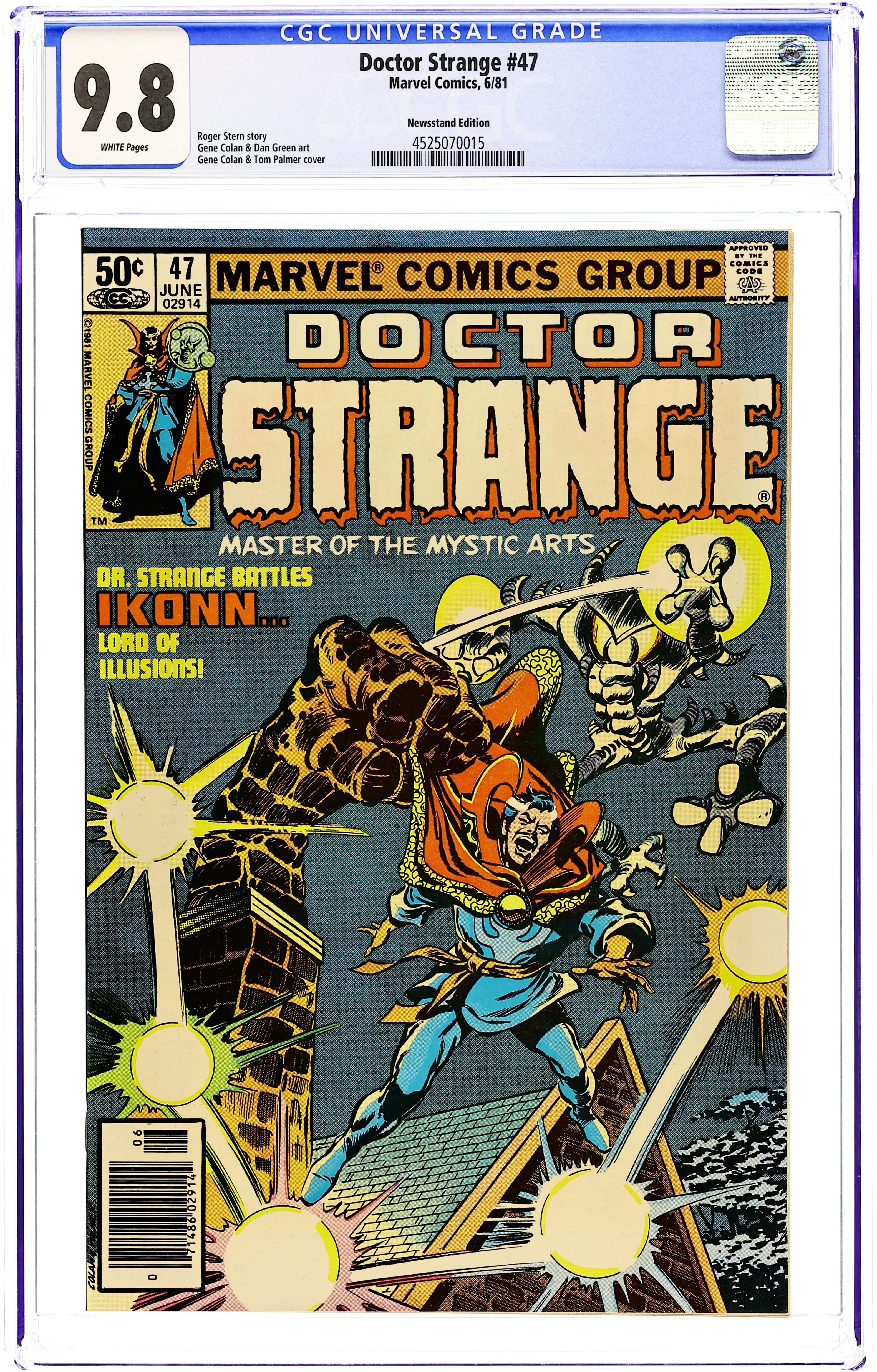 Newsstand Edition. Cover pencils by Gene Colan, inks by Tom Palmer. The Grand Illusion!, script by Roger Stern, pencils by Gene Colan, inks by Dan Green; Dr. Strange trains Clea, attacking her with mystical spells; she deflects his attack; as a reward, Strange awards gives her a magic spell book; Strange battles Ikonn, the Lord of Illusions. 36 pgs. Cover price $0.50. Cover price $0.50.