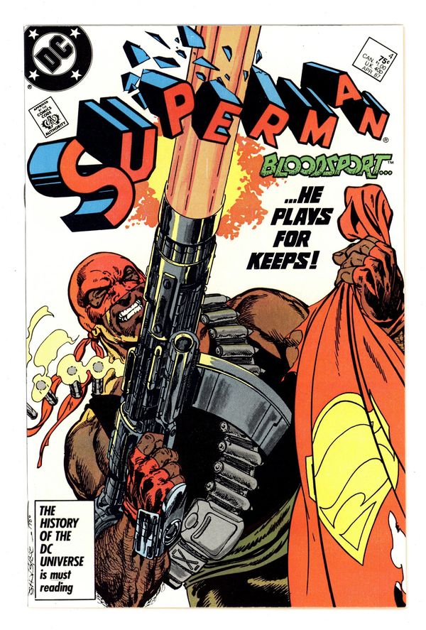 Direct Edition. "Superman's Pal, Jimmy Olsen!" Story by John Byrne. Art by John Byrne and Karl Kesel. Imagine the death and destruction a sadistic madman could cause if he were able to have any weapon he could think of appear in his hand simply by wishing it to. Well the man called Bloodsport has this ability. Can Superman stop this maniacal killer before more innocent lives are lost? Featuring Jimmy Olsen. Cover price $0.75.