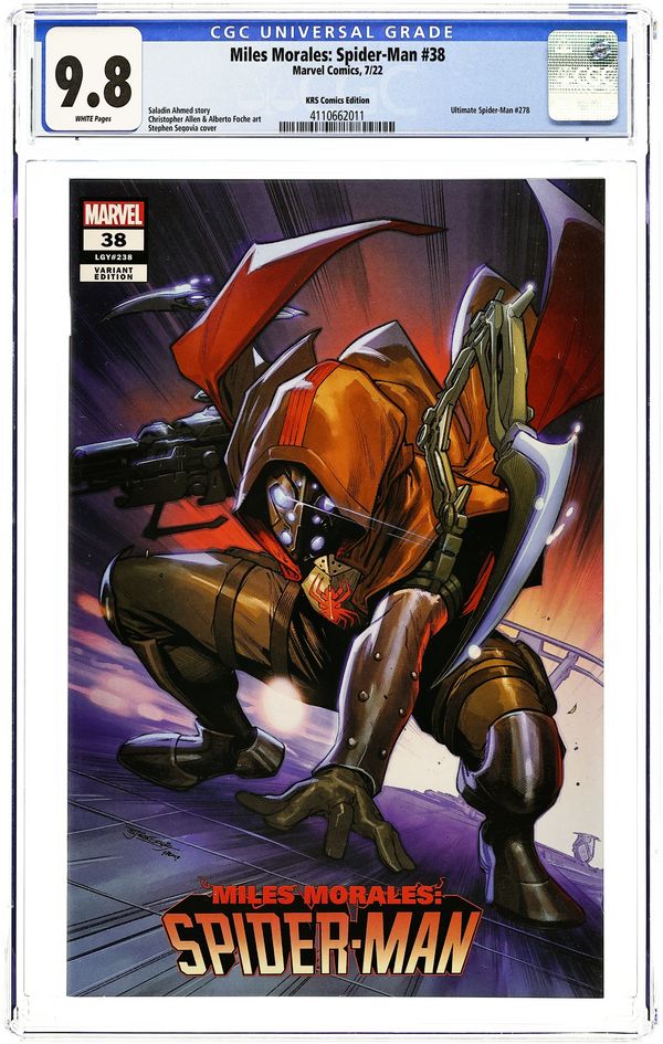 KRS Comics Exclusive Variant Cover by Stephen Segovia. Written by Saladin Ahmed. Art by Christopher Allen. NEXT STOP...THE EMPIRE OF THE SPIDER! MILES and SHIFT's hunt through the Multiverse lands them...back in Brooklyn?! It's NOT the home they know, but the EMPIRE OF THE SPIDER! A timeline where Miles' clone SELIM is victorious, and the only thing standing in the evil Spider-Man's way is a rebellion led by General GANKE and a very grown-up and extremely badass Capitán BILLIE! 28 pages, full color. Rated T