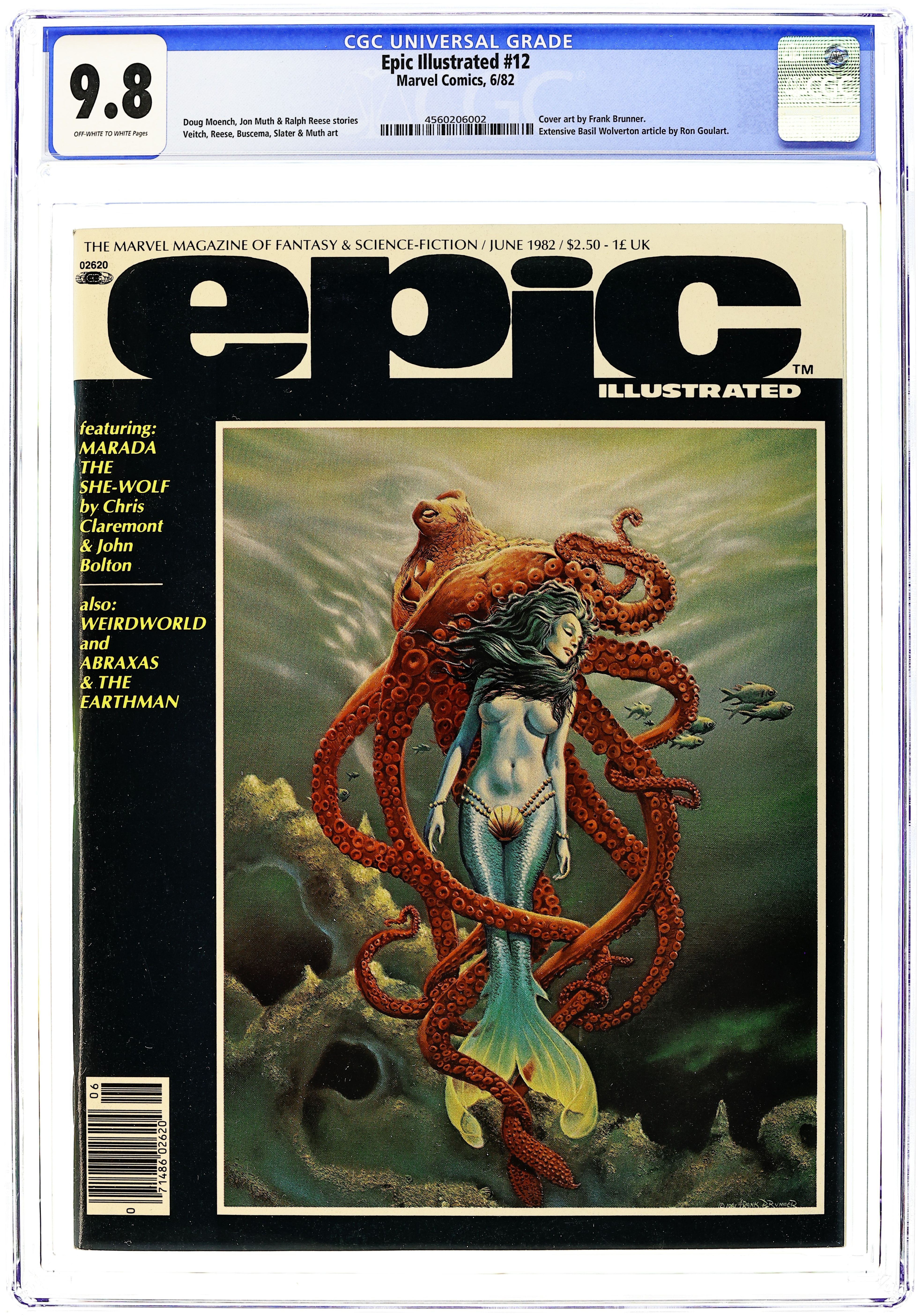 Epic Illustrated was touted as a new experience in adult fantasy and science fiction adventure. Published by Marvel Comics, this magazine was aimed at a more mature audience. Issue #12 includes: Weirdworld: The Dark Stratagem by Doug Moench, John Buscema, Marie Severin, and Steve Oliff, Small Gifts by Jon Jay Muth, Pursuit by Jon Jay Muth, Marada the She-Wolf: Royal Hunt by Chris Claremont and John Bolton, Abraxas and the Earthman: The Hunt by Rick Veitch, The Transition by Bruce Sakow and Gerald Slater, Spacehawk: The Superhuman Enemy of Crime Basil Wolverton and Rick Veitch, Cabin Fever by Ralph Reese, and To Slay a Dragon by Zoran Vanjaka. Also includes Basil Wolverton article. Cover art by Frank Brunner. June 1982. Cover price $2.50.