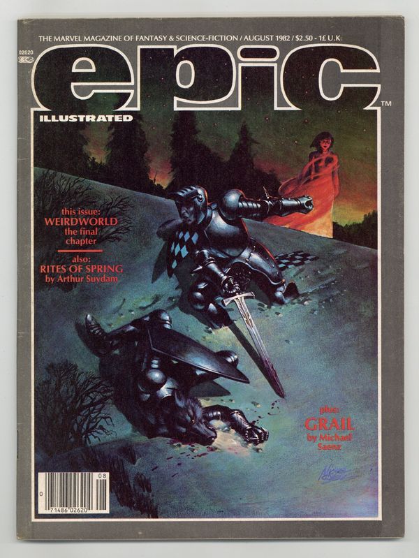 Epic Illustrated was touted as a new experience in adult fantasy and science fiction adventure. Published by Marvel Comics, this magazine was aimed at a more mature audience. Issue #13 includes: Weirdworld: Conjurations of Crystal by Doug Moench, John Buscema, Marie Severin, and Steve Oliff, In the Heart of the City by Margaret Gallagher and James Romberger, Rites of Spring by Arthur Suydam, Abraxas and the Earthman: Last Supper by Rick Veitch, Topaz by Carl Potts, Survival by Pepe Moreno, and Grail by Archie Goodwin and Mike Saenz. Also includes Bladerunner article by Archie Goodwin (with art by Al Williamson and Carlos Garzon). August 1982. Cover price $2.50.