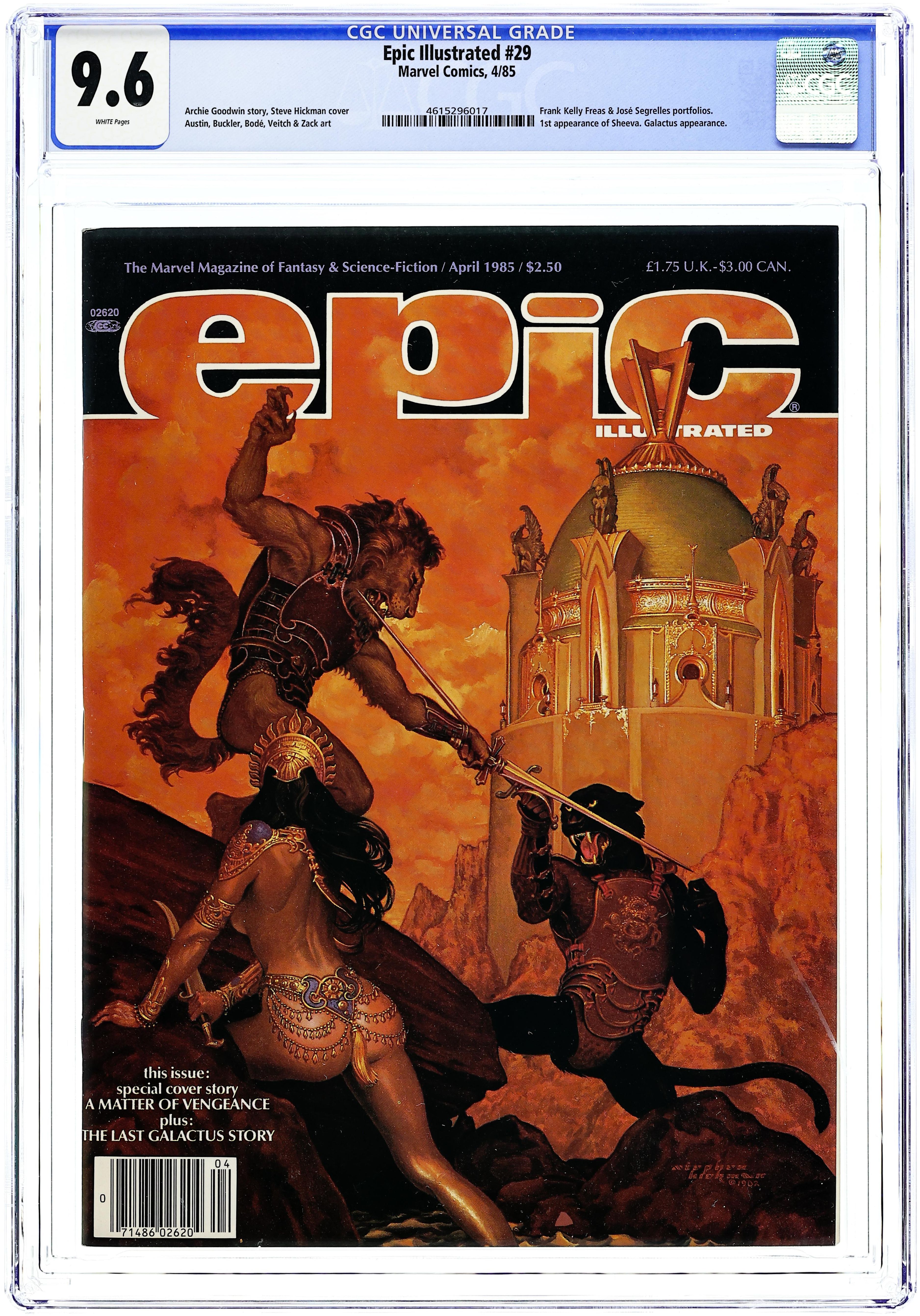 Tags: The Last Galactus Story (part 4)$14.00Cover art by Stephen Hickman. Night Run, script and art by Kent Williams. The Rhyming Robot (Chapter Four)--The Last Galactus Story, script and pencils by John Byrne, inks by Terry Austin. The Art of Jose Segrelles. Rider, script by Archie Goodwin, art by Jonn Zack. Frank Kelly Freas' A Separate Star article by Jo Duffy. Knock Knock, script and art by Phil Hale. In Search of Ancient Myths starring Dr. Watchstop, script and art by Ken Macklin. Mediaview article by Dennis O'Neil. Ghosts in the Machine, script and art by Rick Veitch. The Apes of a Cold God, script and art by Zoran Vanjaka. Cobalt- 60 story, script by Larry Todd, art by Mark Bode. A Matter of Vengeance, script by Archie Goodwin, art by Rich Buckler. Little Otis's 5 Cent Ride, script and art by John Lakey and Laura Lakey. 100 pgs. April, 1985. $2.50. Cover price $2.50.