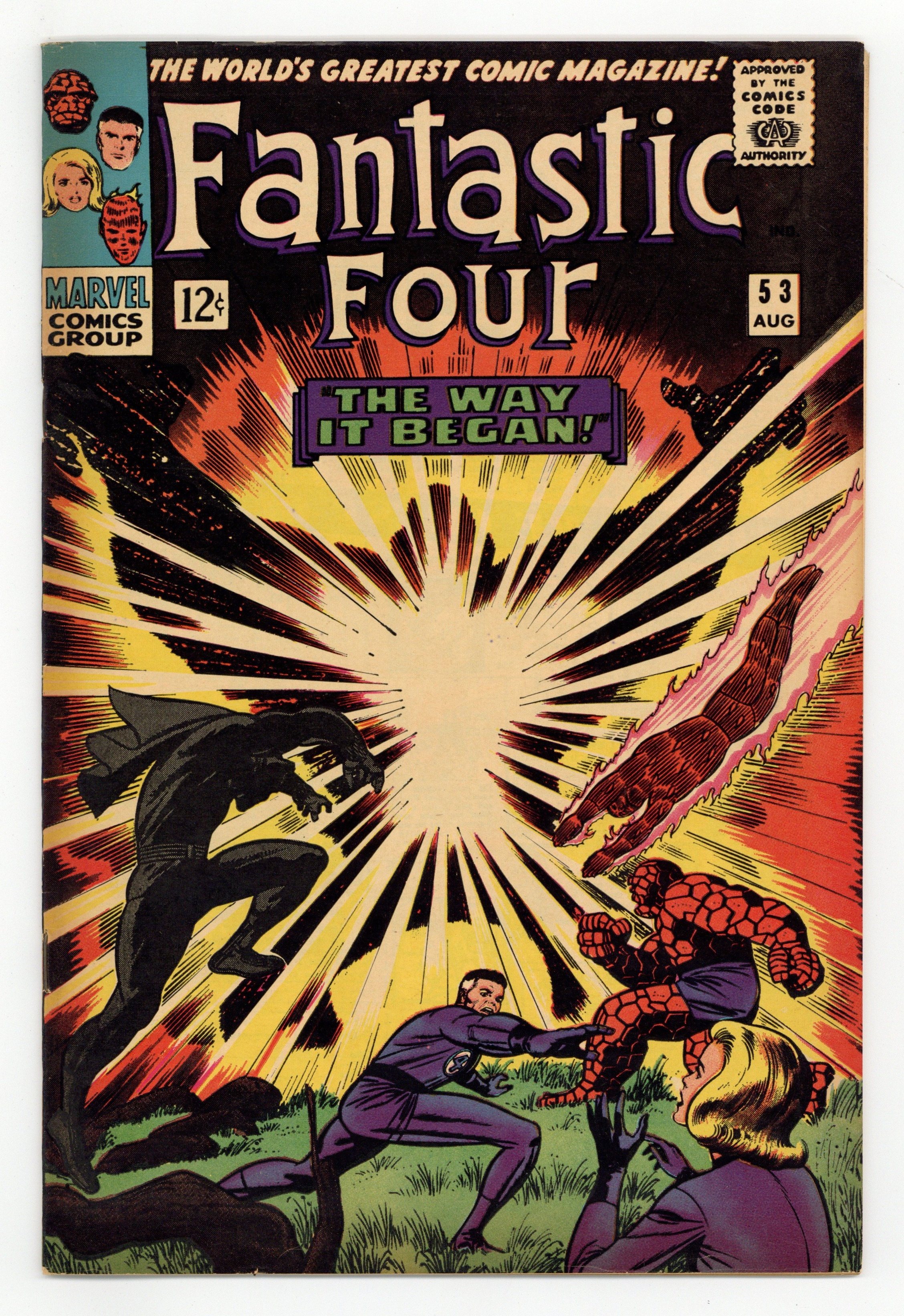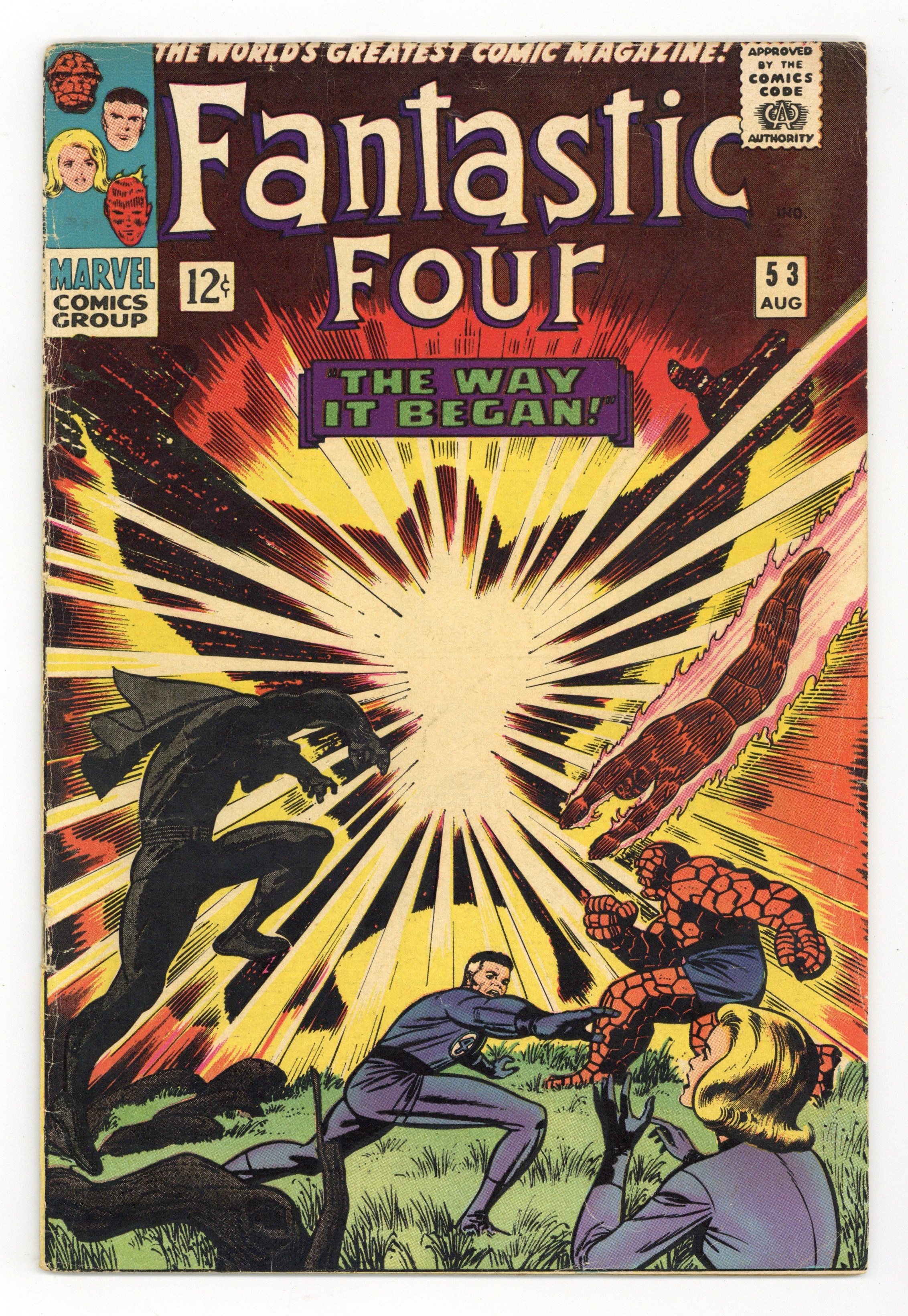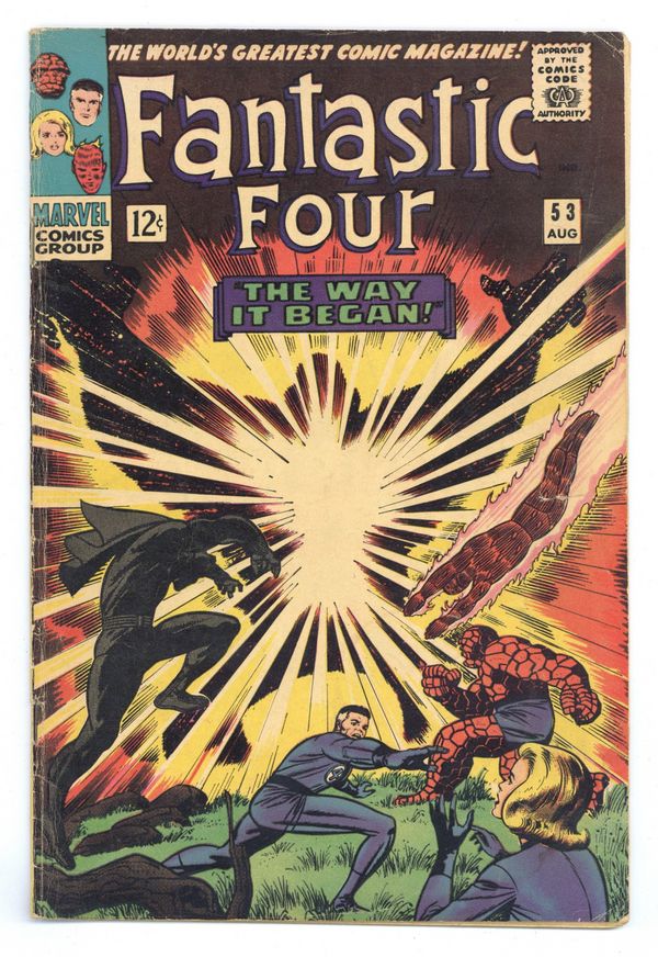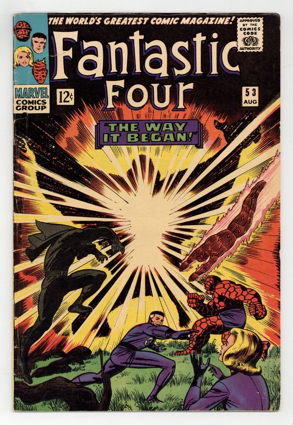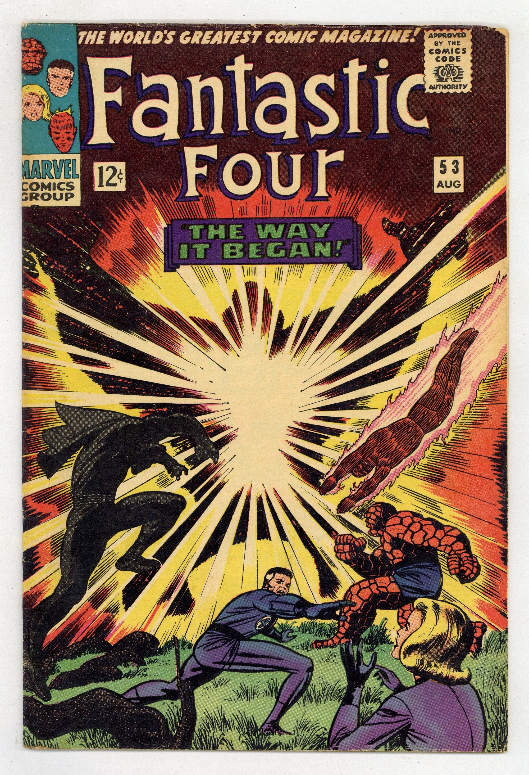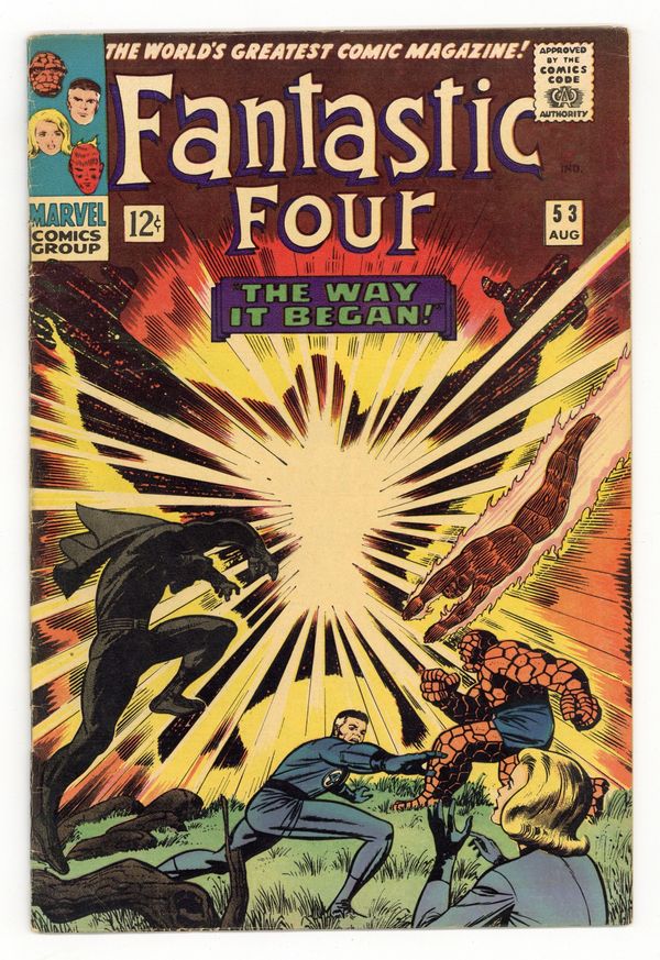 Cover pencils by Jack Kirby, inks by Joe Sinnott. Second appearance of the Black Panther in The Way It Began..!, script by Stan Lee, pencils by Jack Kirby, inks by Joe Sinnott; The Black Panther tells the story of Klaw's first attack on Wakanda; Klaw attacks the Black Panther and the FF. First appearance of Klaw, T'Chaka, and vibranium. Letter to the editor from comics writer Dennis O'Neil. 36 pgs. $0.12. Cover price $0.12.