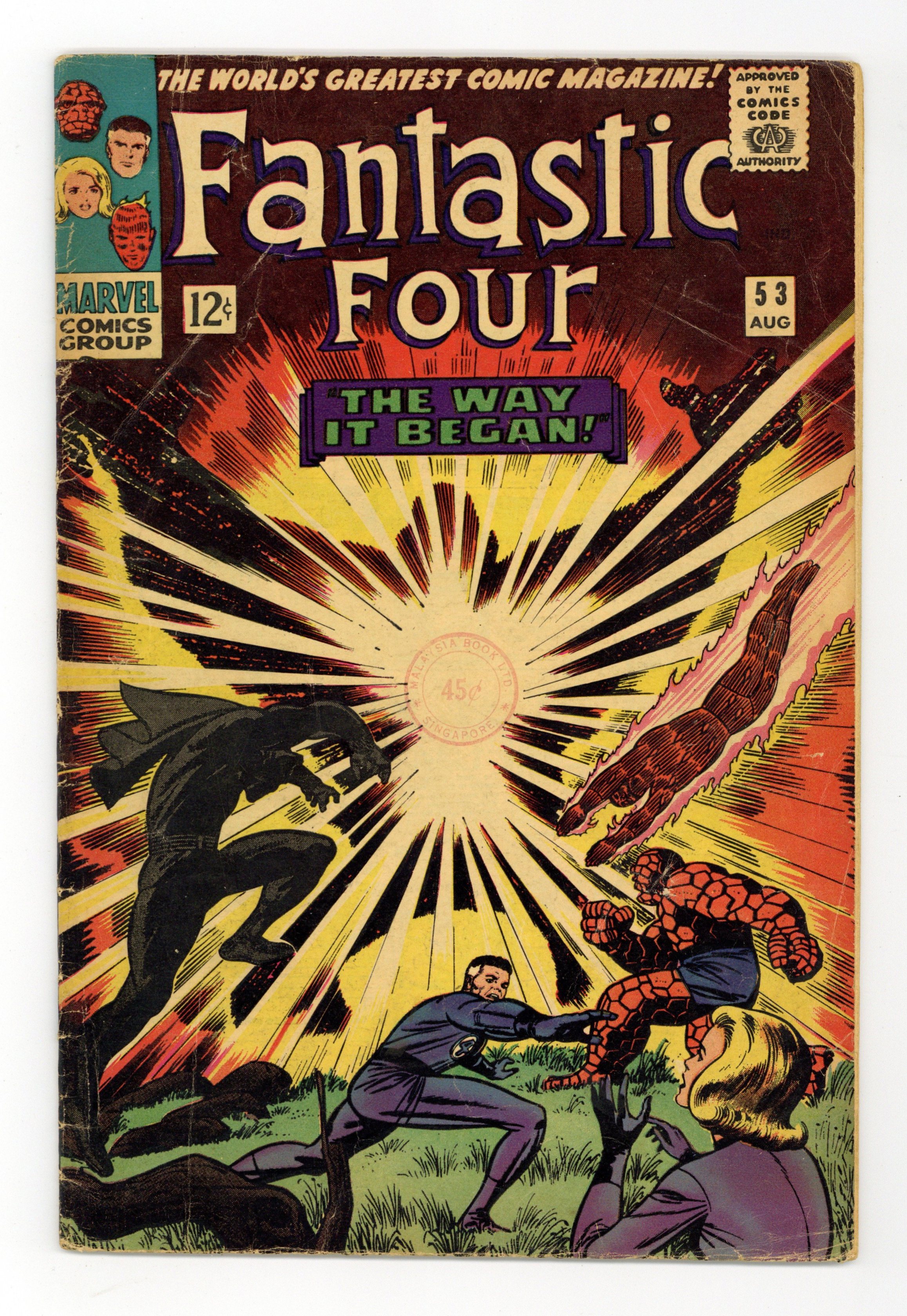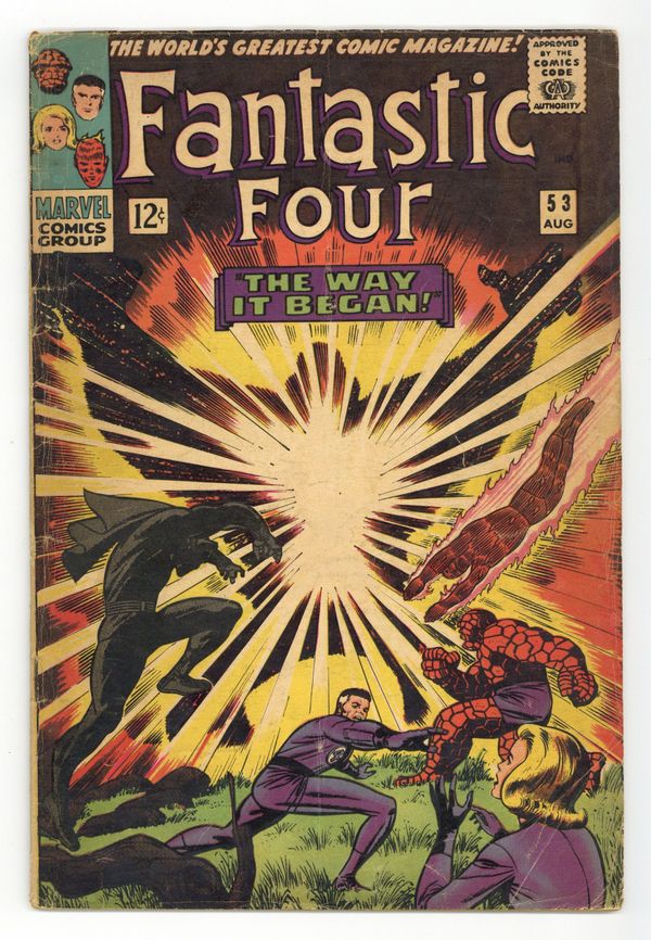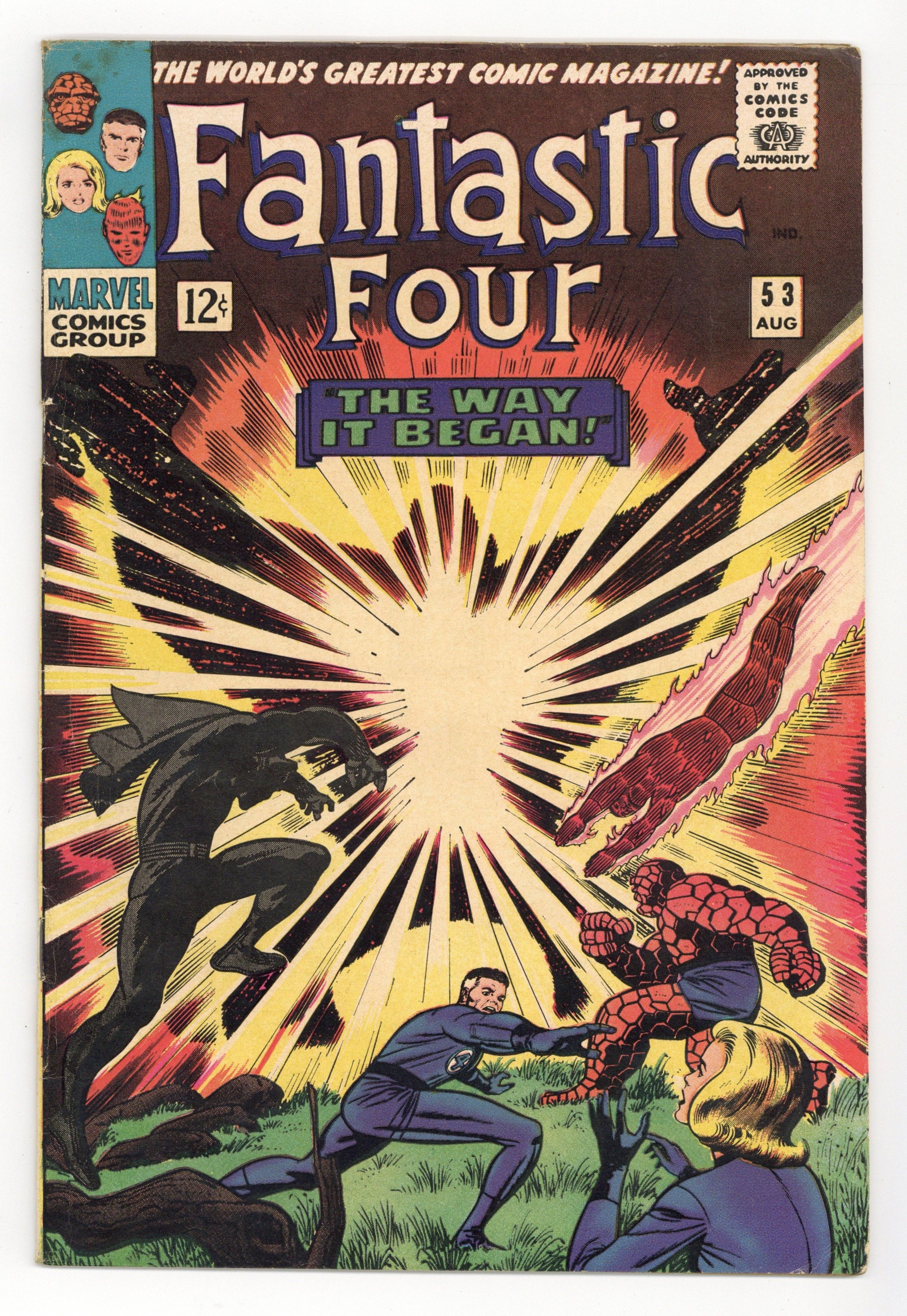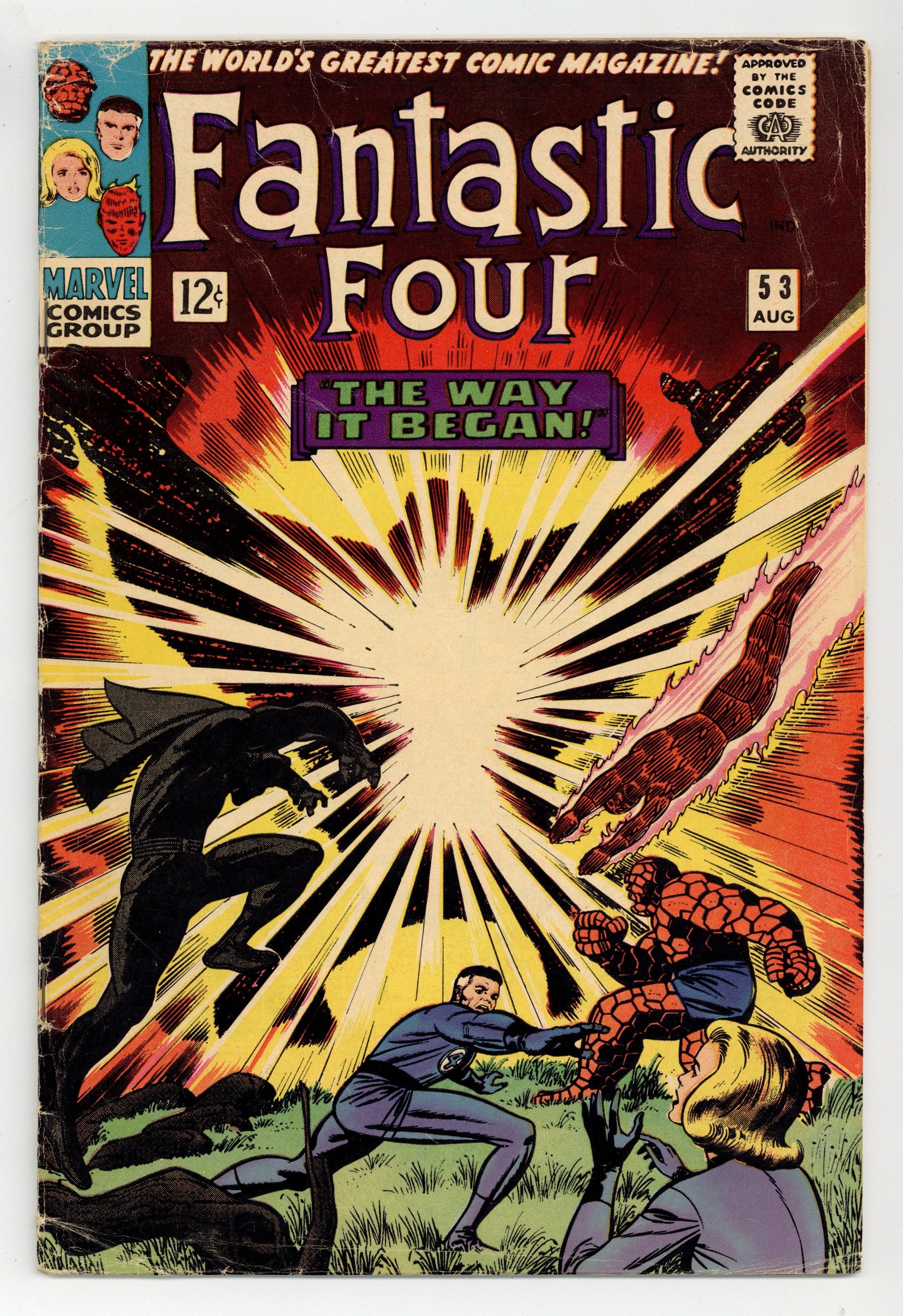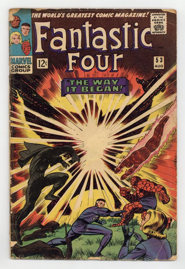 Cover pencils by Jack Kirby, inks by Joe Sinnott. Second appearance of the Black Panther in The Way It Began..!, script by Stan Lee, pencils by Jack Kirby, inks by Joe Sinnott; The Black Panther tells the story of Klaw's first attack on Wakanda; Klaw attacks the Black Panther and the FF. First appearance of Klaw, T'Chaka, and vibranium. Letter to the editor from comics writer Dennis O'Neil. 36 pgs. $0.12. Cover price $0.12.
