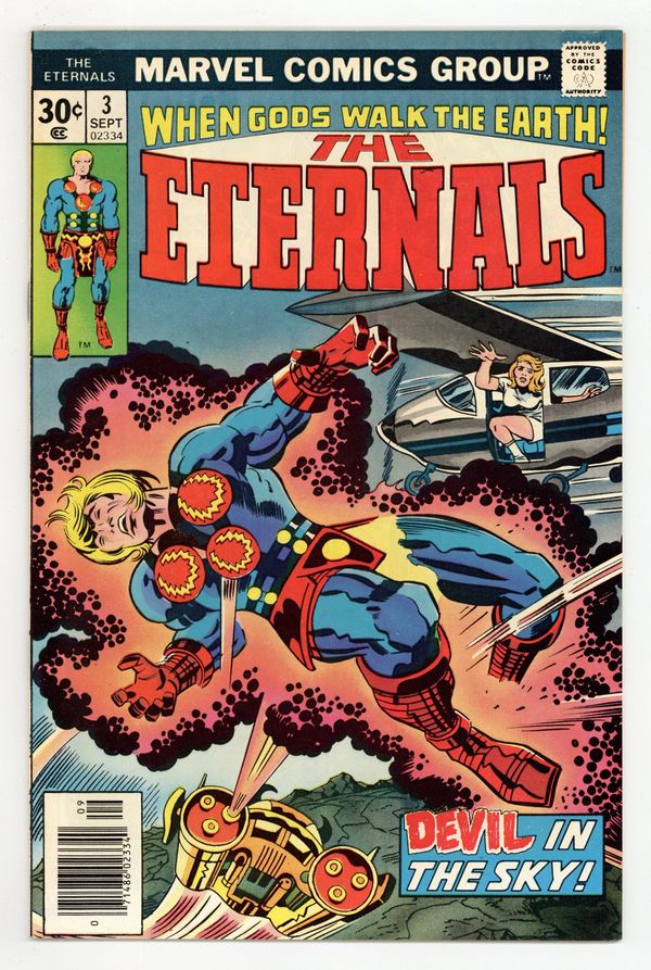 Starts Apr 4 "The Devil in New York!" Written by Jack Kirby. Pencils by Jack Kirby. Inks by John Verpoorten. The hidden chapters in the history of man are quickly being revealed. The Celestials have returned! Untouched for thousand years, a large crypt in an Incan ruin has discharged a living flight crew. As Margo's head spins from all the fantastic sights she has seen, sights no mortal before has seen, Ikaris introduces her to the fabulous Eternal beauty known as Sersi. Meanwhile, if the gods haves returned, can the monsters be far behind. The beastly Deviants, the sworn enemy of the Eternals and mankind, prepare to attack! Notes: 1st appearance of Sersi. Letter to the editor from comics writer Ralph Macchio. Cover price $0.30.
