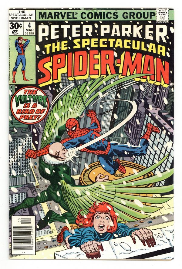 Tags: Marvel Legacy Numbering: Spectacular Spider-Man (part 4), Spider-Man$26.00"The Vulture is a Bird of Prey! Part 1 of 2. Script by Archie Goodwin. Pencils by Sal Buscema. Inks by Mike Esposito. It's the long-awaited return of the Vulture! And the old villain is still craving revenge against Spider-Man! The Vulture perches several hostages on top of a skyscraper and dares the web-slinger to rescue them. The wall-crawler and the Vulture are in the middle of another classic battle, when suddenly the duo is interrupted by...the Hitman! First appearance of the Hitman. (Notes: The Vulture previously appeared in Amazing Spider-Man 64. The red-haired woman on the cover is not Mary Jane Watson.) 32 pages Cover price $0.30.