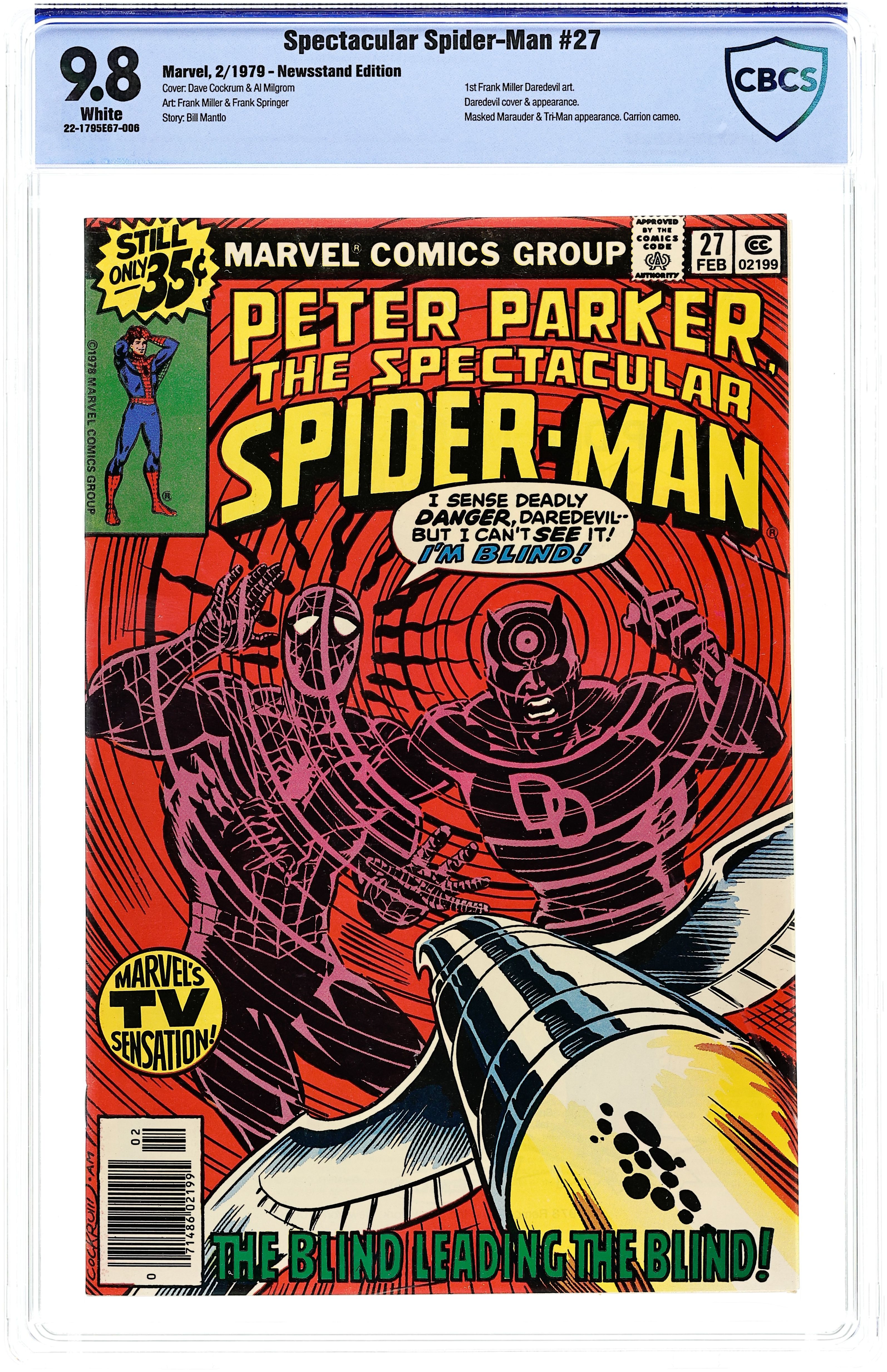 1st Printing. "The Blind Leading The Blind" Guest-starring Daredevil. Script by Bill Mantlo. Pencils by Frank Miller (1st work on Daredevil). Inks by Frank Springer. Cover by Dave Cockrum and Al Milgrom. One of the classic issues of the bronze age. Two blind super-heroes are on the trail of the Masked Marauder and the Tri-Man! Can Daredevil lead Spider-Man to the secret lair of the Maggia? The Man Without Fear and the web-slinger must hurry, because the Masked Marauder is set to launch his atomic bombdroid to destroy the city! Cameo appearances by Mary Jane Watson and Carrion. (Notes: This issue includes a one-page retelling of Daredevil's origin. This issue was reprinted in 1984 in Spider-Man and Daredevil 1, in 1993 through JC Penney Catalog identifiable by having the words "The Amazing Spider-Man" printed in the UPC box, and again in 1994 in The Complete Frank Miller Spider-Man). 36 pages Cover price $0.35.
