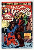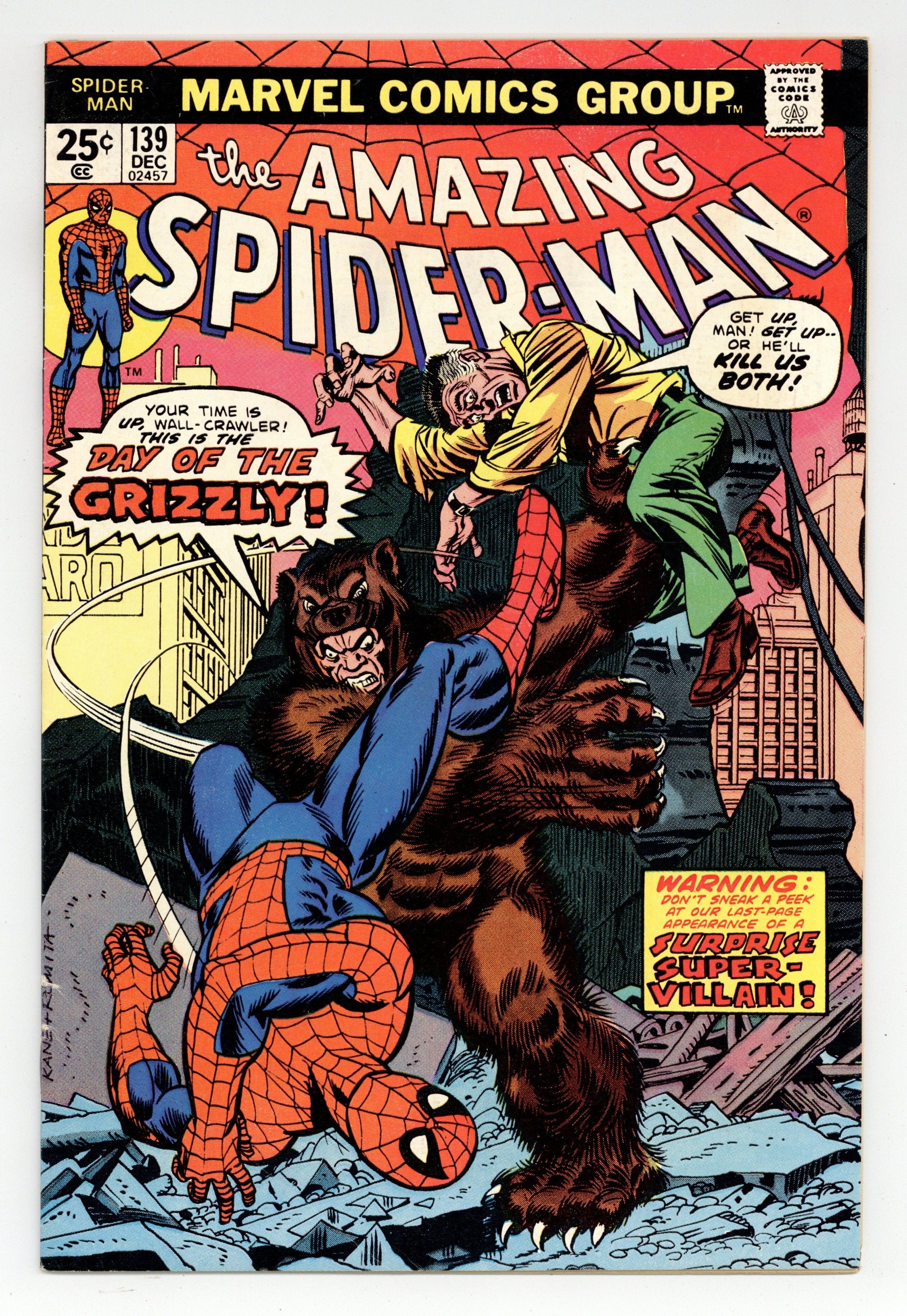 "Day of the Grizzly!" Part 1 of 2. Script by Gerry Conway. Pencils by Ross Andru. Inks by Frank Giacoia and Dave Hunt (backgrounds). Cover by Gil Kane (pencils) and John Romita Sr. (inks). Peter Parker finds a new place to live at 410 Chelsea Street! And when he stops by the Daily Bugle to tell his friends...the Grizzly attacks! Whoa, were did this 9-foot super-villain come from? There's no time for questions or answers as the web-slinger leaps into action! But the Grizzly is loaded for bear and then some! All the amazing one can do is save J. Jonah Jameson while the Grizzly escapes! However courtesy of the Jackal, the rematch is coming next issue! First appearance of the Grizzly. Cameo appearances by Betty Brant, Liz Allan, and Joe Robertson. (Notes: The letters page includes Marvel Value Stamp series A #42 Man-Wolf by Gil Kane and Mike Esposito. This story was reprinted in Marvel Tales 116.) 36 pages. 25c cover price. Cover price $0.25.