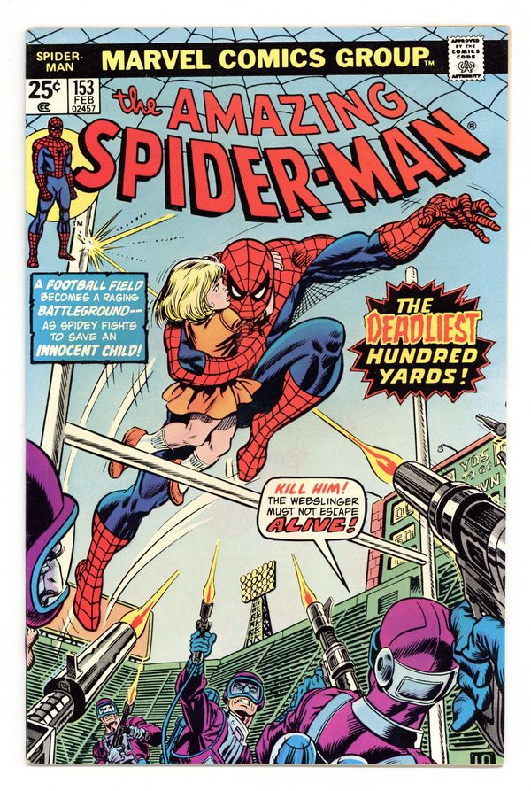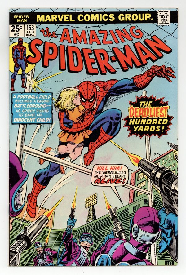 Tags: Marvel Legacy Numbering: Amazing Spider-Man (part 153), Spider-Man$31.50"The Longest Hundred Yards!" Script by Len Wein. Pencils by Ross Andru. Inks by Mike Esposito and Dave Hunt (backgrounds). Cover by Gil Kane and John Romita. A group of criminals kidnap the young daughter of an ex-Empire State University (ESU) football star! The former jock turned scientist has developed a new crime-fighting computer that the underworld desperately wants! The dramatic exchange is set for the 50-yard line inside ESU's stadium! Will the wondrous wall-crawler come off the bench and save the day? It's 4th down and life to go! Appearances by Flash Thompson, Harry Osborn, Ned Leeds, and Mary Jane Watson. (Notes: The letters page features an article by assistant editor Roger Slifer explaining (or explaining away) the discrepancies in the Jackal storyline. This issue includes a full-page ad for Hostess Twinkies featuring Peter Parker and Aunt May. This story was reprinted in Marvel Tales 130.) 36 pages. Cover price $0.25.