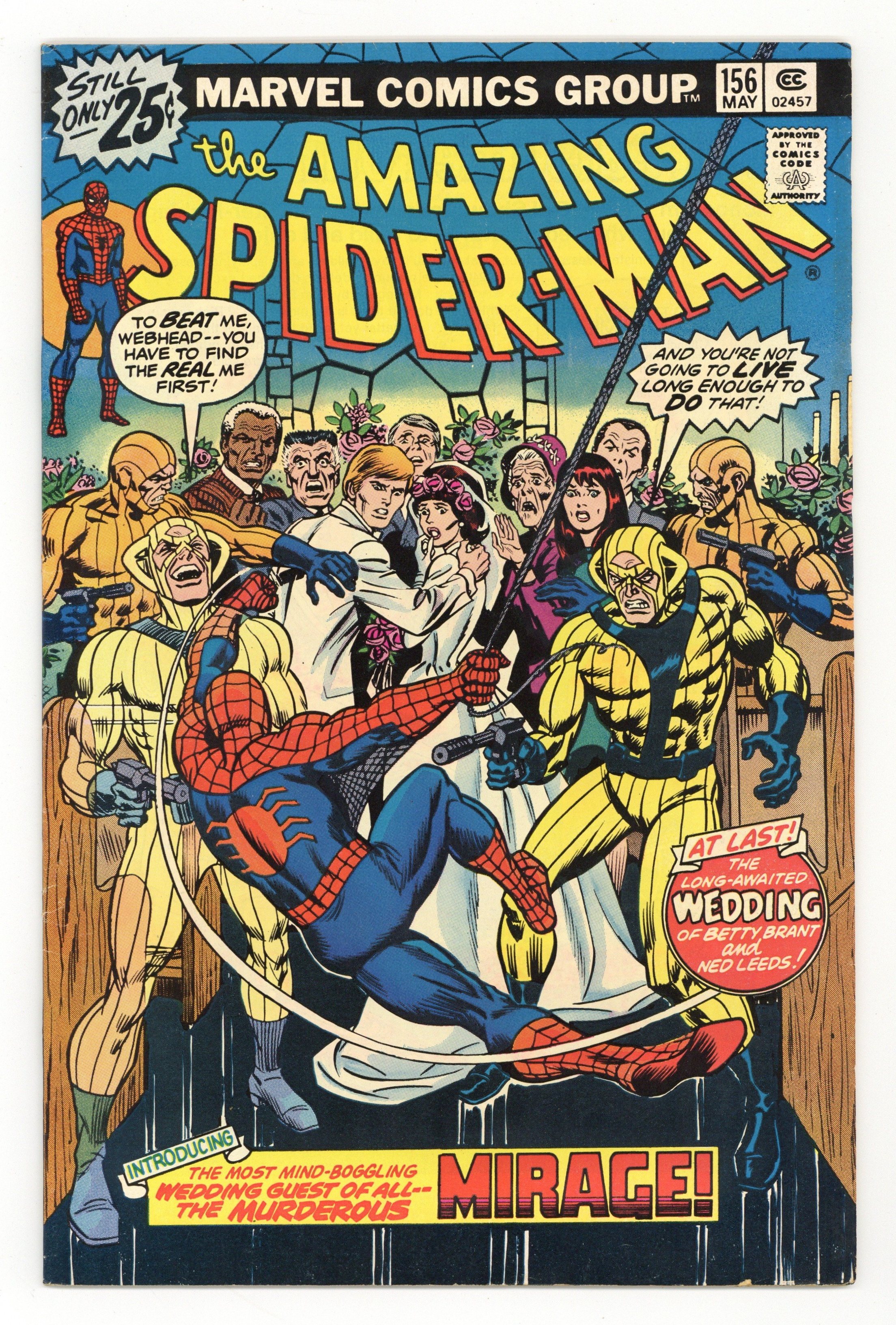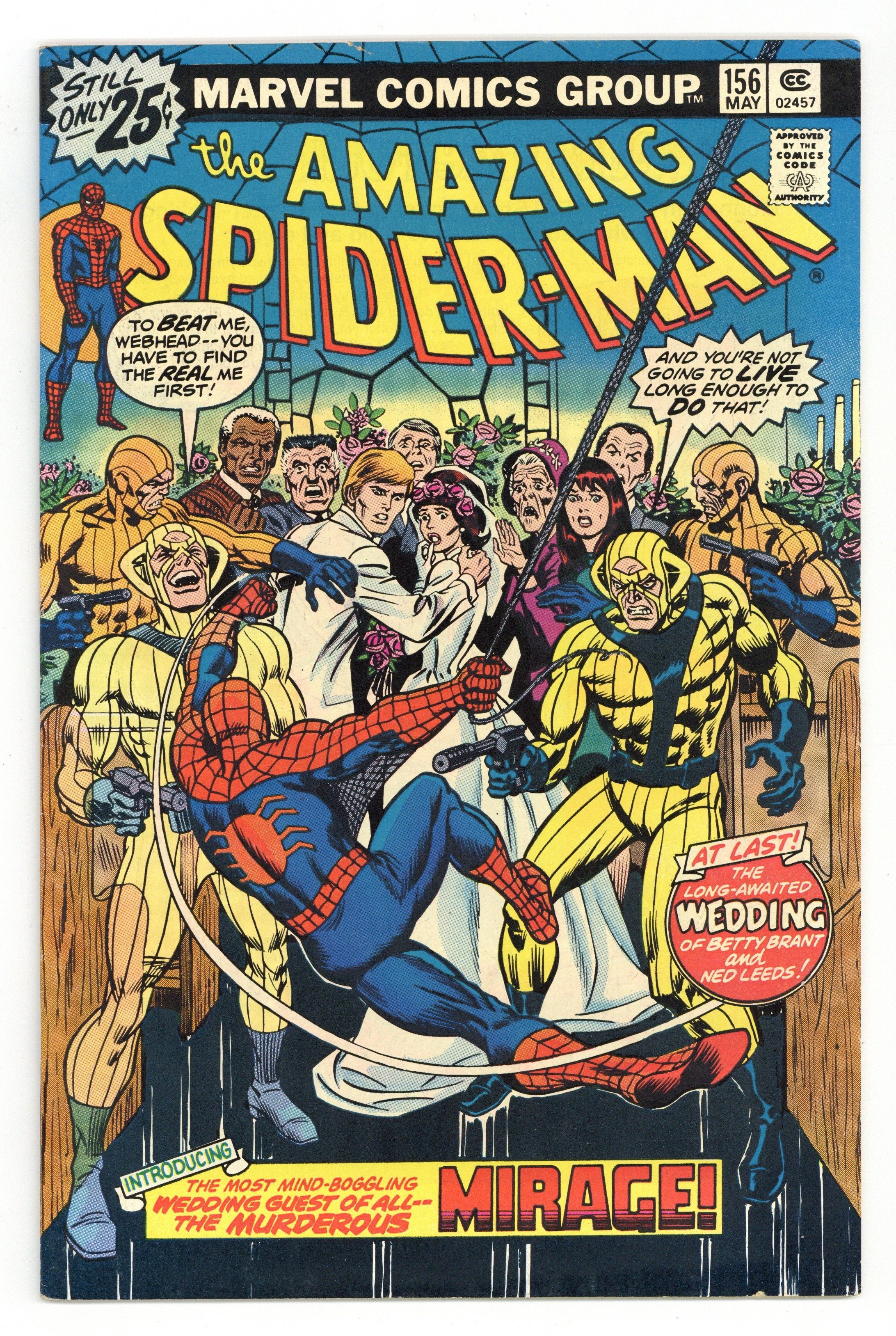 "On a Clear Day, You Can See...The Mirage!" Script by Len Wein. Pencils by Ross Andru. Inks by Mike Esposito and Dave Hunt (backgrounds). Cover by John Romita. Wedding bells ring in the pages of the Amazing Spider-Man! As Peter's former girlfriend (Betty Brant) and the web-slinger's future foe (Ned Leeds aka the Hobgoblin) tie the knot! The joyous ceremony proceeds as planned until a wedding crasher shows up! The Mirage! And he's not just looking for free hors d'oeuvres! Can the wall-crawler see through the Mirage and restore Betty and Ned's happy day? First Appearance of the Mirage. Appearances by Aunt May, Anna Watson, Mary Jane Watson, Flash Thompson, Harry Osborn, Liz Allan, J. Jonah Jameson, Joe Robertson, and Doctor Octopus. (Notes: The Mirage appears next in Marvel Two-in-One 96. The letters page includes Marvel Value Stamp series B #83 the Incredible Hulk. This story was reprinted in Marvel Tales 133. A 30-cent cover price variant exists for this issue.) 36 pages. Cover price $0.25.