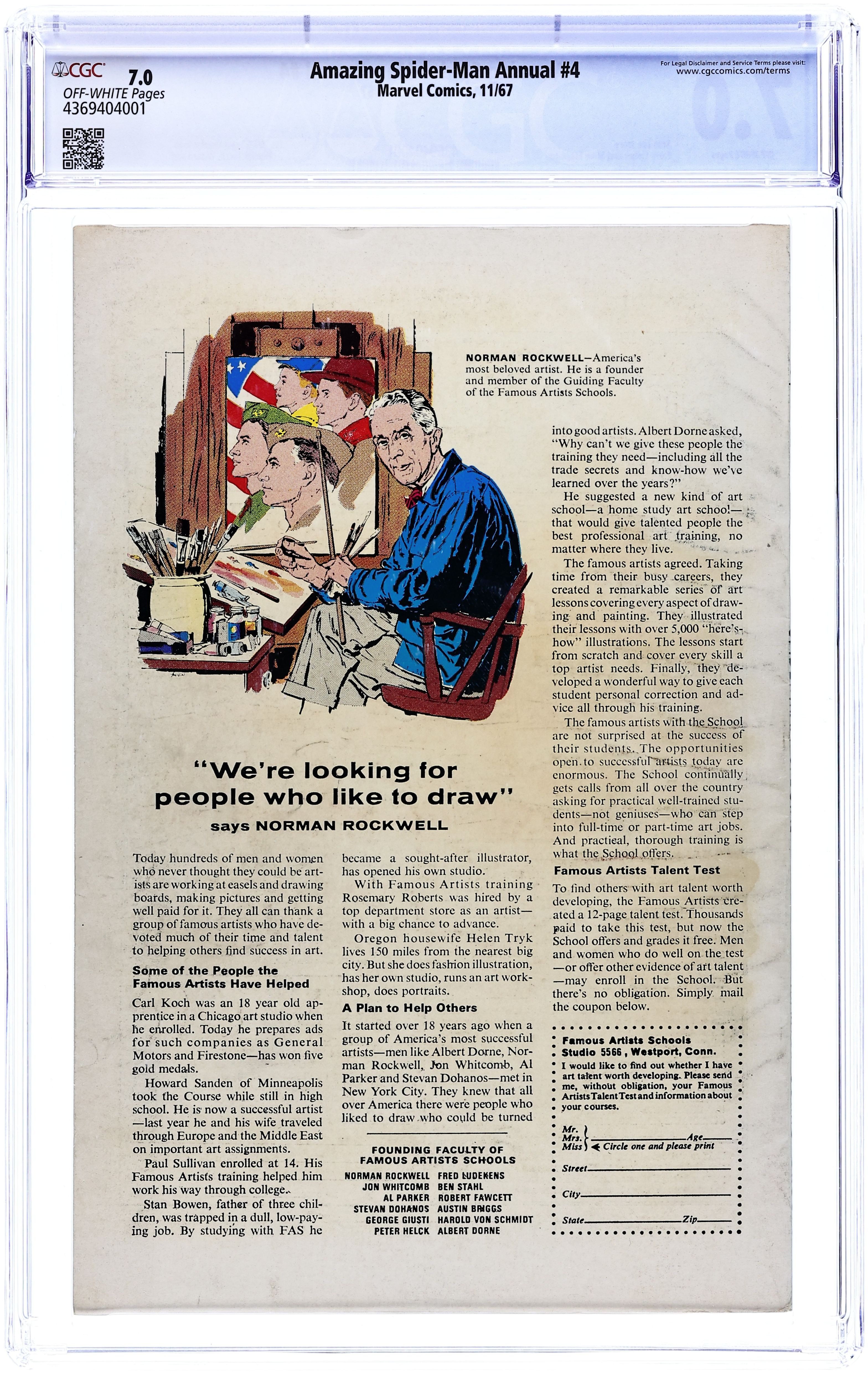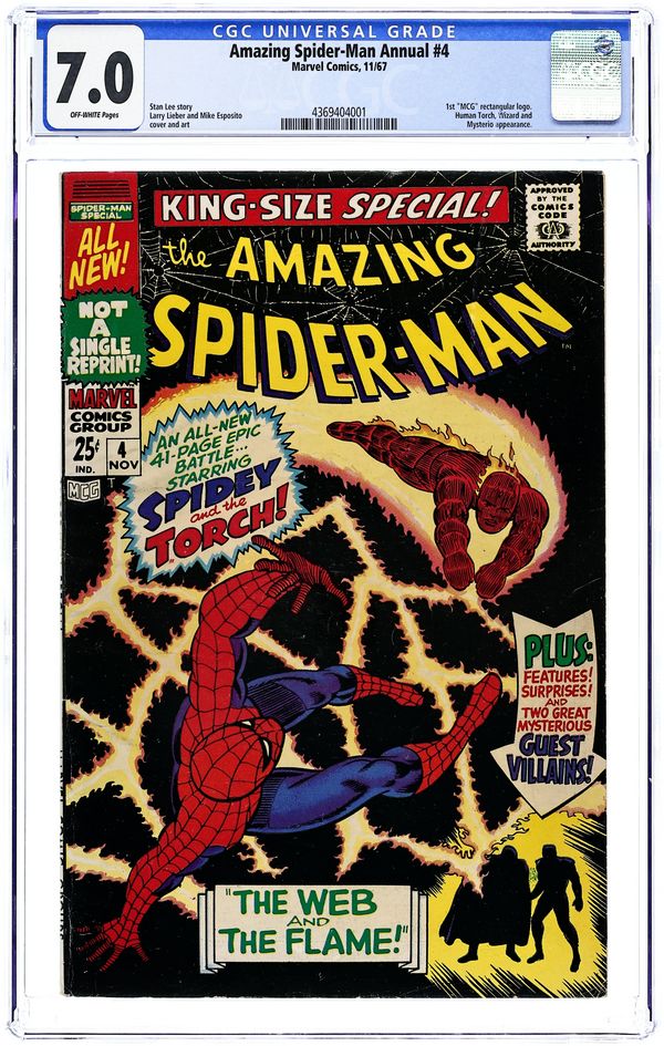 Tags: Fantastic Four, Spider-Man$19.50All-new 41-page story "The Web and the Flame!" Guest-starring the Human Torch. Script by Stan Lee. Pencils by Larry Lieber. Inks by Mike Esposito (aka Mickey Demeo) and Tony Mortellaro. Cover by Larry Lieber and Mike Esposito. The action starts with a bang as the Amazing Spider-Man spies the Human Torch running amok through the heart of Manhattan! What has gotten into Johnny Storm? The web-slinger swoops into stop the torch and discovers that the fiery member of the FF is just filming a movie! The embarrassed wall-crawler quickly departs, but an observant super-villain nearby begins to formulate a devious plan! One thing leads to another and both Spidey and the torch are invited to shoot a brand new movie in Hollywood! But the duo might want to check the identities of the director and producer first! After a mishap on the set, the temporary teammates at last find their adversaries and a giant mechanical gorilla! Roll the cameras for Spider-Man and the Human Torch vs. Mysterio and the Wizard! Cameo appearances by J. Jonah Jameson and actress Elizabeth Taylor. First backup feature: "The Coffee Bean Barn" Two-page illustration of Peter Parker and his friends. Script by Stan Lee. Pencils by Larry Lieber. Inks by Mike Esposito. Second backup feature: "What the Well-Dressed Spider-Man Will Wear" Two-page illustration of the web-slinger's costume and web-shooter. Third backup feature: "Spidey's Greatest Talent" Four-page illustration of the wall-crawler's powers. Fourth backup feature: One-page pin-up of Spider-Man with the Thing, Thor, Hercules, Sub-Mariner, and the Hulk. Art by Larry Lieber, Jack Kirby, and Mike Esposito. Fifth backup feature: "Say Hello to Spidey's Favorite Foes!" Two-page illustration of eight favorite foes including Dr. Octopus and the Green Goblin. Art by Larry Lieber, John Romita, Jack Kirby, Mike Esposito, and Joe Sinnott. Sixth backup feature: "A Visit to Petey's Pad!" Two-page illustration of Peter Parker and Harry Osborn's apartment. (Notes: Mysterio battles the web-slinger again in Amazing Spider-Man 66 & 67. John Romita contributed pencils to the inside front cover splash page. This story was reprinted in Giant-Size Spider-Man 6.) 68 pages. 25 cent cover price. Cover price $0.25.