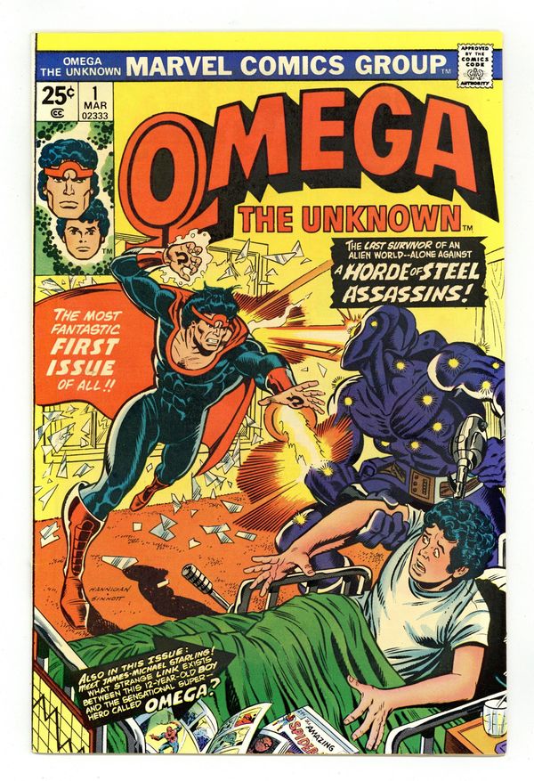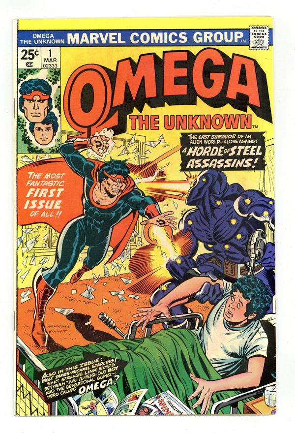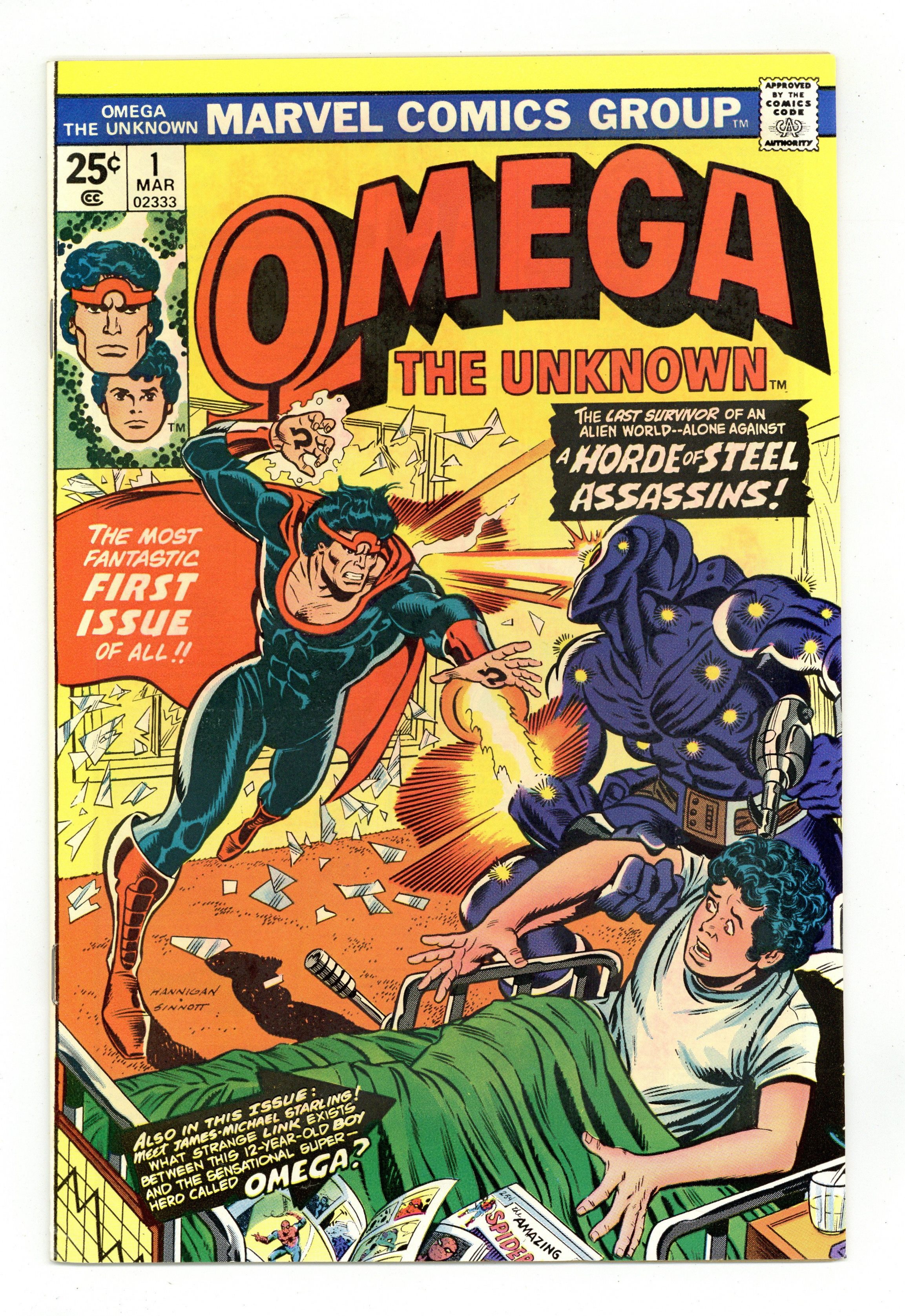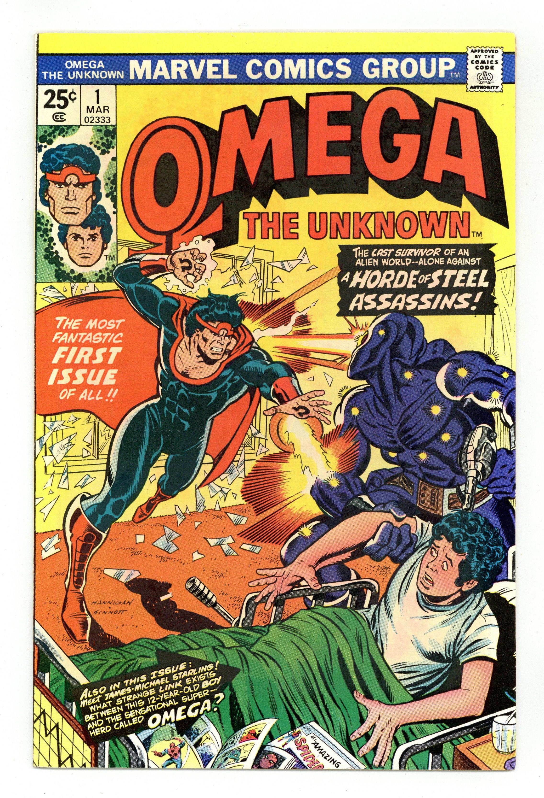 With Marvel Value Stamp. Cover by Ed Hannigan and Joe Sinnott. Omega the Unknown, script by Mary Skrenes and Steve Gerber, art by Jim Mooney; Omega the Unknown, the last survivor of an alien world, battles a horde of steel assassins; a 12-year-old boy has a mysterious link with Omega. Marvel Value Stamp. 36 pgs., full color. $0.25. Cover price $0.25.