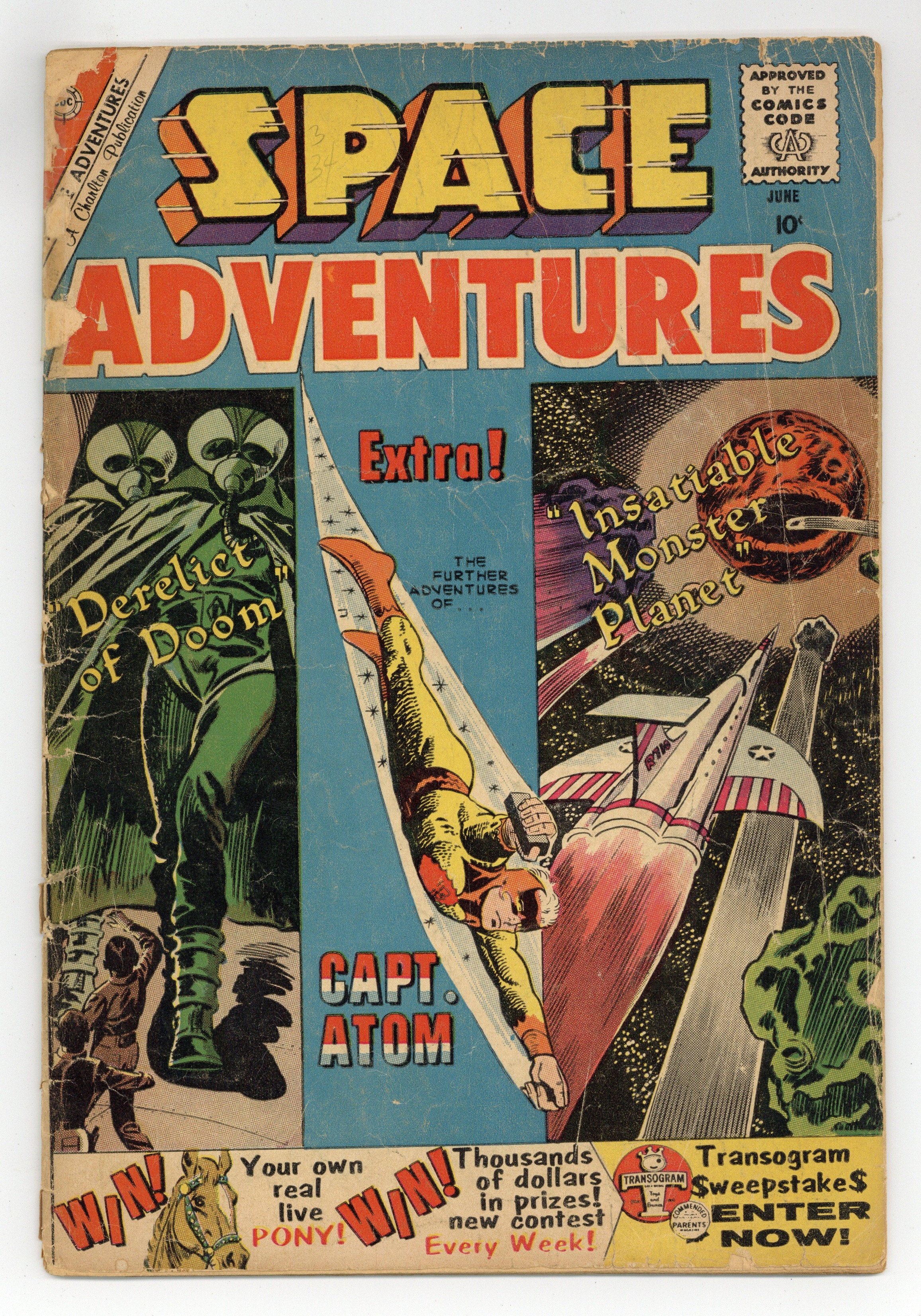 Cover by Steve Ditko. Stories and art by Steve Ditko, Bill Molno, Vince Alascia, Charles Nicholas, Sal Trapani and Joe Gill. Sci-fi and super-heroics from Charlton Comics. Captain Atom uses his new atomic powers to enter space and save the first Russian cosmonaut, in a story with early art by Spider-Man co-creator Steve Ditko. Space Patrol officers find a derelict craft that has fallen prey to a mysterious metal-devouring force, and realize too late that it has spread to their own ship. Astronauts exploring the next solar system over realize that an alien planet is alive...and it's hungry. Captain Atom: The 2nd Man in Space; Derelict of Doom; The Insatiable Monster Planet; Message from Mars. 32 pages, Full Color. Cover price $0.10.
