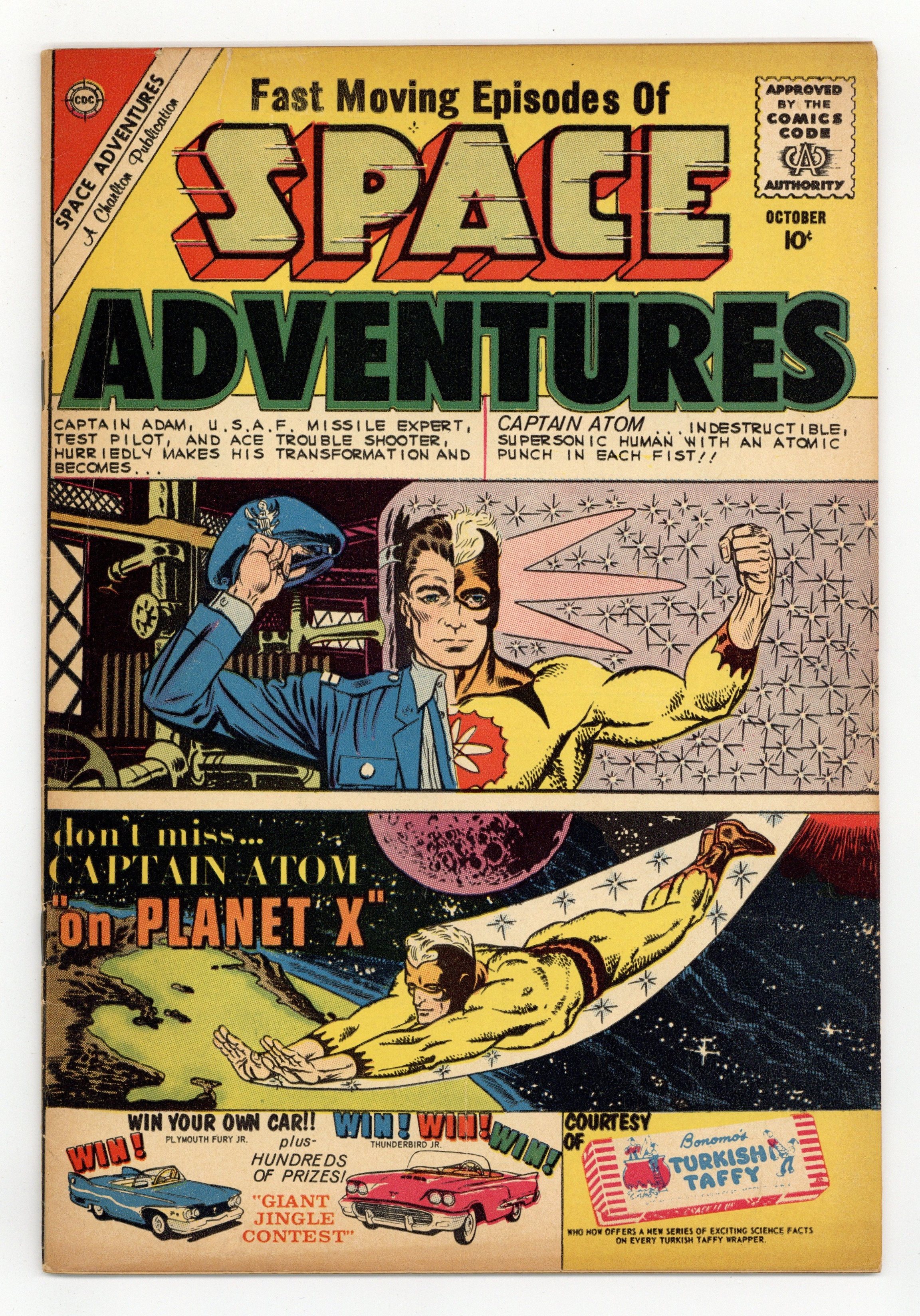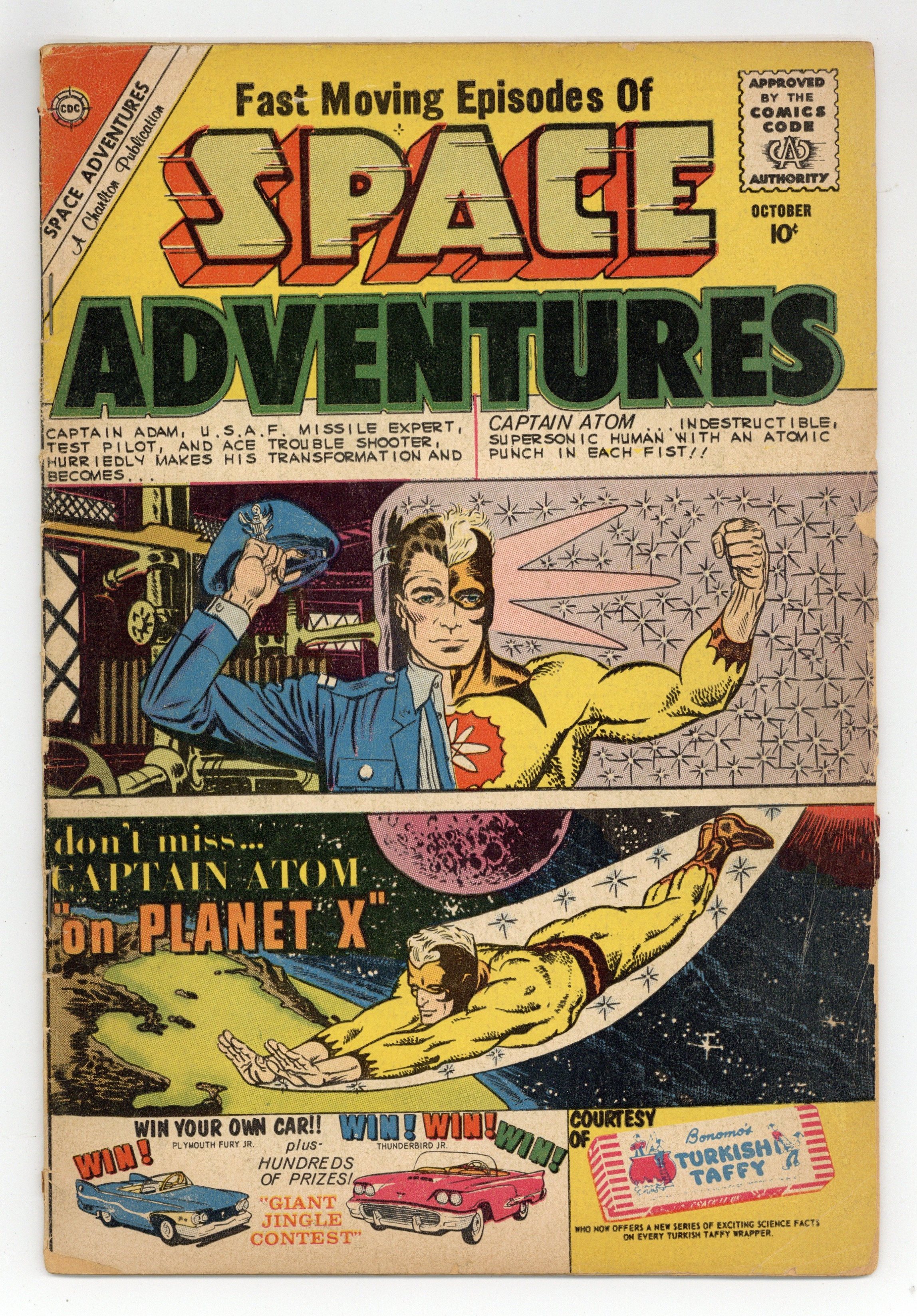 Cover art by Steve Ditko. "The Wreck of X-44," script by Joe Gill, art by Steve Ditko; The rocket-ship that Captain Atom is testing has been sabotaged. "The Galactic Souvenir," art by Rocco "Rocke" Mastroserio. "Penetro" text story. "The Omnipotent Robot," pencils by Bill Molno, inks by Vince Alascia; A scientist Siroco created Tondo, the Omnipotent robot, for space exploration; The planet where Tondo was created is not named, but a man whom Sirco calls 'Your Excellency' desires to use Tondo to explore possible worlds to invade and spread despotism. "Captain Atom On Planet X," script by Joe Gill, art by Steve Ditko; Captain Atom guards a new orbital satellite from enemy missiles. 36 pgs., full color. Cover price $0.10.