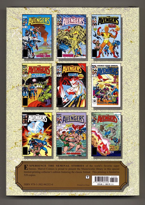 Volume 379 - 1st printing. "The Avengers: Book 25!" Collects The Avengers (1963-1996 1st Series) #255-263, The Avengers (1963-1996 1st Series) Annual #14, Avengers: Emperor Doom GN (1987 Marvel Graphic Novel), and Fantastic Four (1961-1996 1st Series) #286. Written by Roger Stern, David Michelinie, and John Byrne. Art by John Buscema, Bob Hall, John Byrne, Tom Palmer, Kyle Baker, and Terry Austin. Cover by Tom Palmer. Introduction by Roger Stern. Industry legend Roger Stern's beloved run on the Avengers continues, highlighted by the return of all-time great Avengers art team of John Buscema and Tom Palmer! Roger Stern's Avengers run is one of the high points in the history of Earth's Mightiest Heroes and its ceiling gets raised when the art team of John Buscema and Tom Palmer arrive! Massive changes are in store for the Avengers in the aftermath of the Vision's attempt at global control. He and the Scarlet Witch leave the team, while in outer space Captain Marvel encounters Nebula, the granddaughter of Thanos, who has designs on conquering the Skrull Empire. Wasp comes into her own as the team's leader, Terminus ravages the Savage Land, Black Knight and Namor join the Avengers, and a hero long thought dead is resurrected! Also featuring the Emperor Doom graphic novel by David Micheline and Bob Hall. Hardcover, 368 pages, full color. Rated T Cover price $75.00.