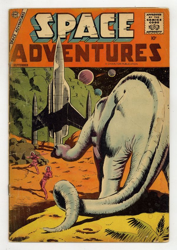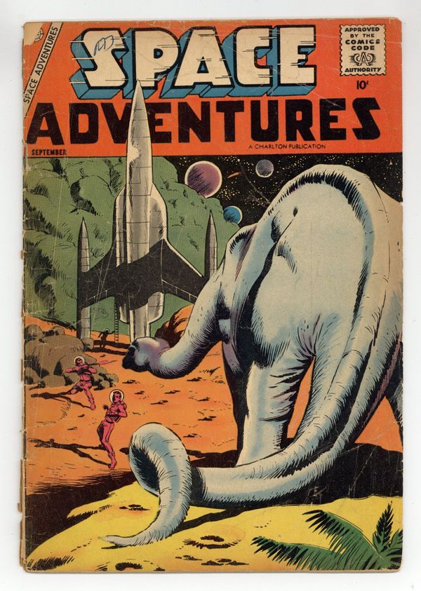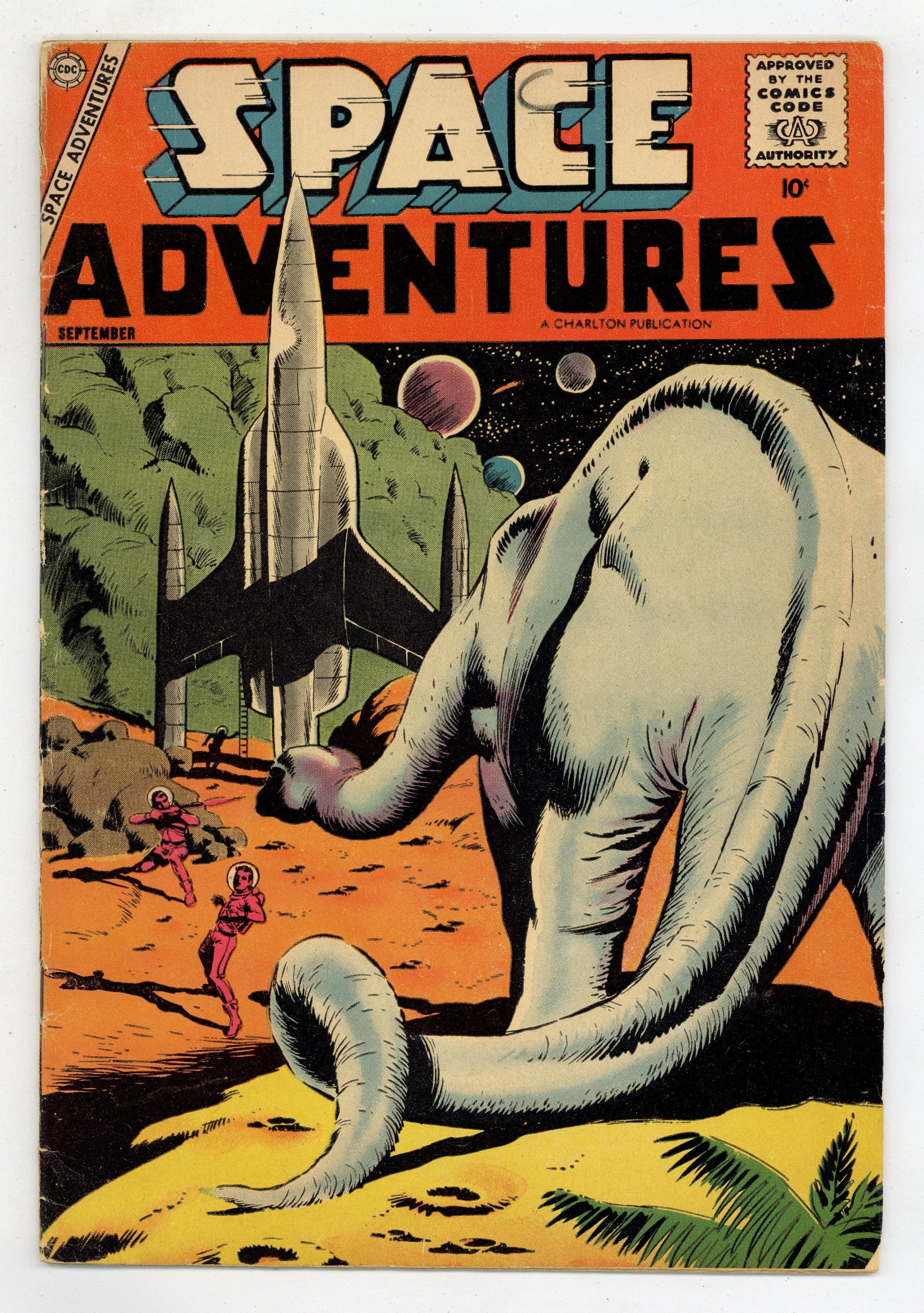 Cover by Dick Giordano. Stories and art by Steve Ditko, Bill Molno, Vince Alascia and Sal Trapani. Sci-fi and super-heroics from Charlton Comics. Venus tries to keep tabs on its warlike neighbor planet Earth, in a story with early art by Spider-Man co-creator Steve Ditko. Astronauts struggle to make repairs after a meteor strikes their ship, in a story that presents life in space fairly accurately for 1956. Drought-stricken Martians seek water and help from Earth, in a story with early art by Spider-Man co-creator Steve Ditko. The First Satellite; Rescue in Outer Space; Dredge from the Unknown; Gordons Genius; The Great Martian Drought; The Agent Among Us. 32 pages, Full Color. Cover price $0.10.