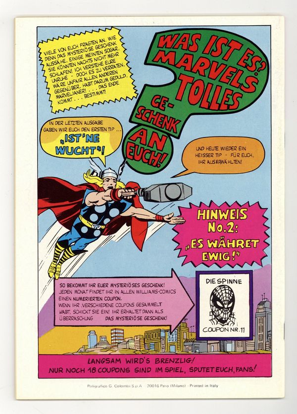 Published 1974 by BSV-Williams.$225.00German reprint series. Reprints material from Amazing Spider-Man (1963 1st Series) #2, Tales to Astonish (1959-1968 1st Series) #74, and Thor (1962 Marvel 1st Series Journey Into Mystery) #99. Features the 1st appearance of The Vulture. 7" X 9 7/8". 36 pages. Full Color. German Language.