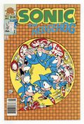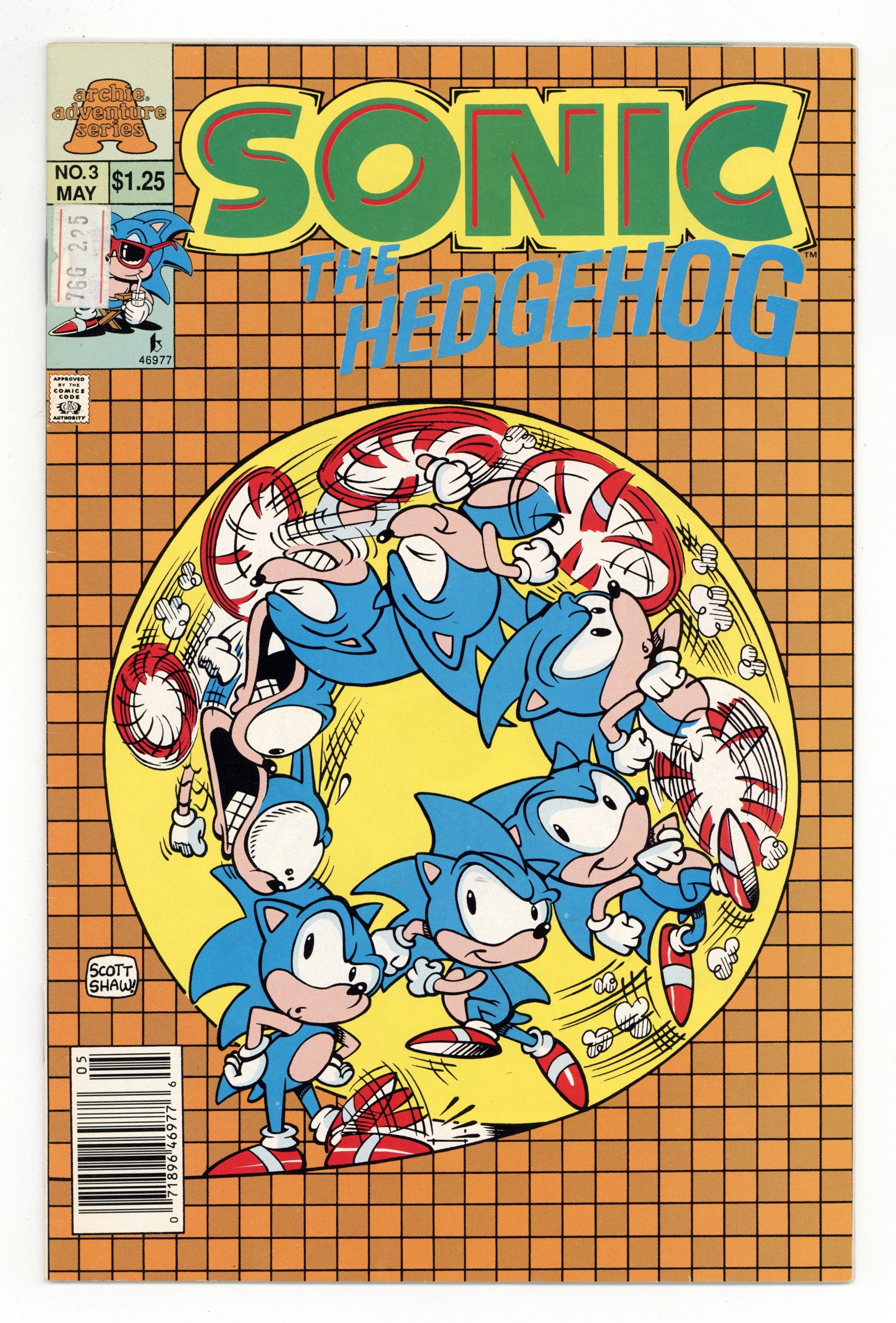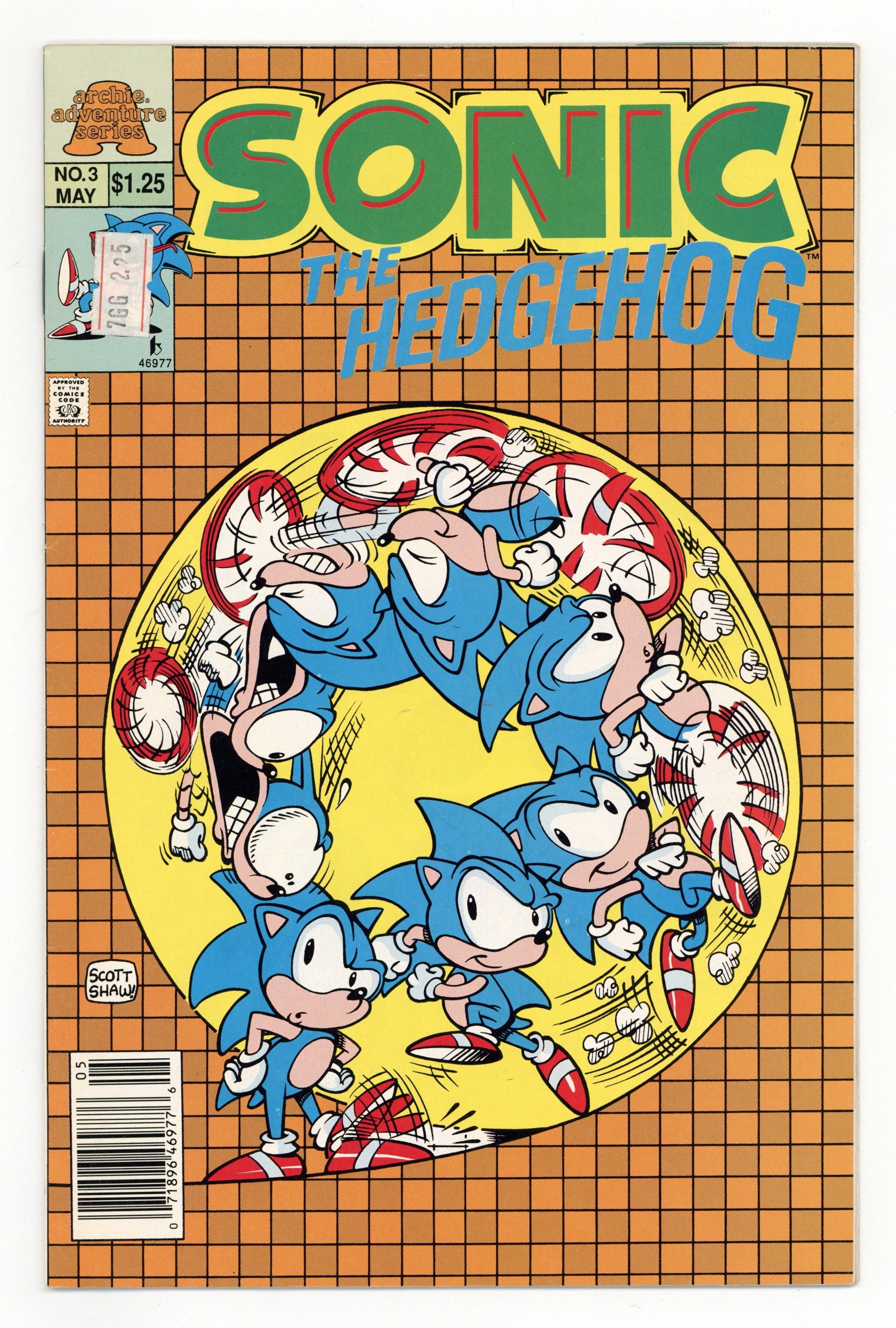 Newsstand Edition. Based on the Sega video game. Cover by Scott Shaw. "Sonic Flashback," script by Michael Gallagher, pencils by Dave Manak, inks by Bill White; Sonic suffers a concussion while battling Dr. Robotnik and imagines himself and Robotnik as children under the care of his Uncle Chuck. "Why Ask Spy?", script by Michael Gallagher, pencils by Dave Manak, inks by Bill White; Sally and Rotor develop a disguise for Sonic to allow him to infiltrate Dr. Robotnik's factory. 36 pgs., full color. $1.25. Cover price $1.25.