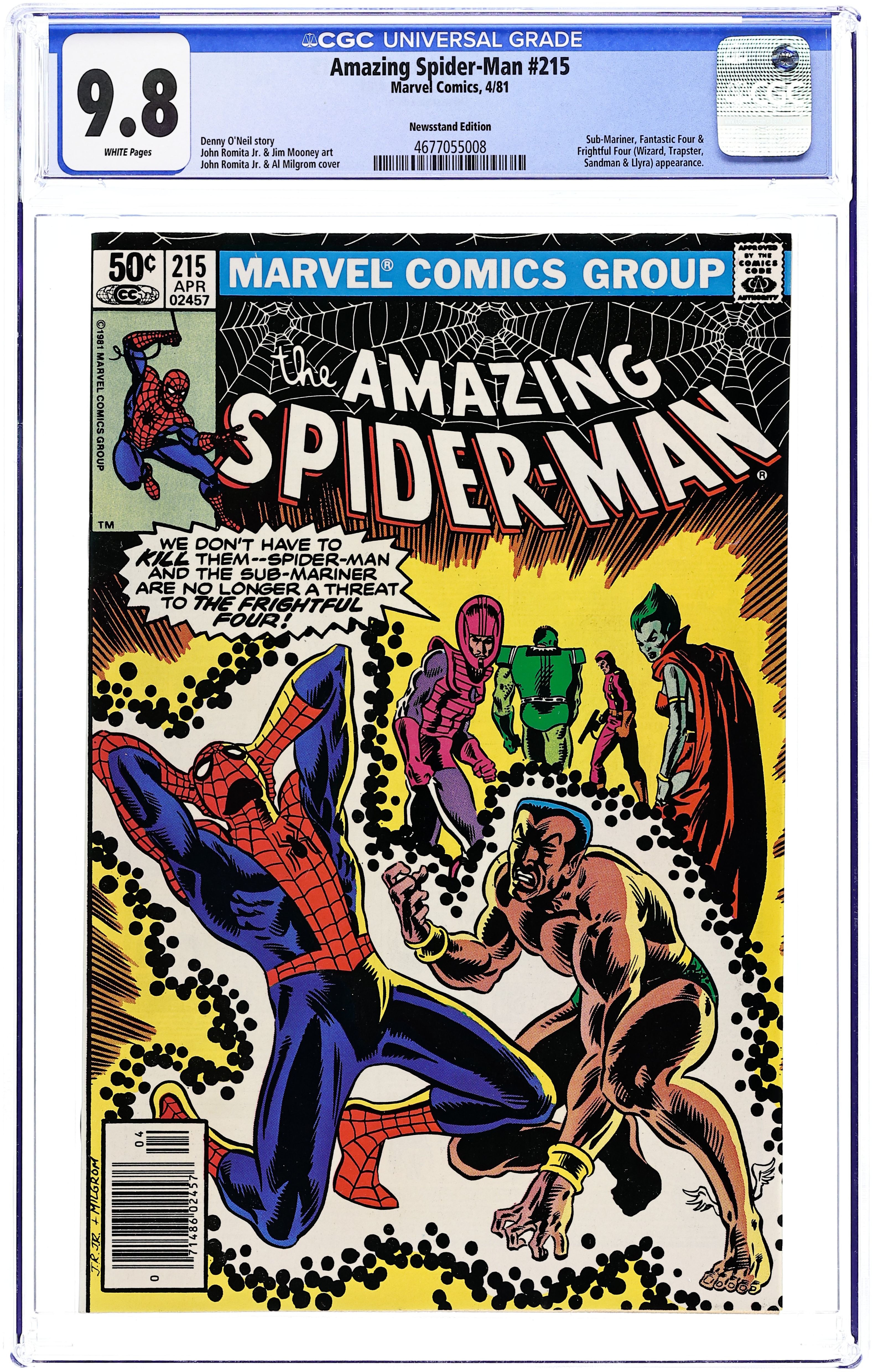 Newsstand Edition. "By My Powers Shall I Be Vanquished!" Part 3 of 3. Guest-starring the Sub-Mariner. Script by Denny O'Neil. Art by John Romita Jr. (breakdowns) and Jim Mooney (finishes). Cover by John Romita Jr. and Al Milgrom. In a diabolical twist of fate, the Wizard transfers Spider-Man's spider-sense into the mind of the Sub-Mariner! The web-slinger's sudden loss and Prince Namor's sudden gain make them easy prey for the Frightful Four! After taking a beating, the two heroes go their separate ways to lick their wounds! Hours later they rendezvous at the Baxter Building to reverse the Wizard's experiment! And then it's time for payback! The Spectacular Spider-Man and the Avenging Son vs. the Frightful Four! Imperious Rex! A terrific three-part story! Cameo appearances by the Invisible Girl, Mr. Fantastic, and the Thing. (Notes: This O'Neil-Romita Jr.-Mooney collaboration is the signature Spider-Man & Sub-Mariner team-up of the bronze age. This issue includes a 3/4 page ad (by Frank Miller) for the Doctor Strange 2nd series; however, another artist ended up penciling the title. The letters page contains a statement of ownership: average print run 609,059; average paid circulation: 296,712. 36 pgs. Cover price $0.50.