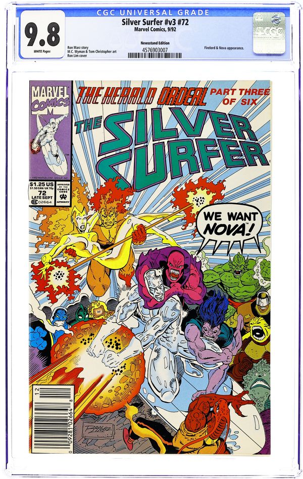 Newsstand Edition. The Herald Ordeal. Part 3 of 6. "Liberation!" Guest-starring Firelord. Story by Ron Marz. Art by M.C. Wyman and Tom Christopher. Cover by Ron Lim. The new Herald of Galactus, Morg the Executioner, is ruthless killer and now empowered with the Power Cosmic. The Silver Surfer and Firelord intend to free Nova from captivity and confront this new power. 32 pages. Cover price $1.25.