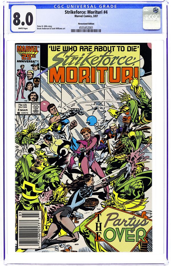 Newsstand Edition. Cover pencils by Brent Anderson. Media Bash, script by Peter B. Gillis, pencils by Brent Anderson, inks by Scott Williams; a Strikeforce comic book is released and a TV series is announced; unfortunately, a team member dies. 36 pgs. $0.75. Cover price $0.75.