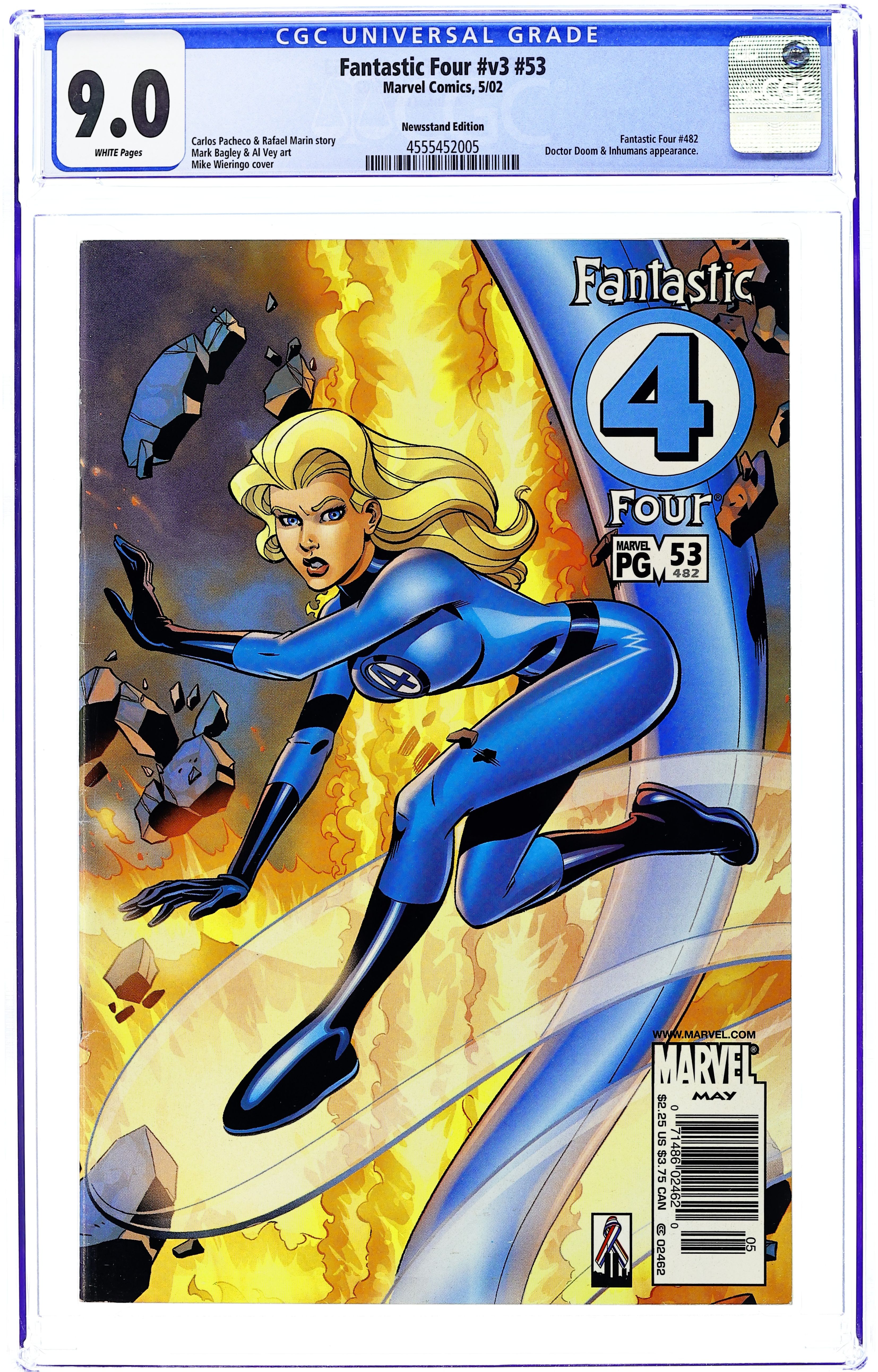 Newsstand Edition. Cover by Mike Wieringo. Story by Carlos Pacheco and Rafael Marin. Art by Mark Bagley and Al Vey. On all of Earth, only one nation is willing to provide sanctuary for the Inhumans, but it's the country that's under the iron rule of Dr. Doom! And as the plan of the Hidden Ones comes into focus, Mr. Fantastic faces the onslaught of his own government as an enemy of the state! Plus: the Invisible Woman's pregnancy reaches a critical turning point! FC, 32pg$2.25 Cover price $2.25.