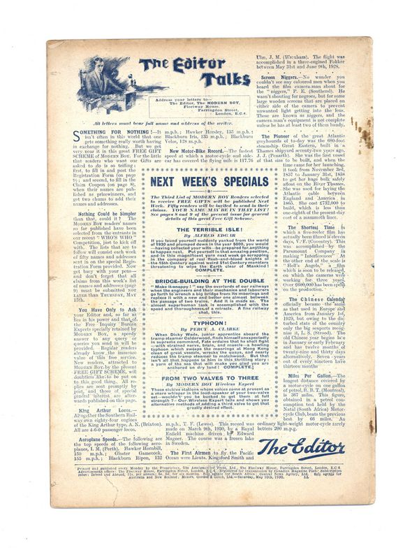 The Modern Boy was a British weekly known for featuring the works of W.E. Johns, creator of Biggles, pictorials, and hobbyist articles.