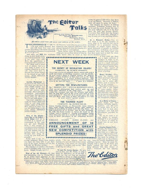 The Modern Boy was a British weekly known for featuring the works of W.E. Johns, creator of Biggles, pictorials, and hobbyist articles.