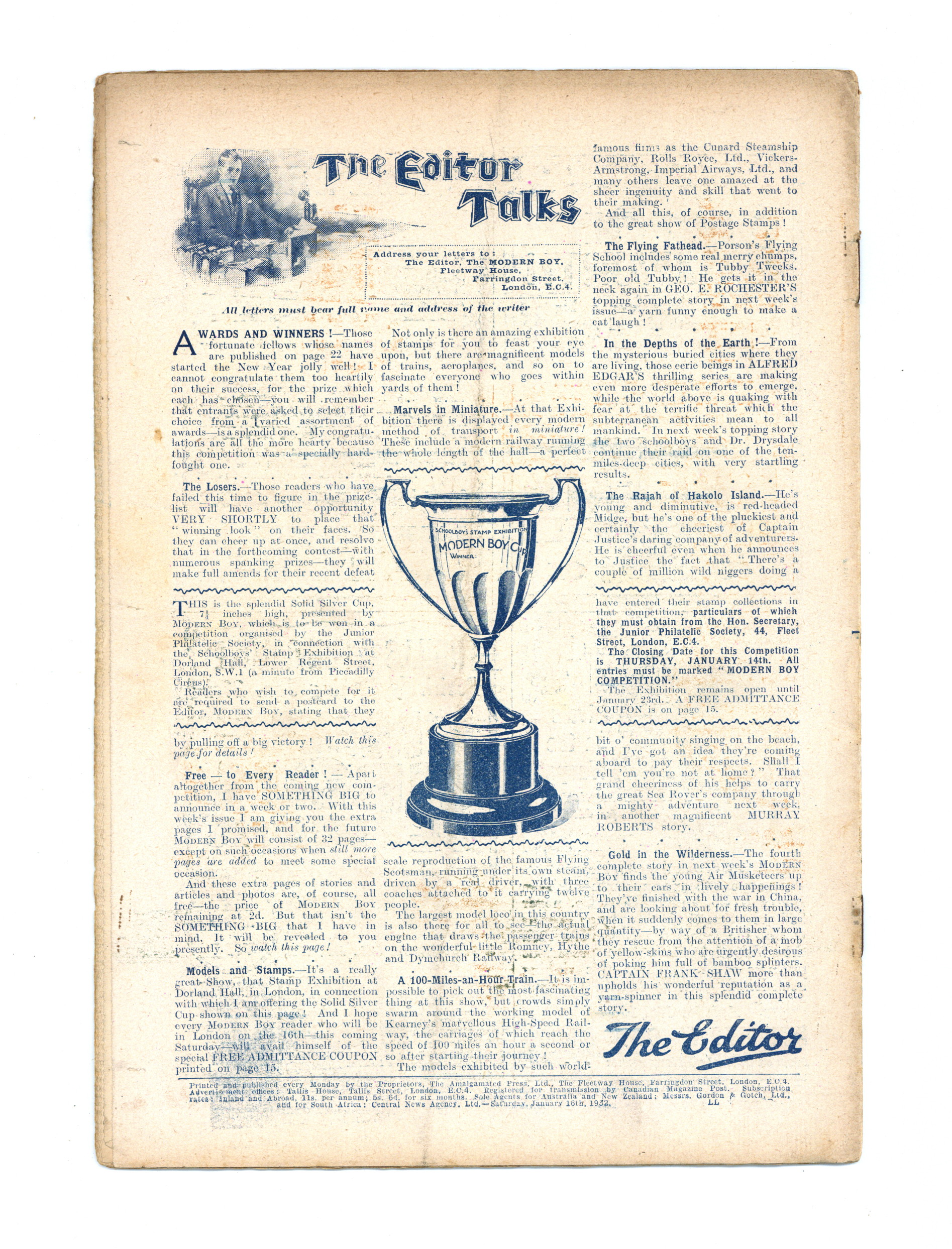 The Modern Boy was a British weekly known for featuring the works of W.E. Johns, creator of Biggles, pictorials, and hobbyist articles.