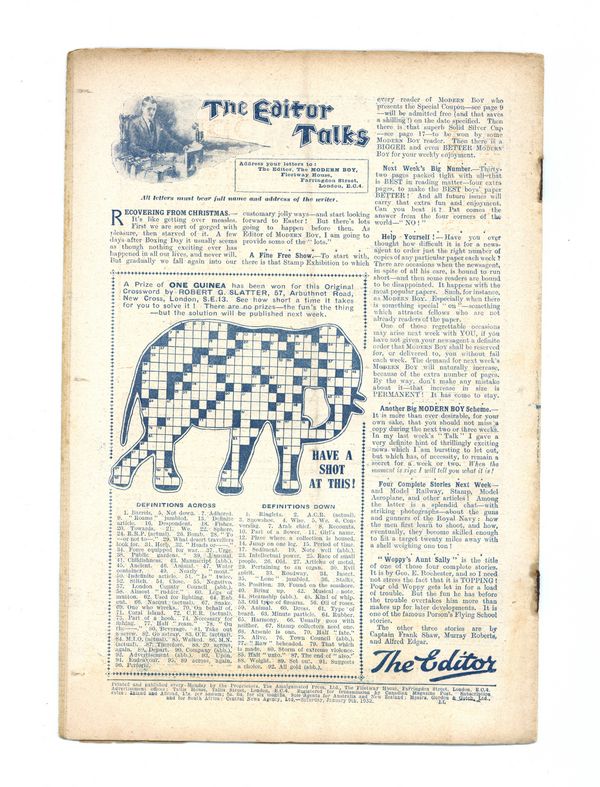The Modern Boy was a British weekly known for featuring the works of W.E. Johns, creator of Biggles, pictorials, and hobbyist articles.