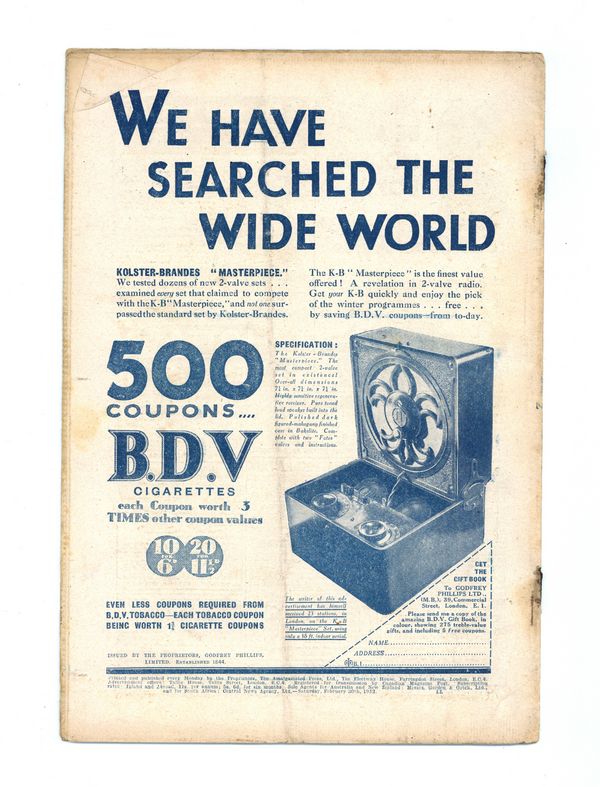 Published Feb 1932 by Amalgamated Press.$7.49- Cover Detached. Staple rust: Moderate.