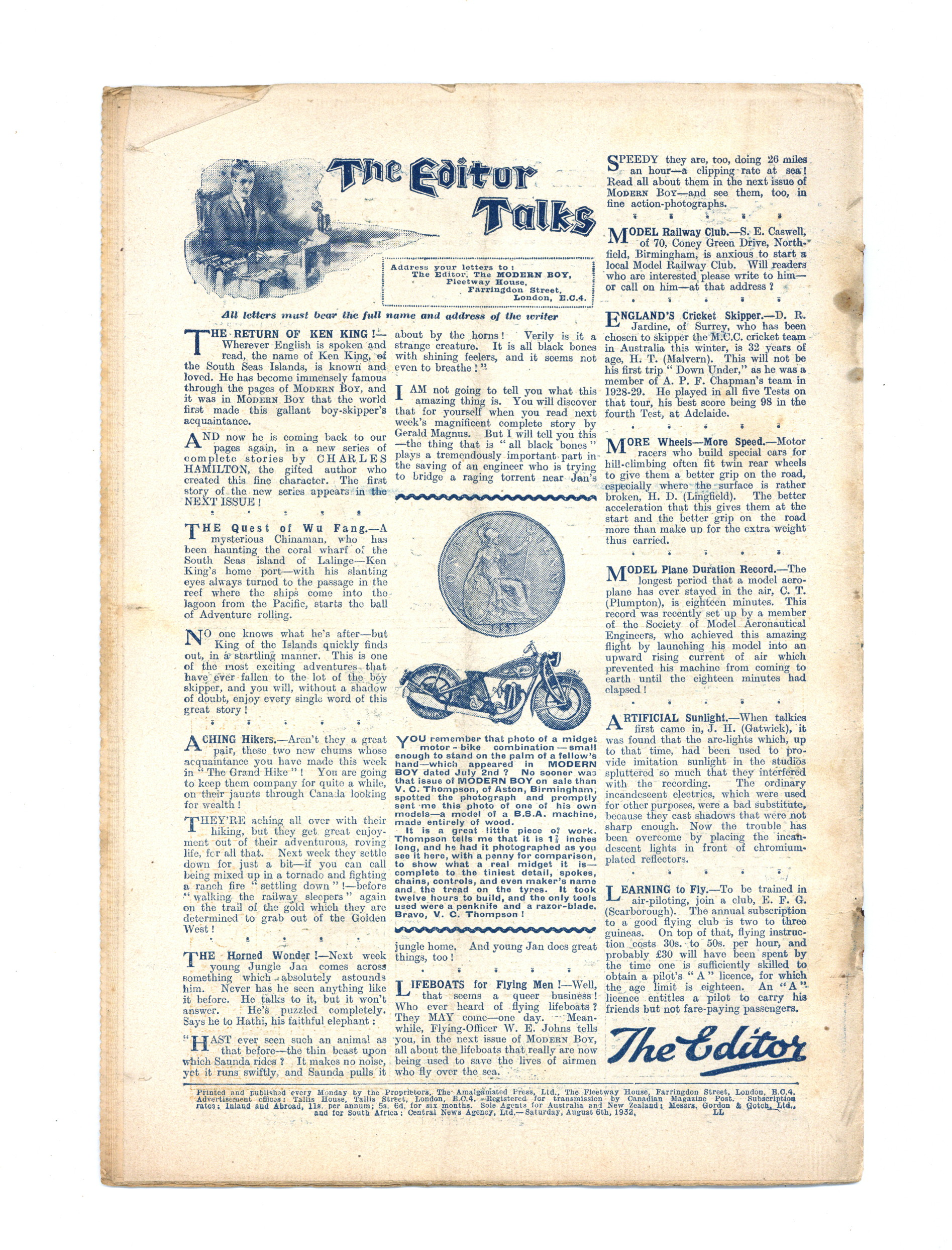 The Modern Boy was a British weekly known for featuring the works of W.E. Johns, creator of Biggles, pictorials, and hobbyist articles.