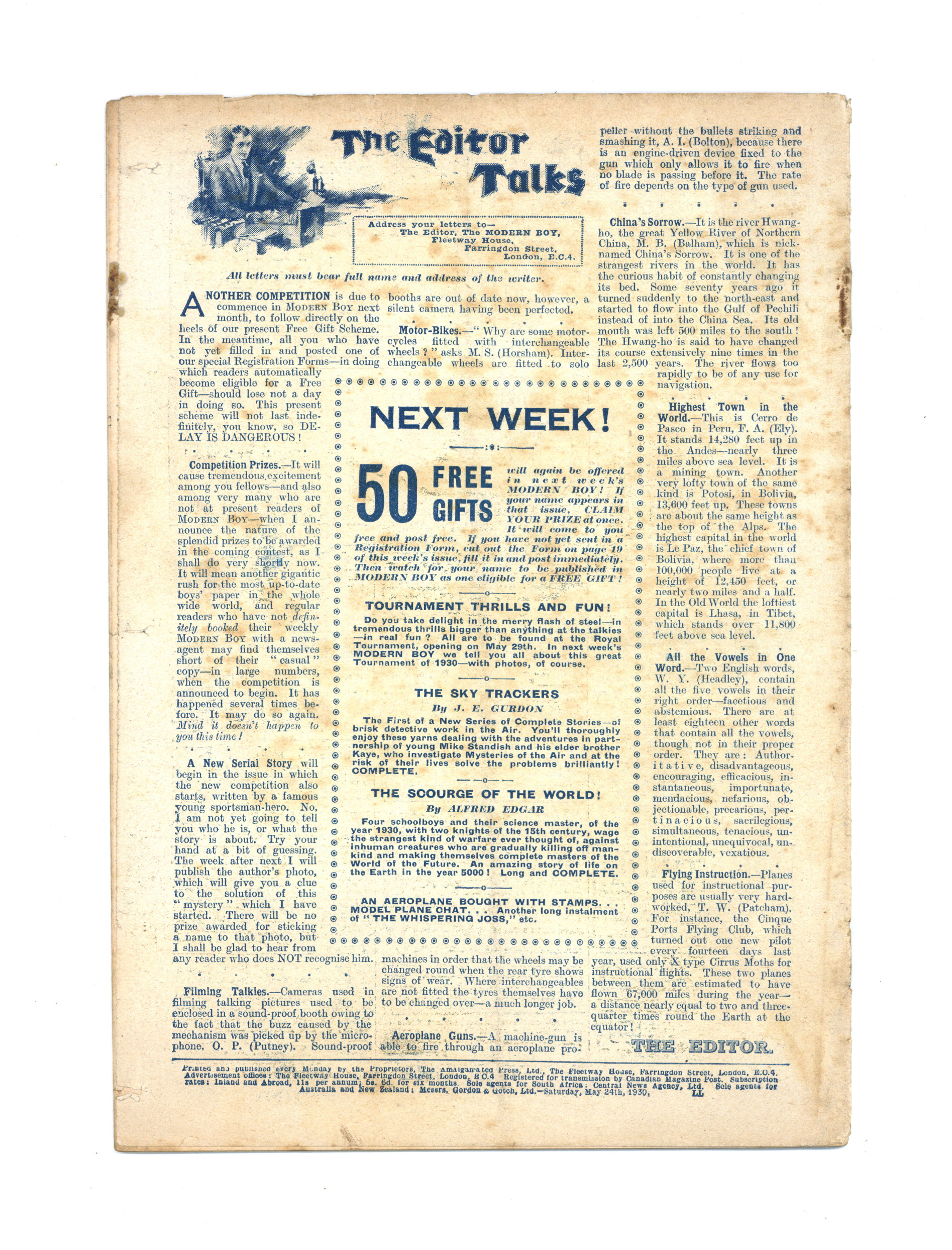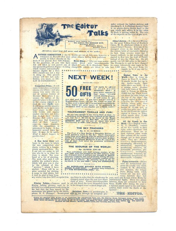 The Modern Boy was a British weekly known for featuring the works of W.E. Johns, creator of Biggles, pictorials, and hobbyist articles.