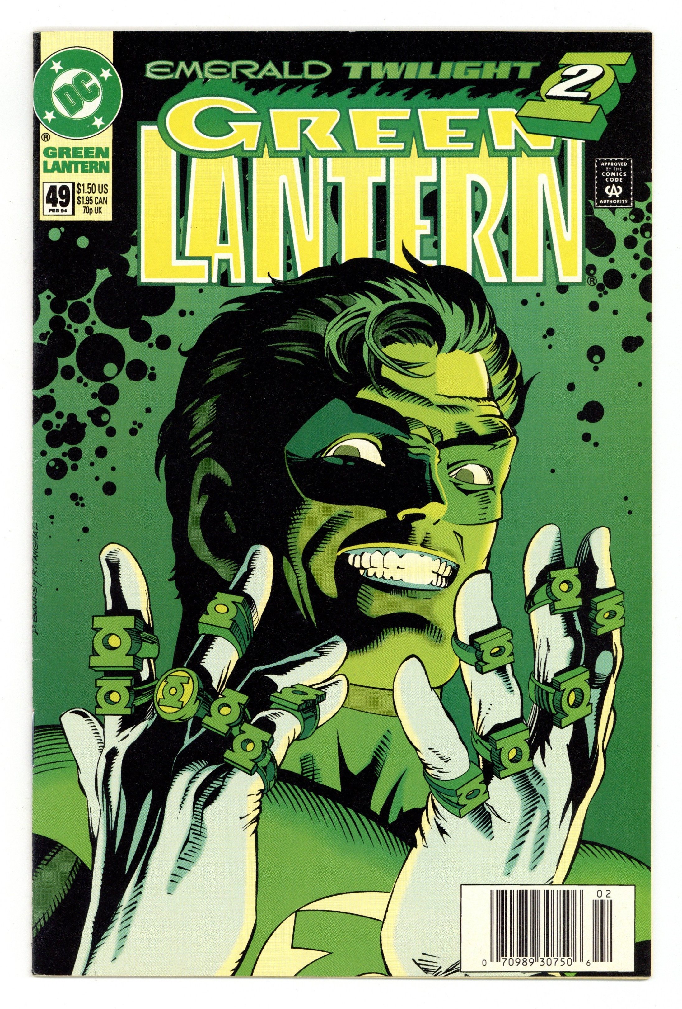 Tags: Green Lantern$21.00Newsstand Edition. Emerald Twilight: Part 2 of 3. "The Present!" Story by Ron Marz. Art by Fred Haynes, Dennis Cramer, and Romeo Tanghal. Needing more power to bring back the destroyed Coast City and all its murdered citizens, an out of control Hal Jordan heads to OA. The Guardians send the entire Green Lantern Corps to stop him. But Hal was always the best and the rest of the GLs are about to find out why. Will the Guardians be forced to do the unthinkable? Will they release one terror to stop another? Cover price $1.50.