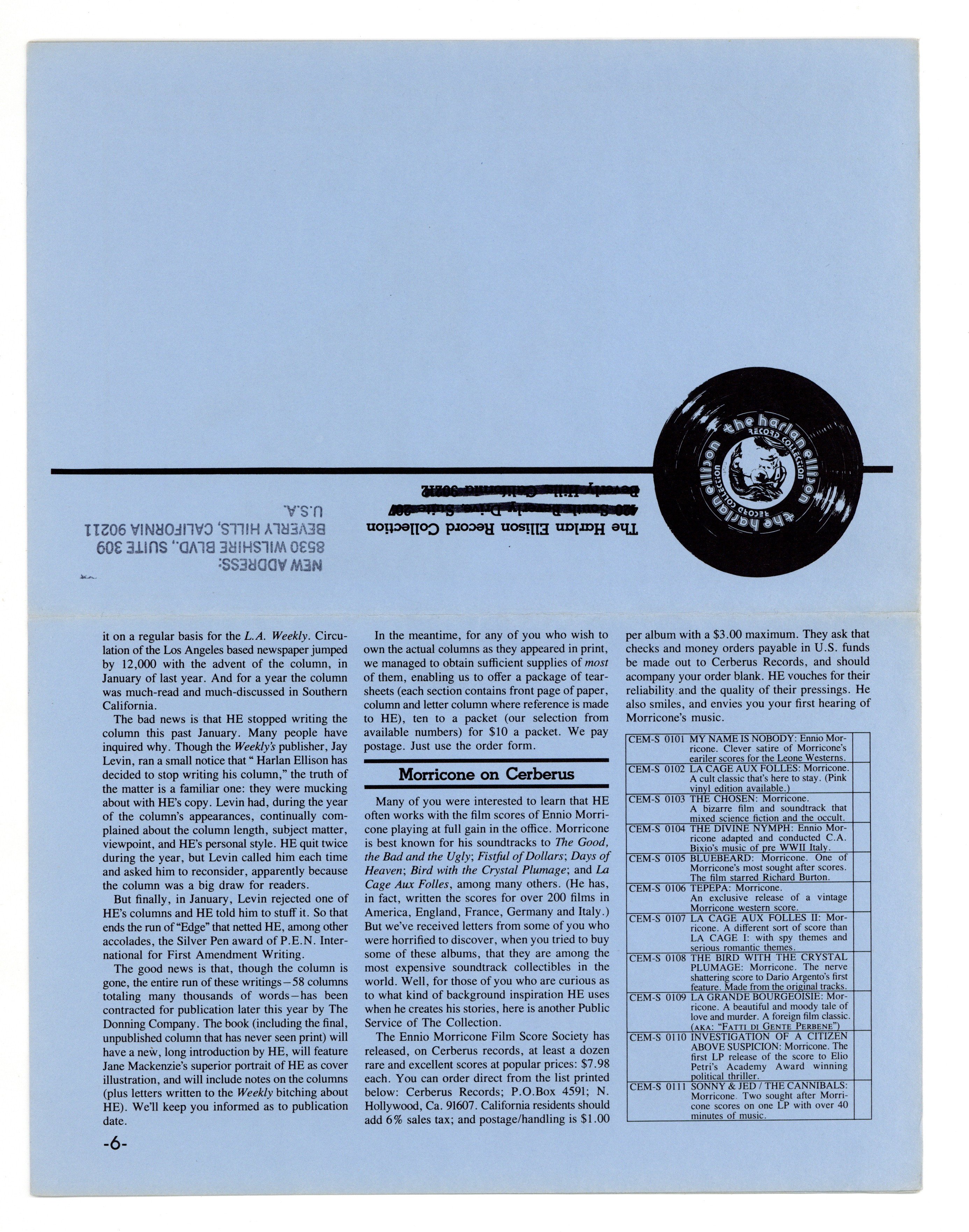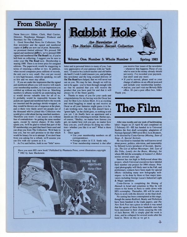 Published Mar 1983 by Kilimanjaro Corporation.$36.00Vol. 1, No. 3 - Whole Number 3. Spring 1983. Newsletter of The Harlan Ellison Record Collection. Originally created as a means to promote Harlan's audio recordings to his fans, it also gave him the opportunity to sell books from his back list, offer updates on projects, the occasional essay, scheduled appearances, publication schedules, and Harlan's ever present opinions on...everything. Is there consistency through the issues? Only in that they offer a relaxed review of All Things Ellison. 8.5" x 11", 6 pages, B&W