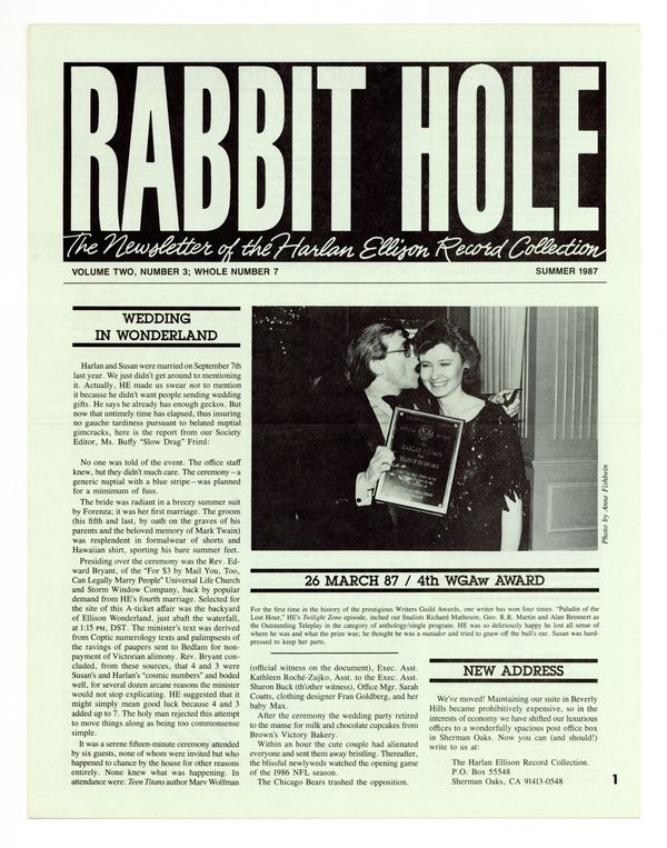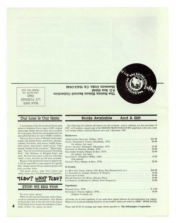 Published Jun 1987 by Kilimanjaro Corporation.$36.00Vol. 2, No. 3 - Whole Number 7. Summer 1987. Newsletter of The Harlan Ellison Record Collection. Originally created as a means to promote Harlan's audio recordings to his fans, it also gave him the opportunity to sell books from his back list, offer updates on projects, the occasional essay, scheduled appearances, publication schedules, and Harlan's ever present opinions on...everything. Is there consistency through the issues? Only in that they offer a relaxed review of All Things Ellison. 8.5" x 11", 4 pages, B&W