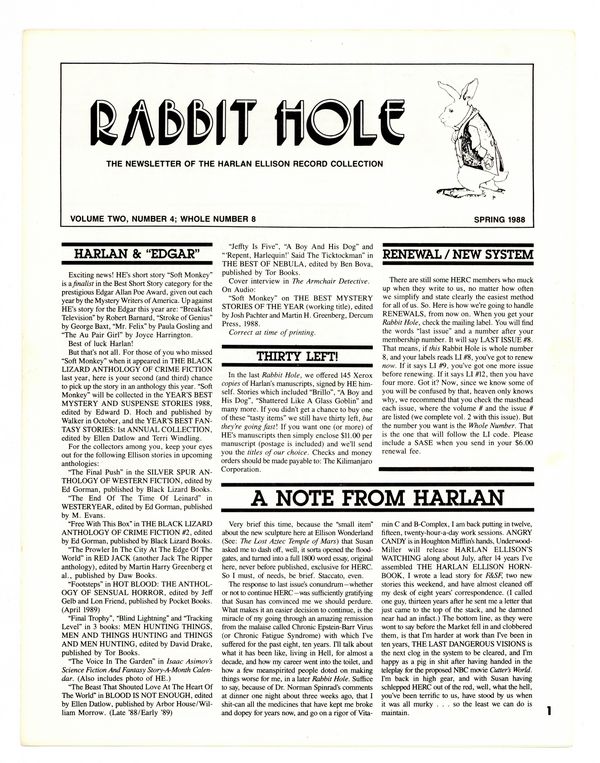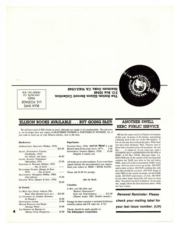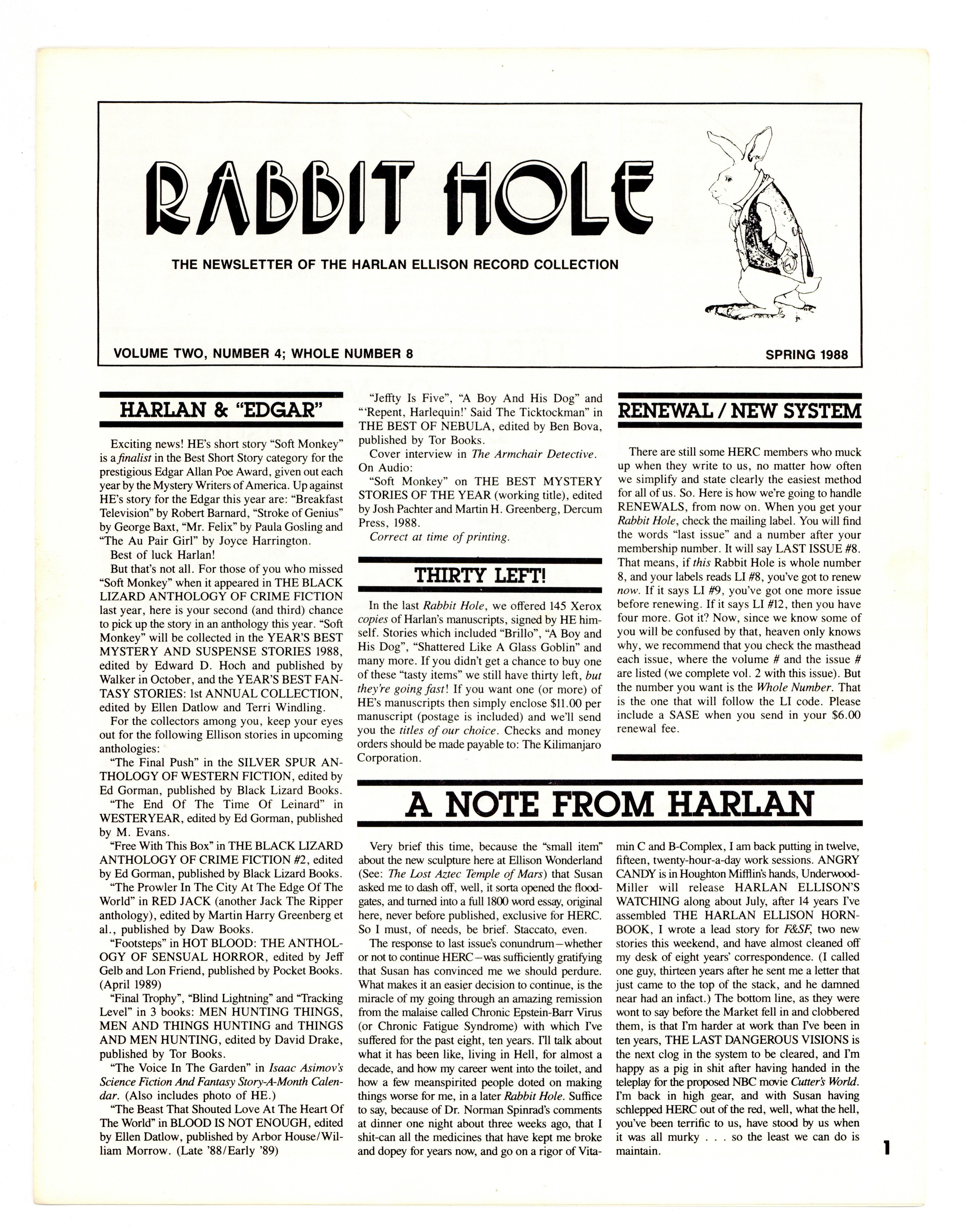 Published Mar 1988 by Kilimanjaro Corporation.$36.00Vol. 2, No. 4 - Whole Number 8. Spring 1988. Newsletter of The Harlan Ellison Record Collection. Originally created as a means to promote Harlan's audio recordings to his fans, it also gave him the opportunity to sell books from his back list, offer updates on projects, the occasional essay, scheduled appearances, publication schedules, and Harlan's ever present opinions on...everything. Is there consistency through the issues? Only in that they offer a relaxed review of All Things Ellison. 8.5" x 11", 4 pages, B&W Cover price $1.75.