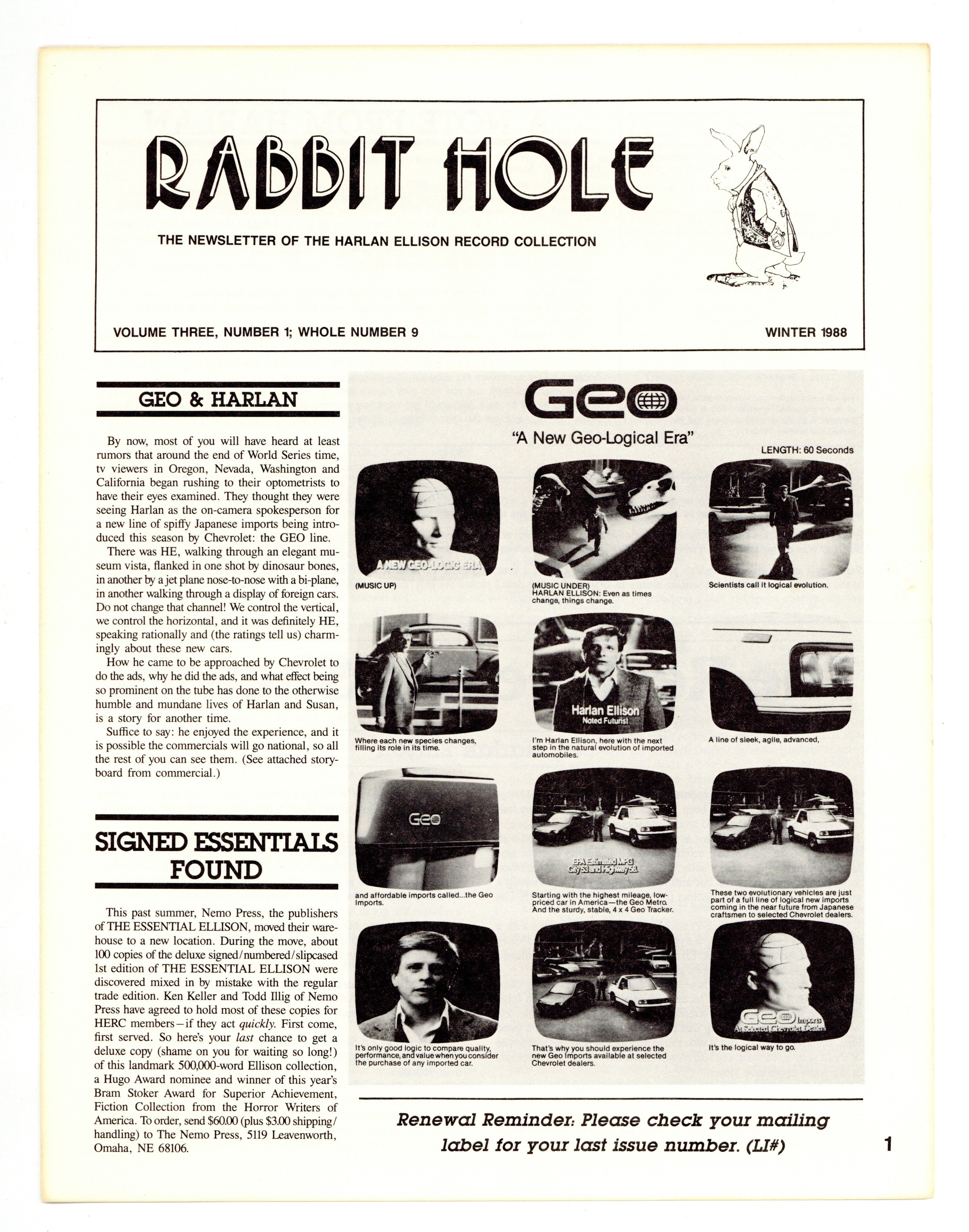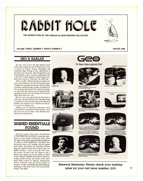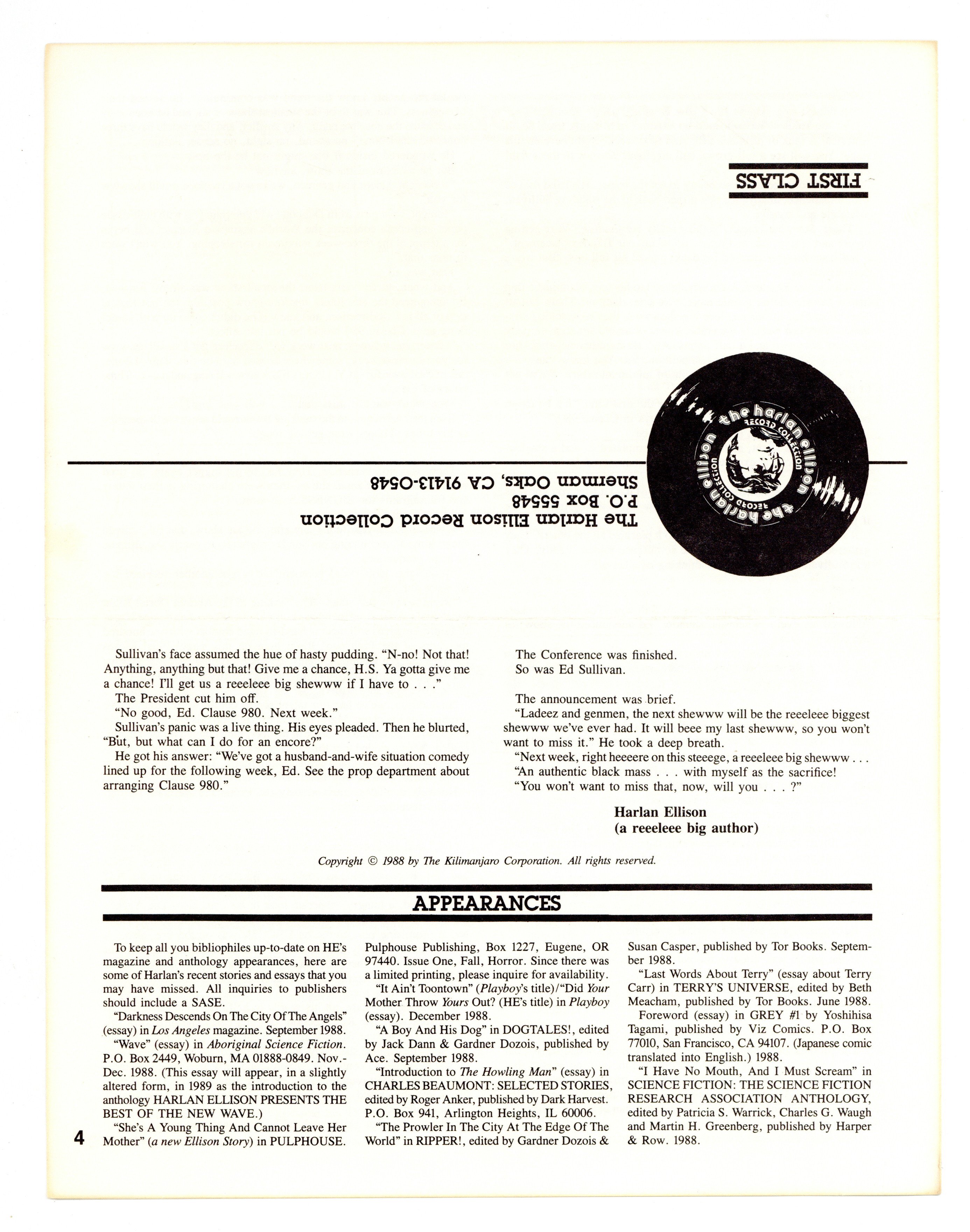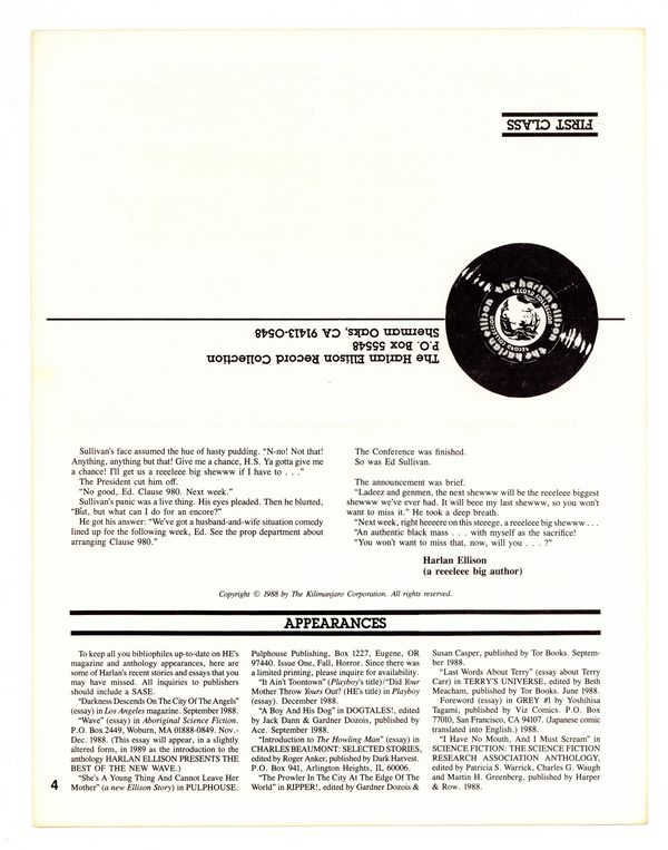 Vol. 3, No. 1 - Whole Number 9. Winter 1988. Newsletter of The Harlan Ellison Record Collection. Originally created as a means to promote Harlan's audio recordings to his fans, it also gave him the opportunity to sell books from his back list, offer updates on projects, the occasional essay, scheduled appearances, publication schedules, and Harlan's ever present opinions on...everything. Is there consistency through the issues? Only in that they offer a relaxed review of All Things Ellison. 8.5" x 11", 4 pages, B&W Cover price $1.75.