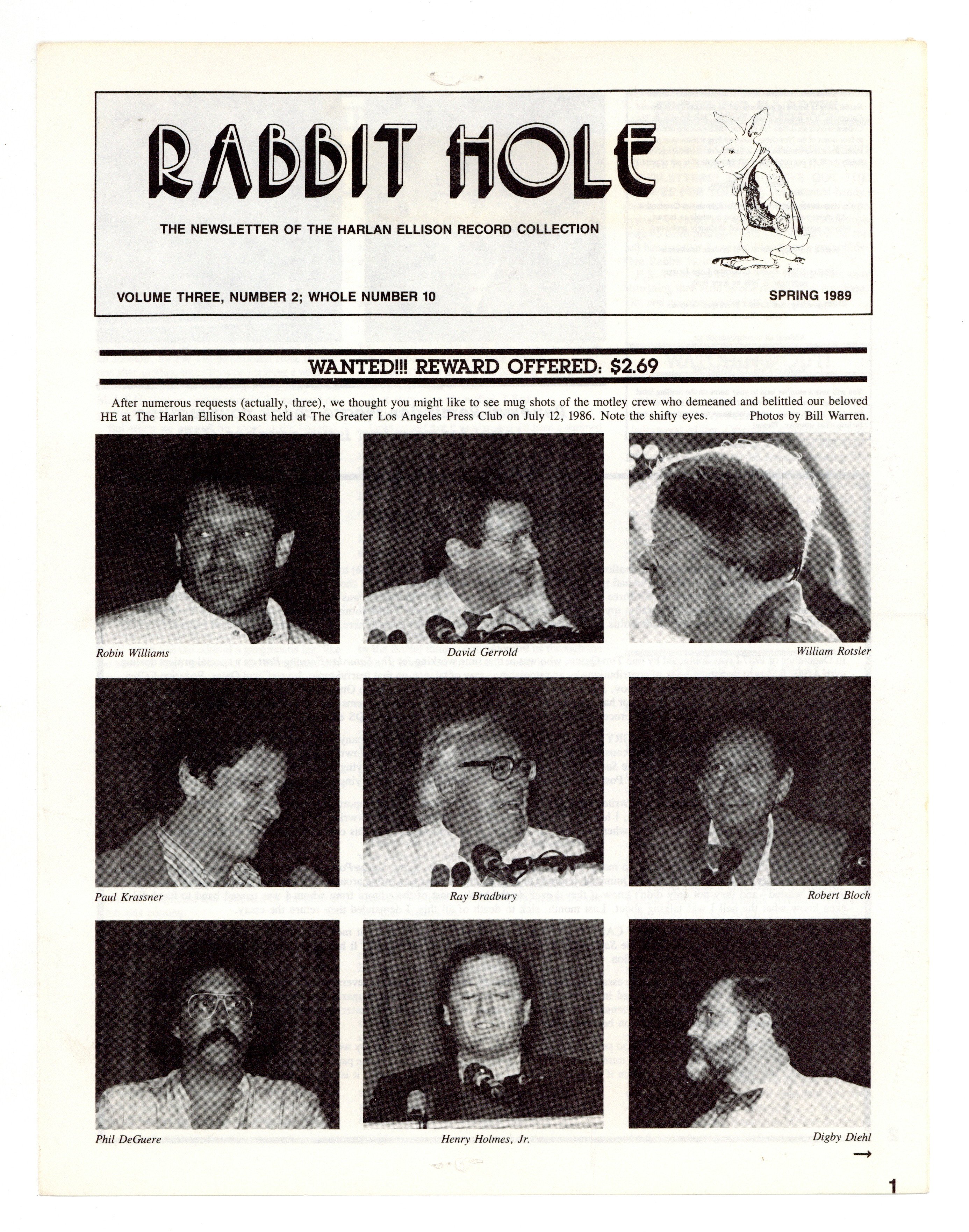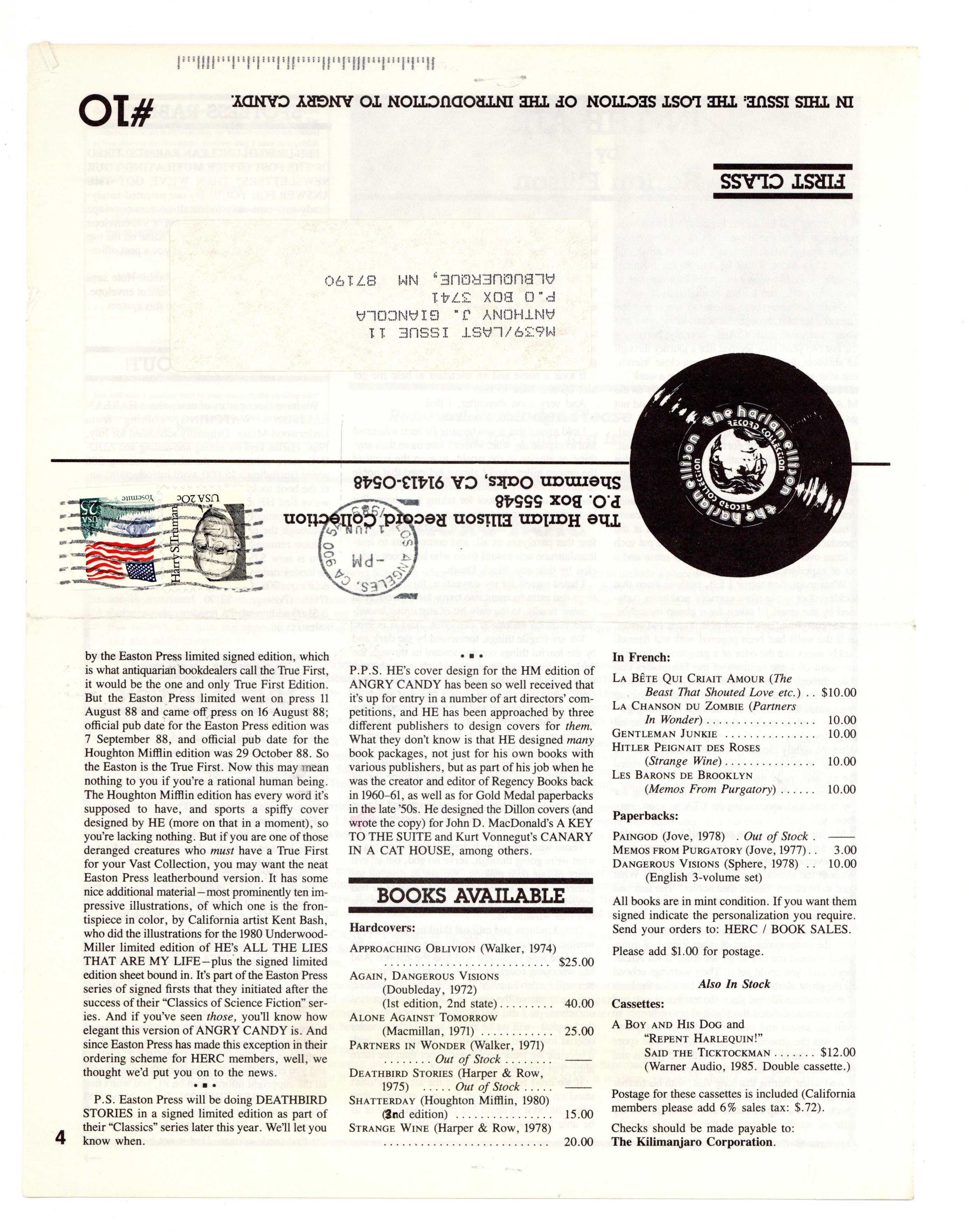 Published Mar 1989 by Kilimanjaro Corporation.$36.00Vol. 3, No. 2 - Whole Number 10. Spring 1989. Newsletter of The Harlan Ellison Record Collection. Originally created as a means to promote Harlan's audio recordings to his fans, it also gave him the opportunity to sell books from his back list, offer updates on projects, the occasional essay, scheduled appearances, publication schedules, and Harlan's ever present opinions on...everything. Is there consistency through the issues? Only in that they offer a relaxed review of All Things Ellison. 8.5" x 11", 4 pages, B&W Cover price $1.75.