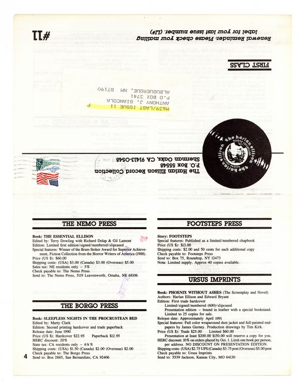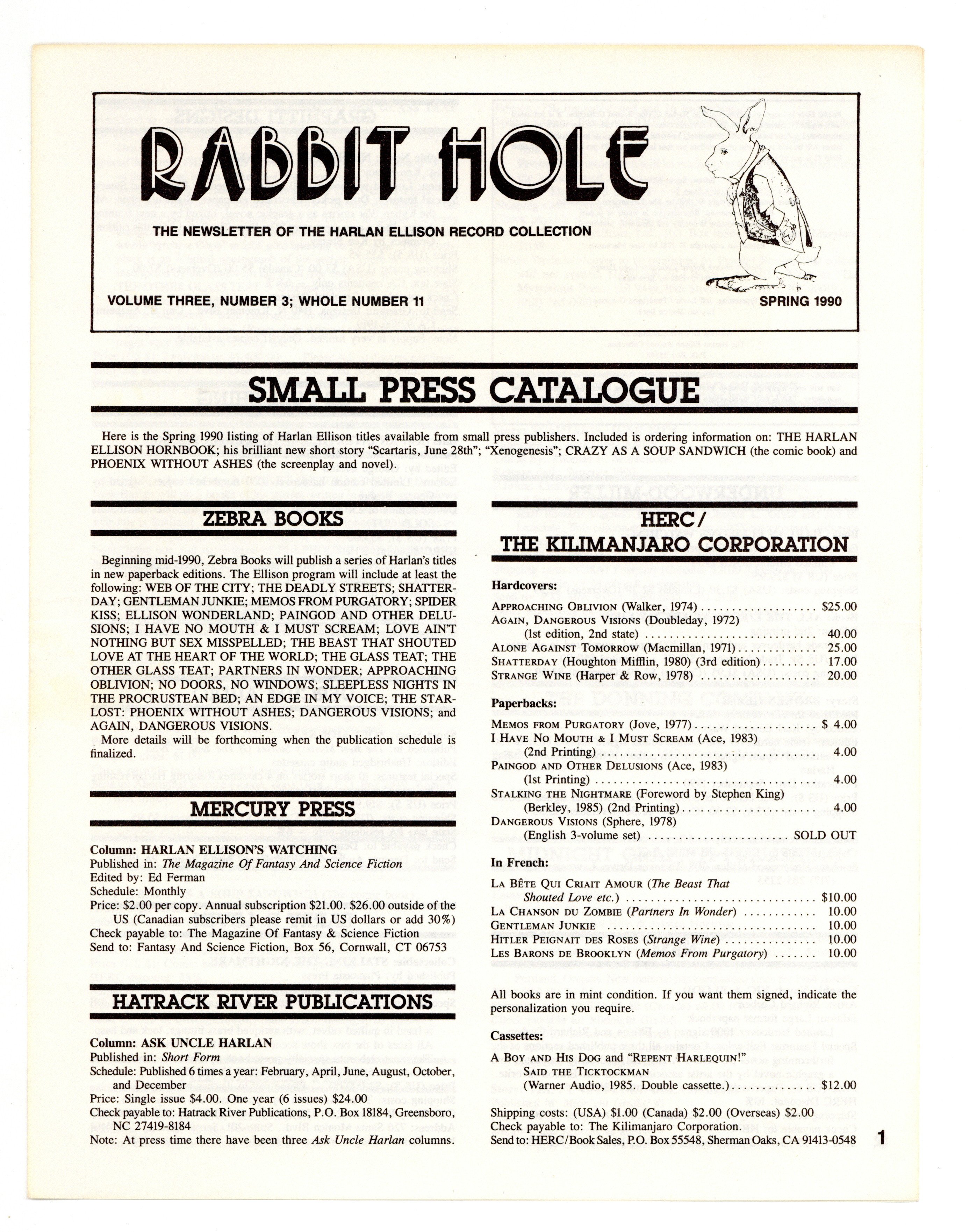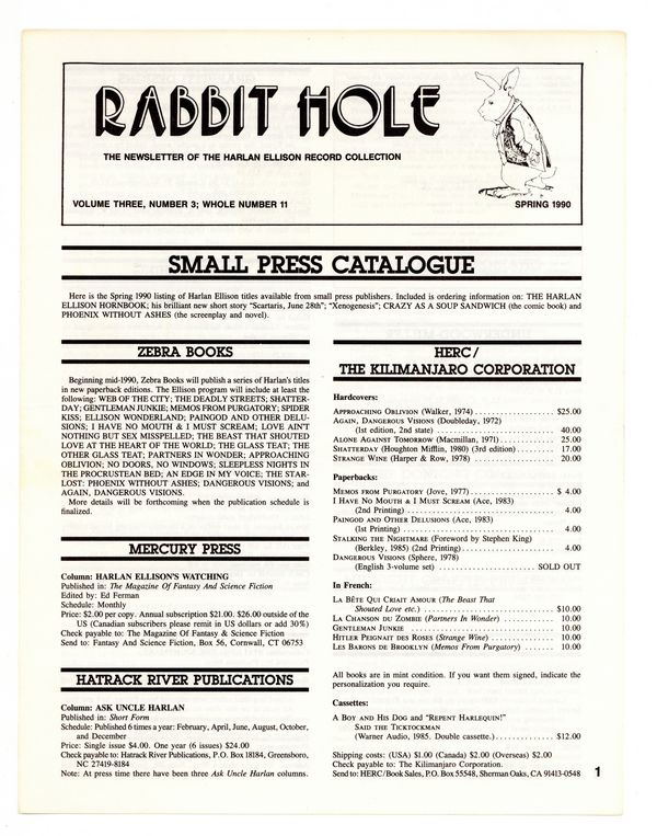 Published Mar 1990 by Kilimanjaro Corporation.$36.00Vol. 3, No. 3 - Whole Number 11. Spring 1990. Newsletter of The Harlan Ellison Record Collection. Originally created as a means to promote Harlan's audio recordings to his fans, it also gave him the opportunity to sell books from his back list, offer updates on projects, the occasional essay, scheduled appearances, publication schedules, and Harlan's ever present opinions on...everything. Is there consistency through the issues? Only in that they offer a relaxed review of All Things Ellison. 8.5" x 11", 4 pages, B&W Cover price $1.75.