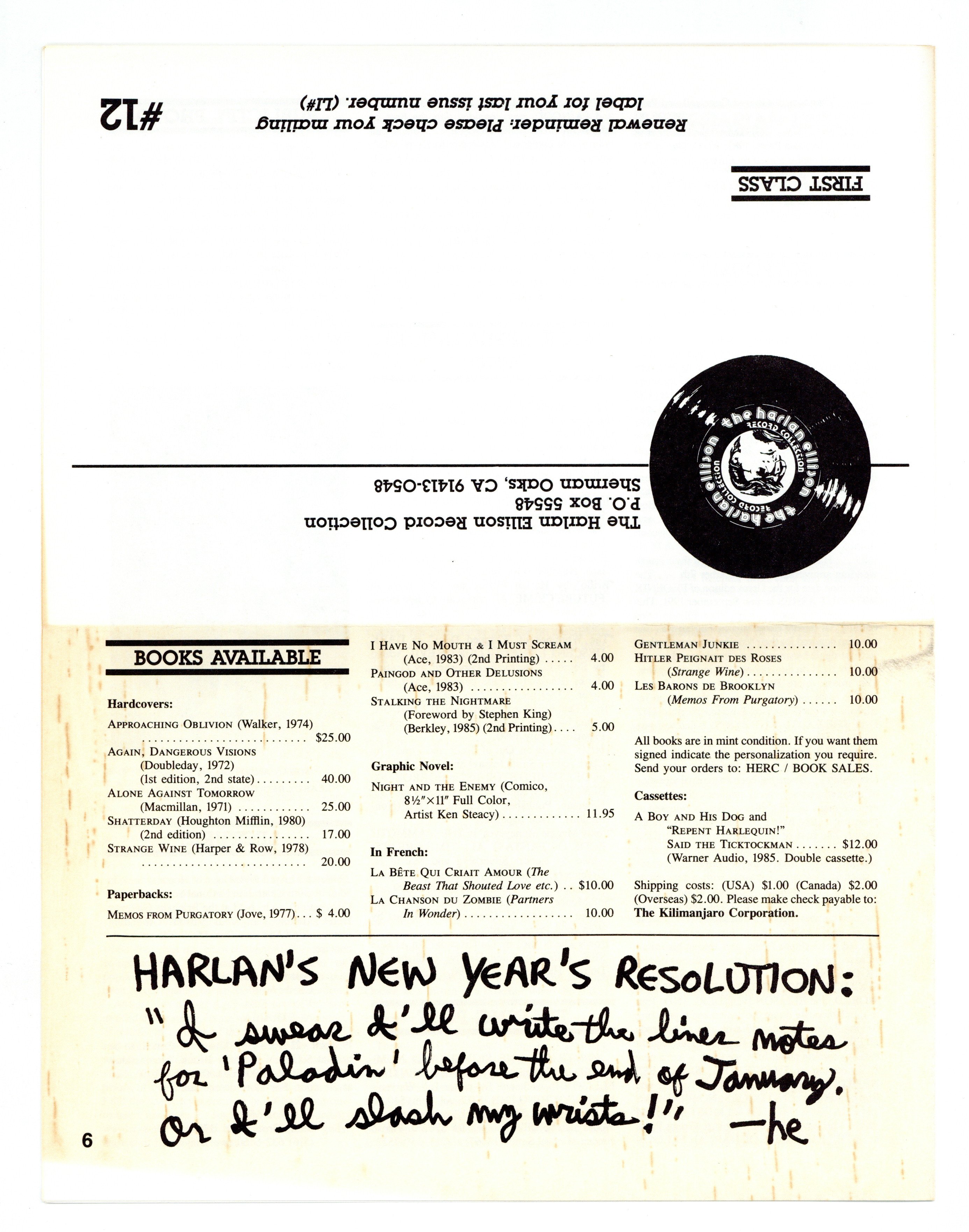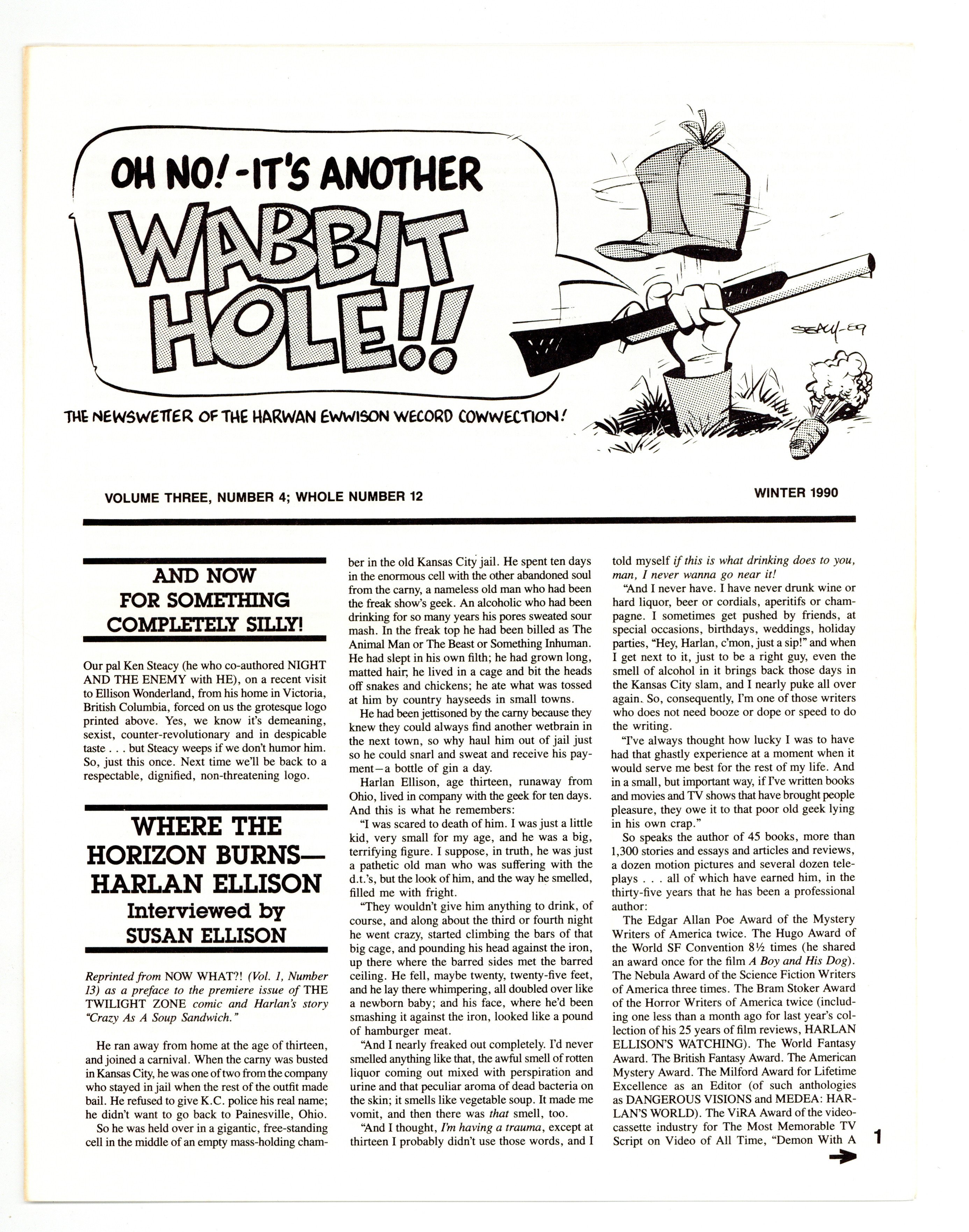 Published Dec 1990 by Kilimanjaro Corporation.$36.00Vol. 3, No. 4 - Whole Number 12. Winter 1990. Newsletter of The Harlan Ellison Record Collection. Originally created as a means to promote Harlan's audio recordings to his fans, it also gave him the opportunity to sell books from his back list, offer updates on projects, the occasional essay, scheduled appearances, publication schedules, and Harlan's ever present opinions on...everything. Is there consistency through the issues? Only in that they offer a relaxed review of All Things Ellison. 8.5" x 11", 6 pages, B&W Cover price $1.75.