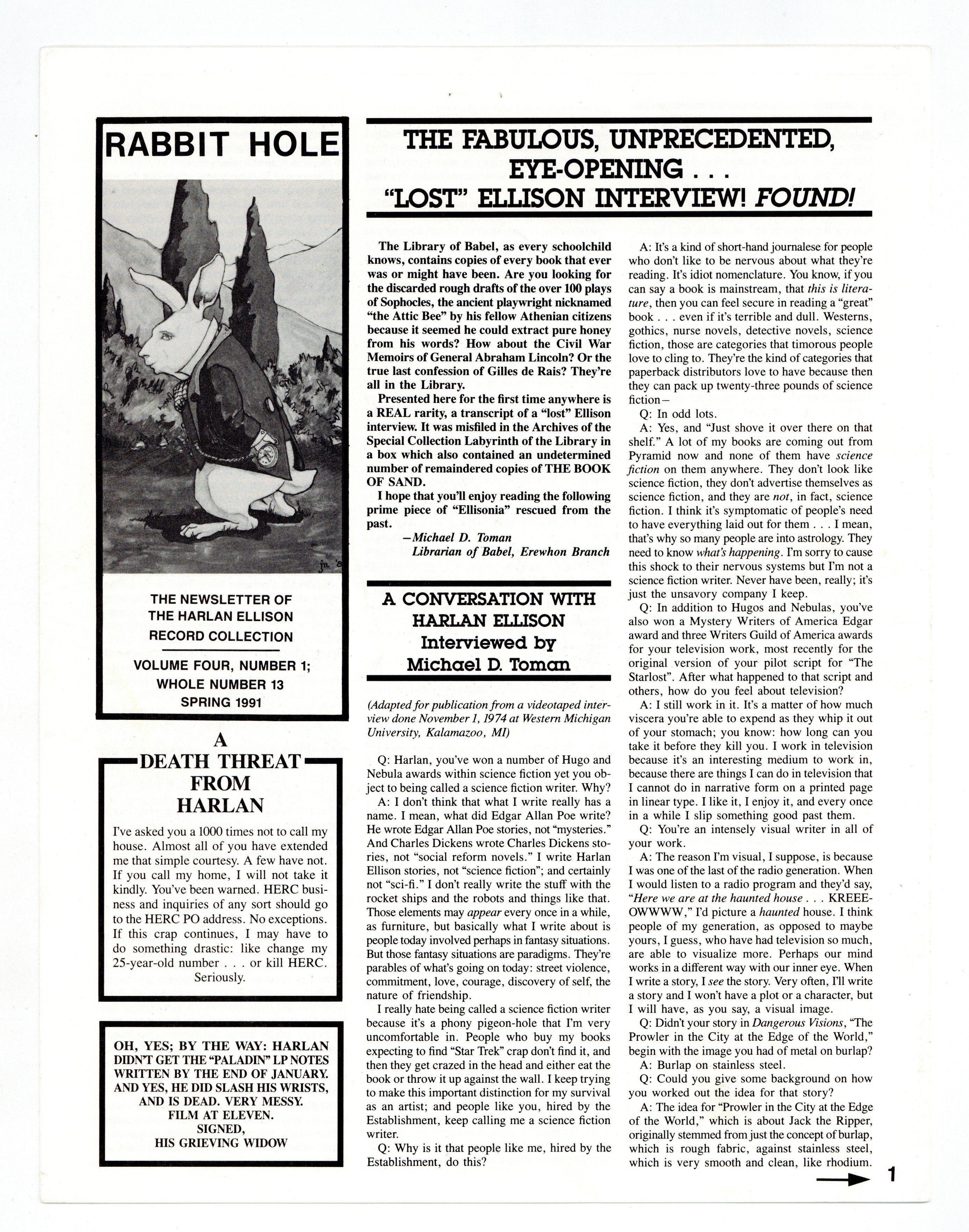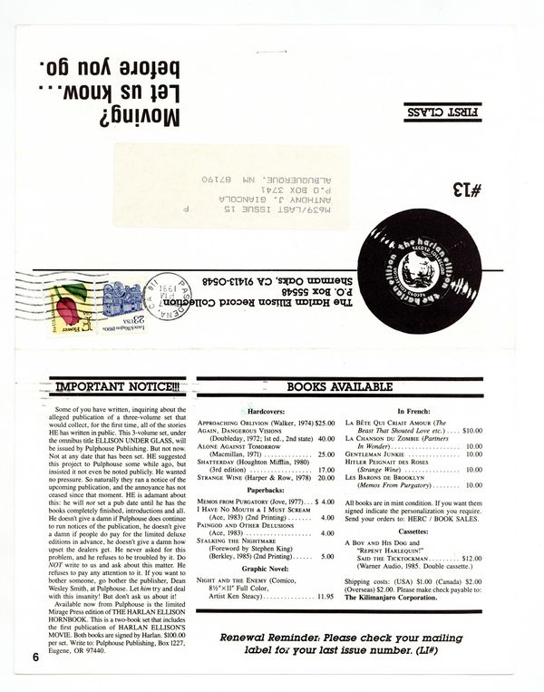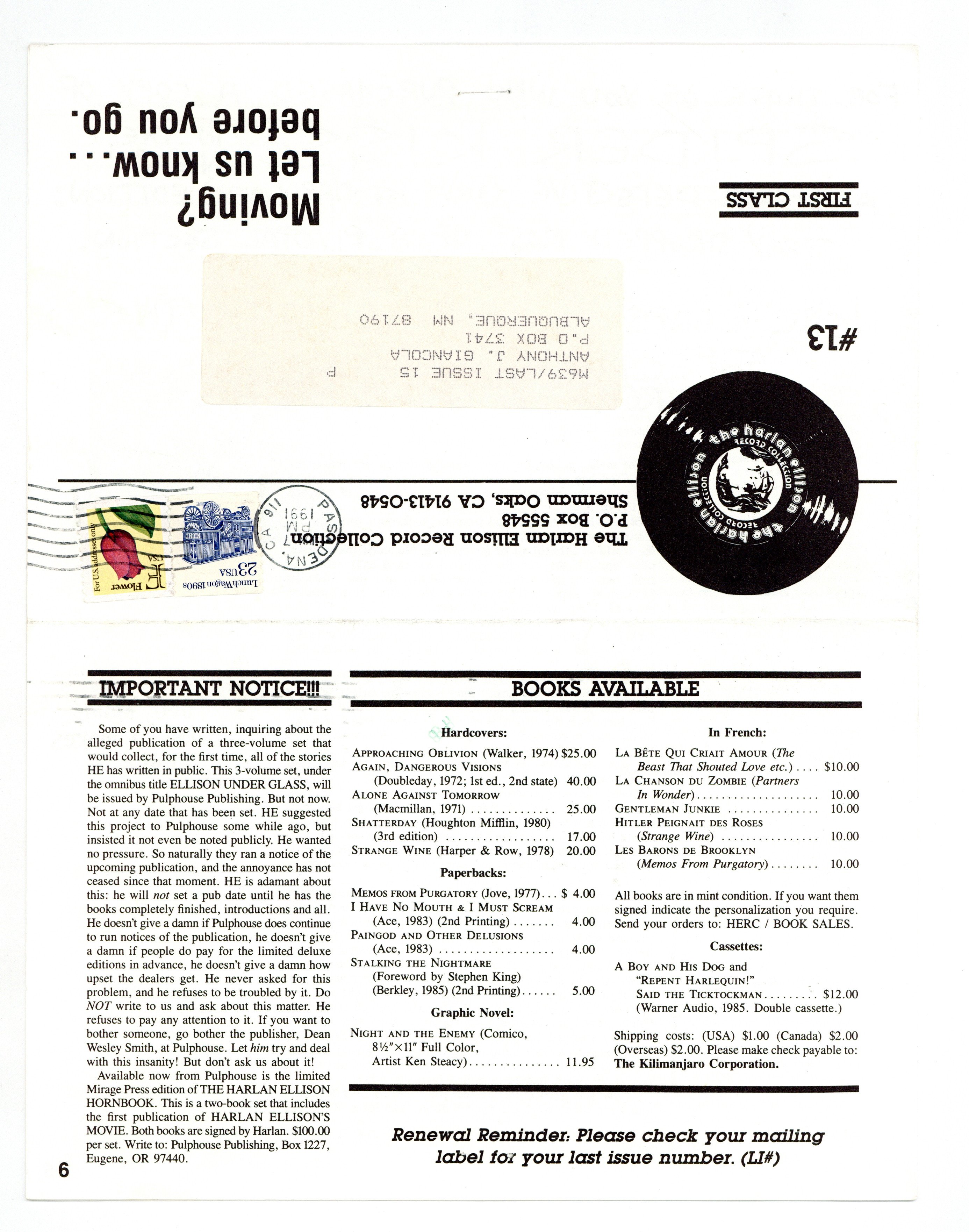Published Mar 1991 by Kilimanjaro Corporation.$36.00Vol. 4, No. 1 - Whole Number 13. Spring 1991. Newsletter of The Harlan Ellison Record Collection. Originally created as a means to promote Harlan's audio recordings to his fans, it also gave him the opportunity to sell books from his back list, offer updates on projects, the occasional essay, scheduled appearances, publication schedules, and Harlan's ever present opinions on...everything. Is there consistency through the issues? Only in that they offer a relaxed review of All Things Ellison. 8.5" x 11", 6 pages, B&W Cover price $1.75.