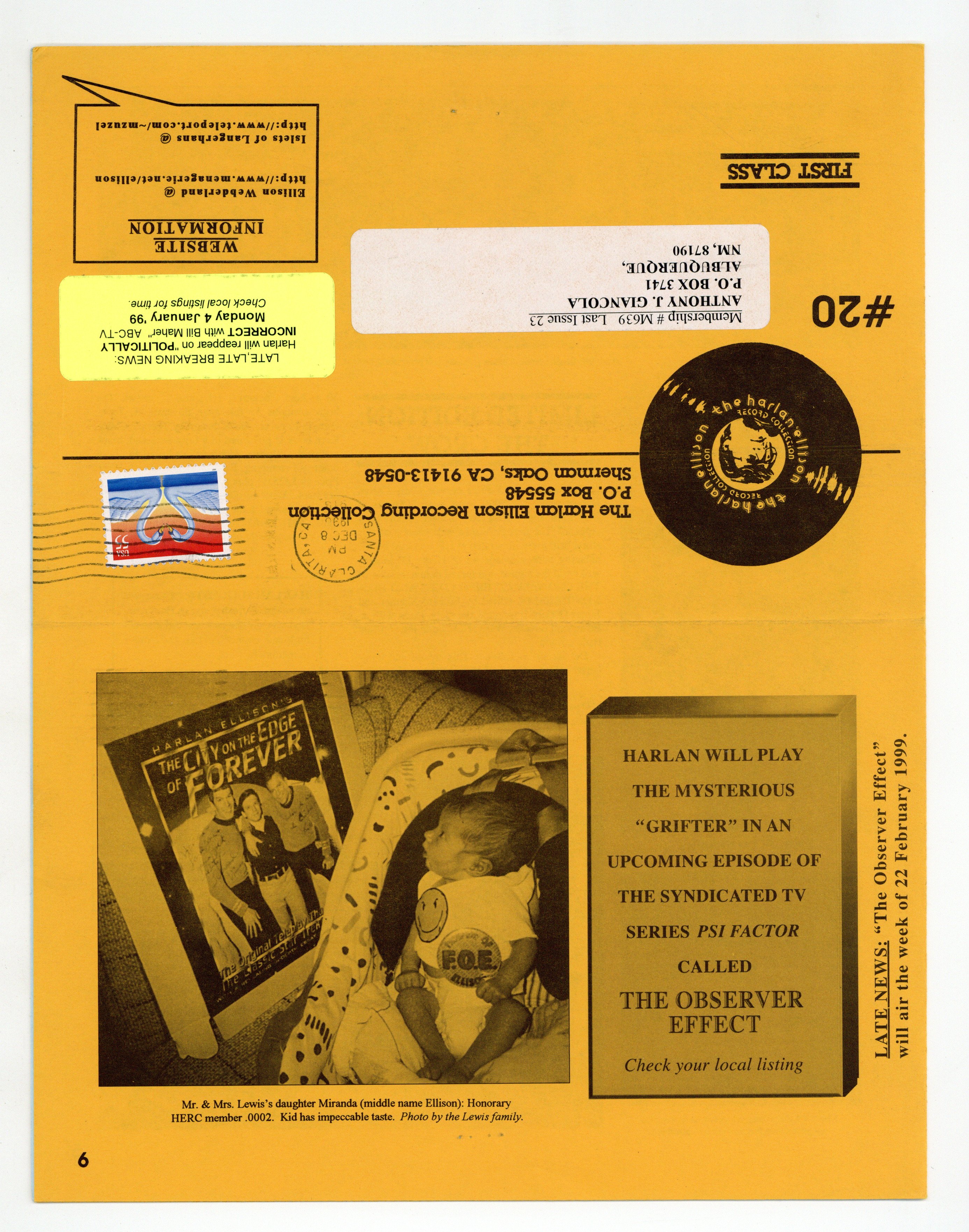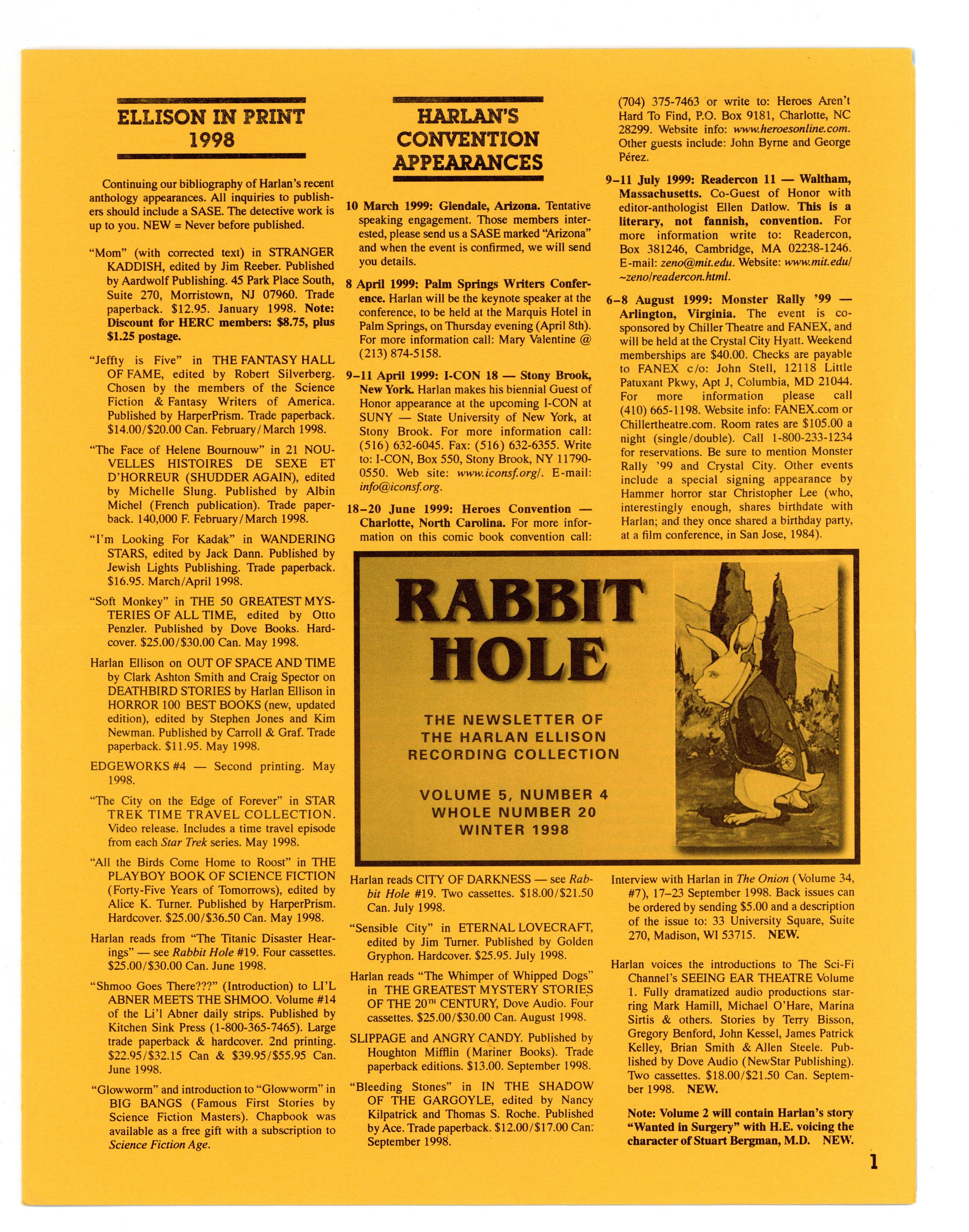 Published Dec 1998 by Kilimanjaro Corporation.$24.00Vol. 5, No. 4 - Whole Number 20. Winter 1998. Newsletter of The Harlan Ellison Record Collection. Originally created as a means to promote Harlan's audio recordings to his fans, it also gave him the opportunity to sell books from his back list, offer updates on projects, the occasional essay, scheduled appearances, publication schedules, and Harlan's ever present opinions on...everything. Is there consistency through the issues? Only in that they offer a relaxed review of All Things Ellison. 8.5" x 11", 6 pages, B&W Cover price $2.00.