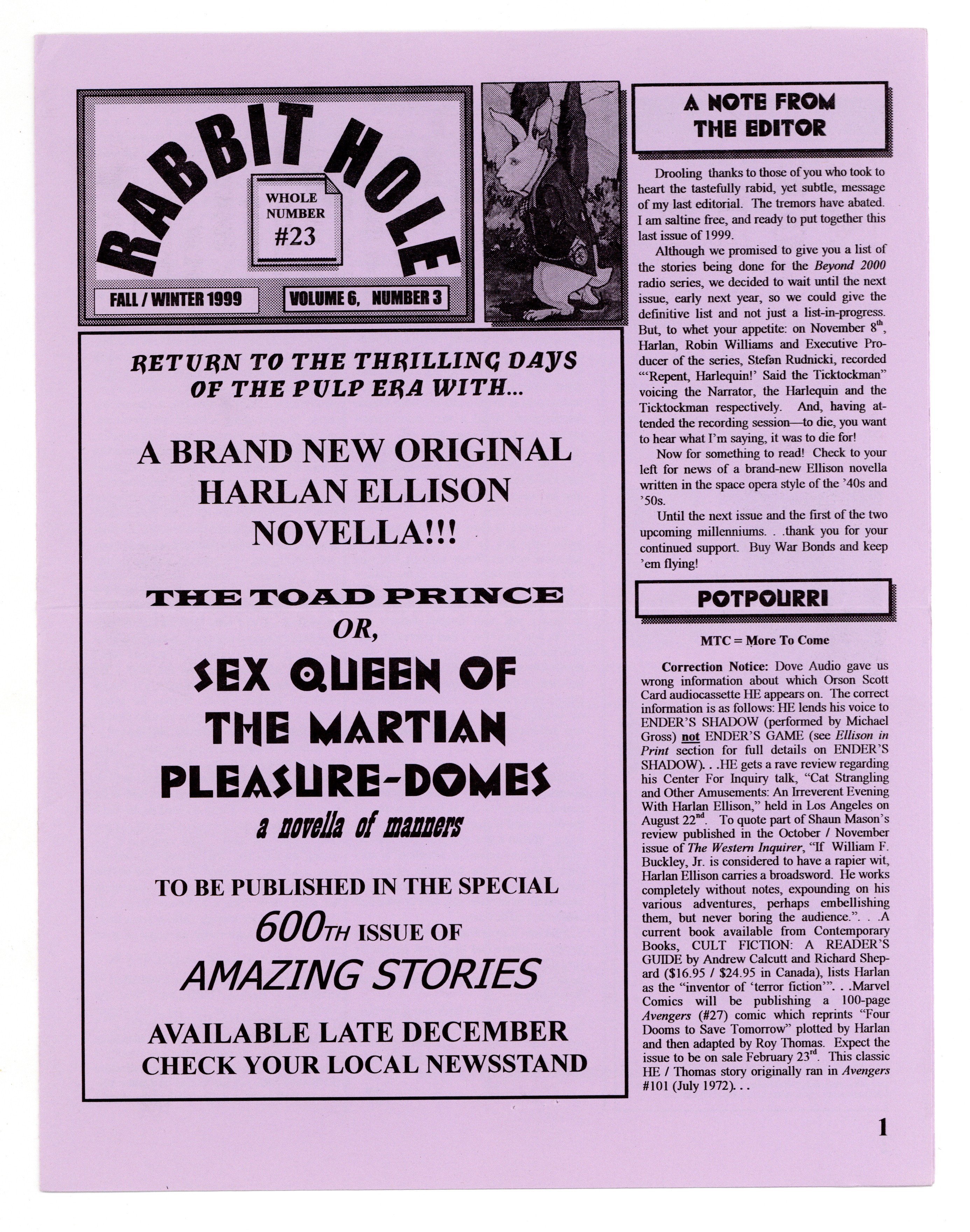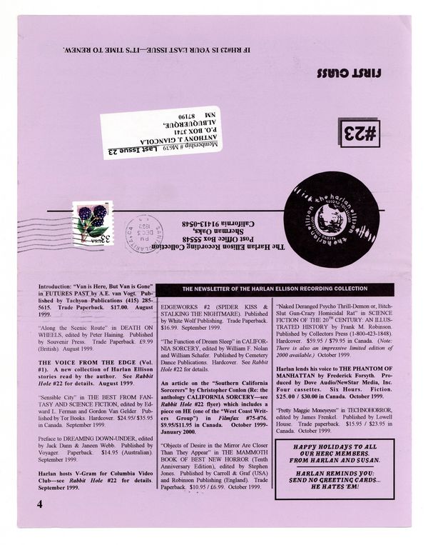 Published Dec 1999 by Kilimanjaro Corporation.$24.00Vol. 6, No. 3 - Whole Number 23. Fall/Winter 1999. Newsletter of The Harlan Ellison Record Collection. Originally created as a means to promote Harlan's audio recordings to his fans, it also gave him the opportunity to sell books from his back list, offer updates on projects, the occasional essay, scheduled appearances, publication schedules, and Harlan's ever present opinions on...everything. Is there consistency through the issues? Only in that they offer a relaxed review of All Things Ellison. 8.5" x 11", 6 pages, B&W Cover price $2.00.