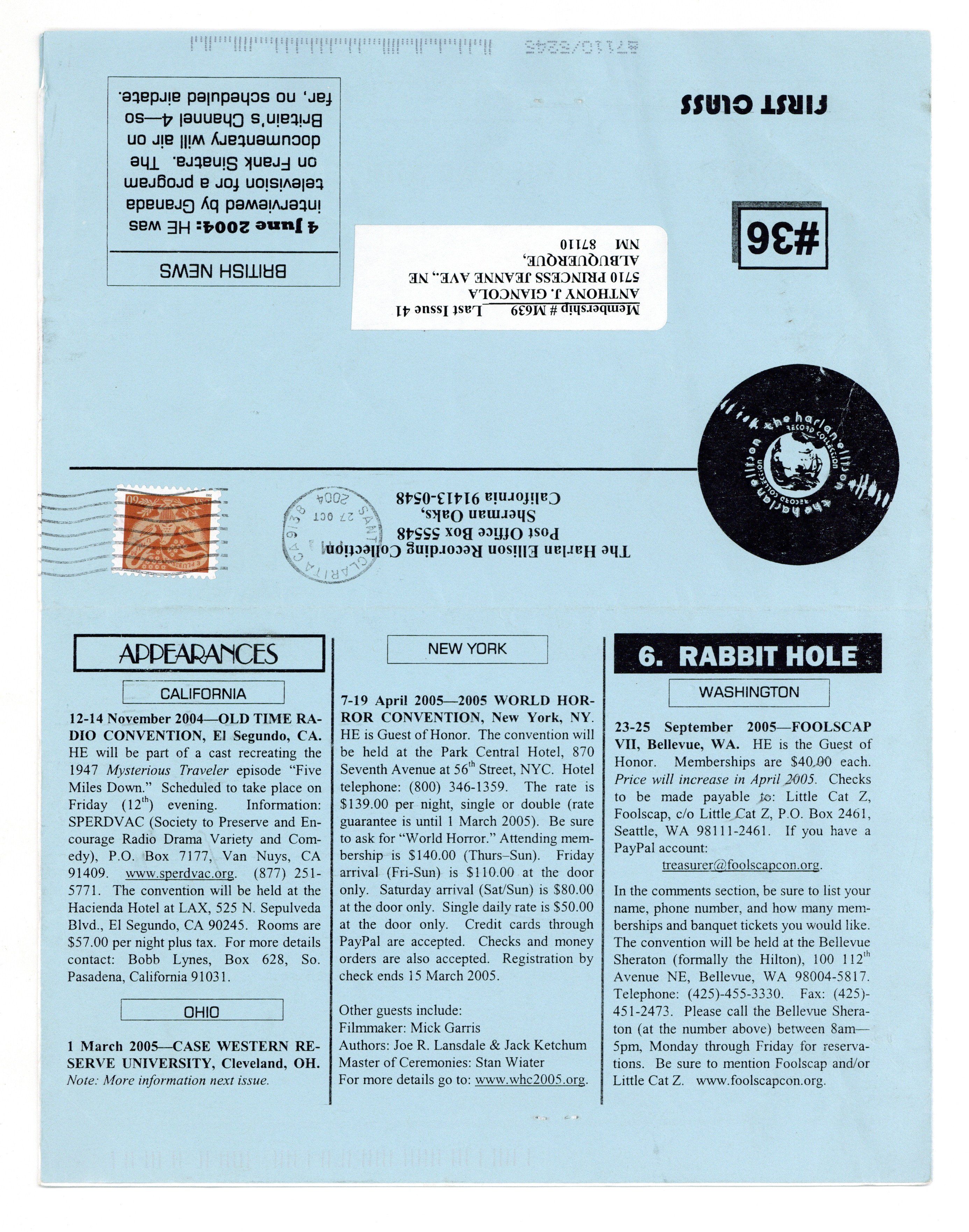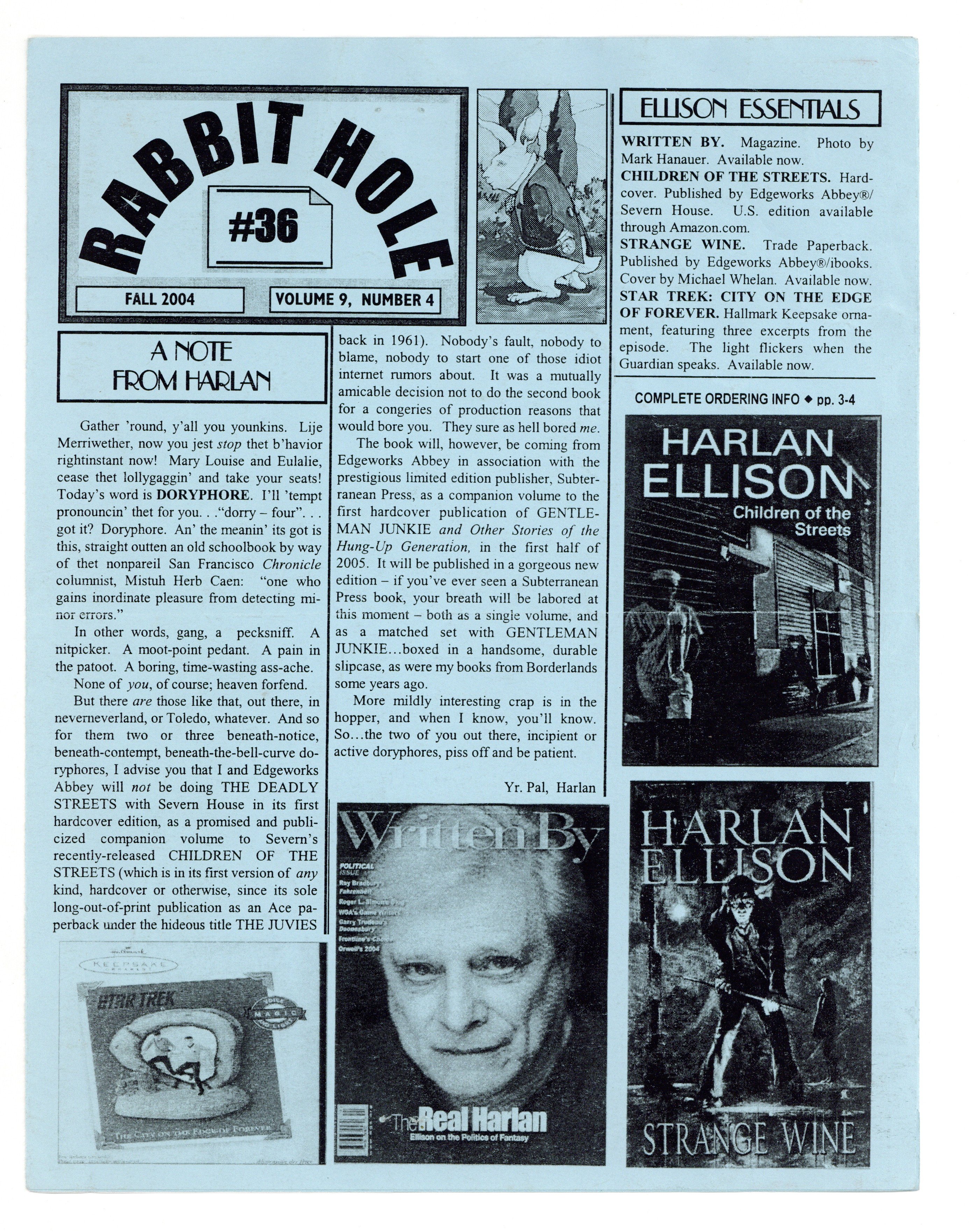 Published Sep 2004 by Kilimanjaro Corporation.$18.00Vol. 9, No. 4 - Whole Number 36. Fall 2004. Newsletter of The Harlan Ellison Record Collection. Originally created as a means to promote Harlan's audio recordings to his fans, it also gave him the opportunity to sell books from his back list, offer updates on projects, the occasional essay, scheduled appearances, publication schedules, and Harlan's ever present opinions on...everything. Is there consistency through the issues? Only in that they offer a relaxed review of All Things Ellison. 8.5" x 11", 6 pages, B&W Cover price $2.50.