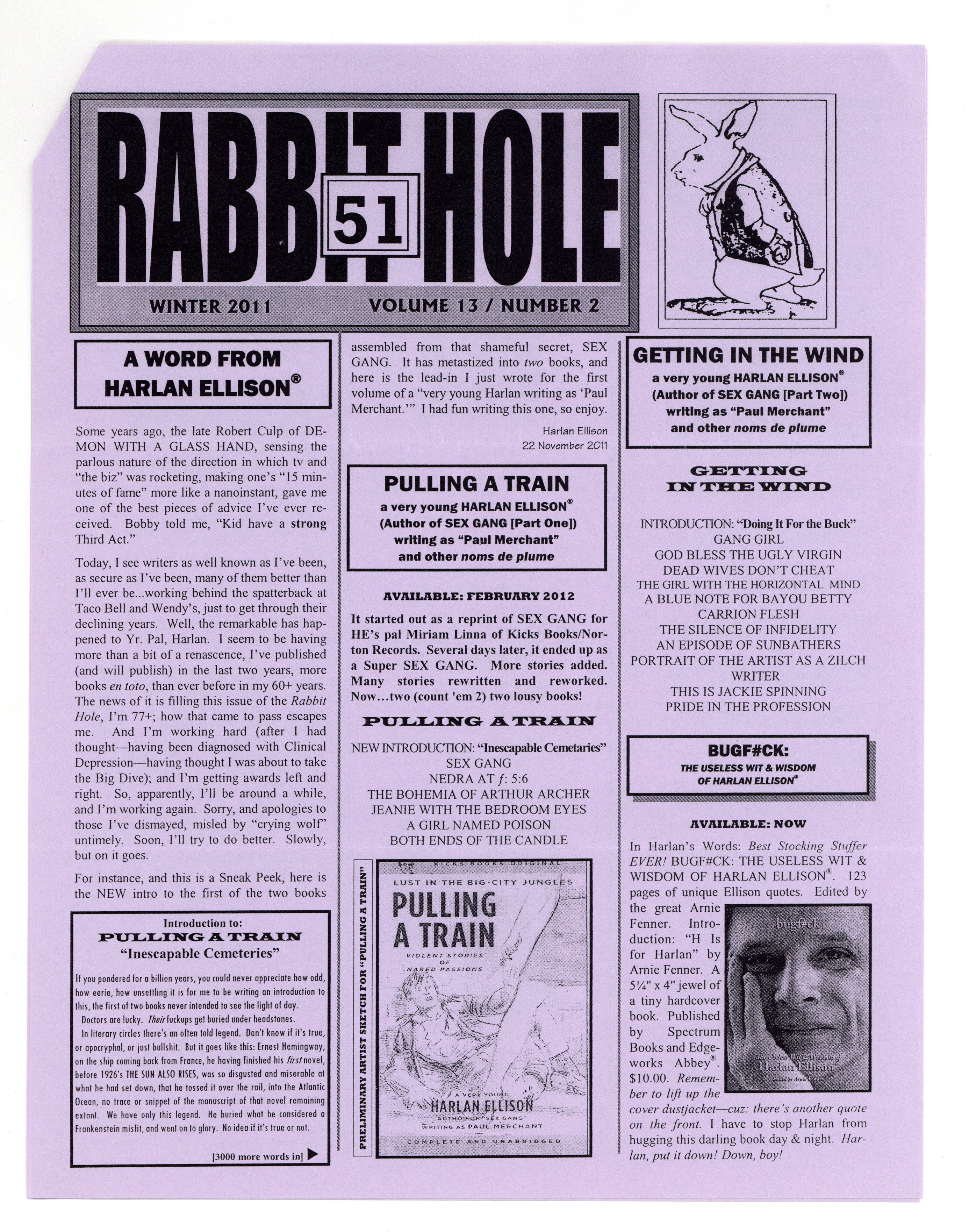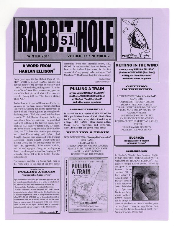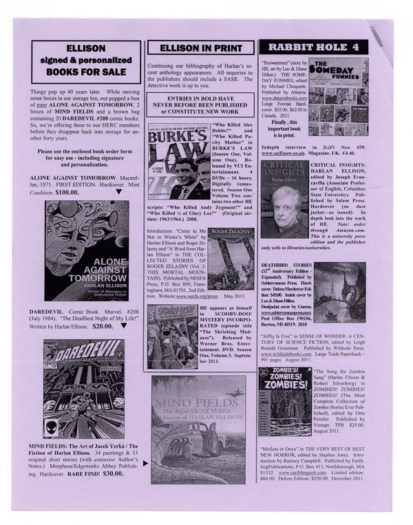 Published Dec 2011 by Kilimanjaro Corporation.$18.00Vol. 13, No. 2 - Whole Number 51. Winter 2011. Newsletter of The Harlan Ellison Record Collection. Originally created as a means to promote Harlan's audio recordings to his fans, it also gave him the opportunity to sell books from his back list, offer updates on projects, the occasional essay, scheduled appearances, publication schedules, and Harlan's ever present opinions on...everything. Is there consistency through the issues? Only in that they offer a relaxed review of All Things Ellison. 8.5" x 11", 6 pages, B&W Cover price $3.50.
