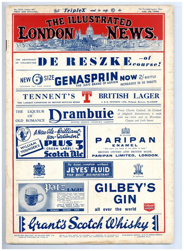 Vol. 189, No. 5074 - July 18, 1936. UK weekly magazine notable to being the worlds first illustrated news magazine. Page counts vary from issue to issue. Page counts may be unconfirmed. May or may not include cover page. 10.25" x 14.5", 48 pages, B&W.